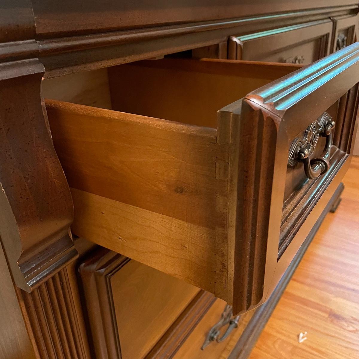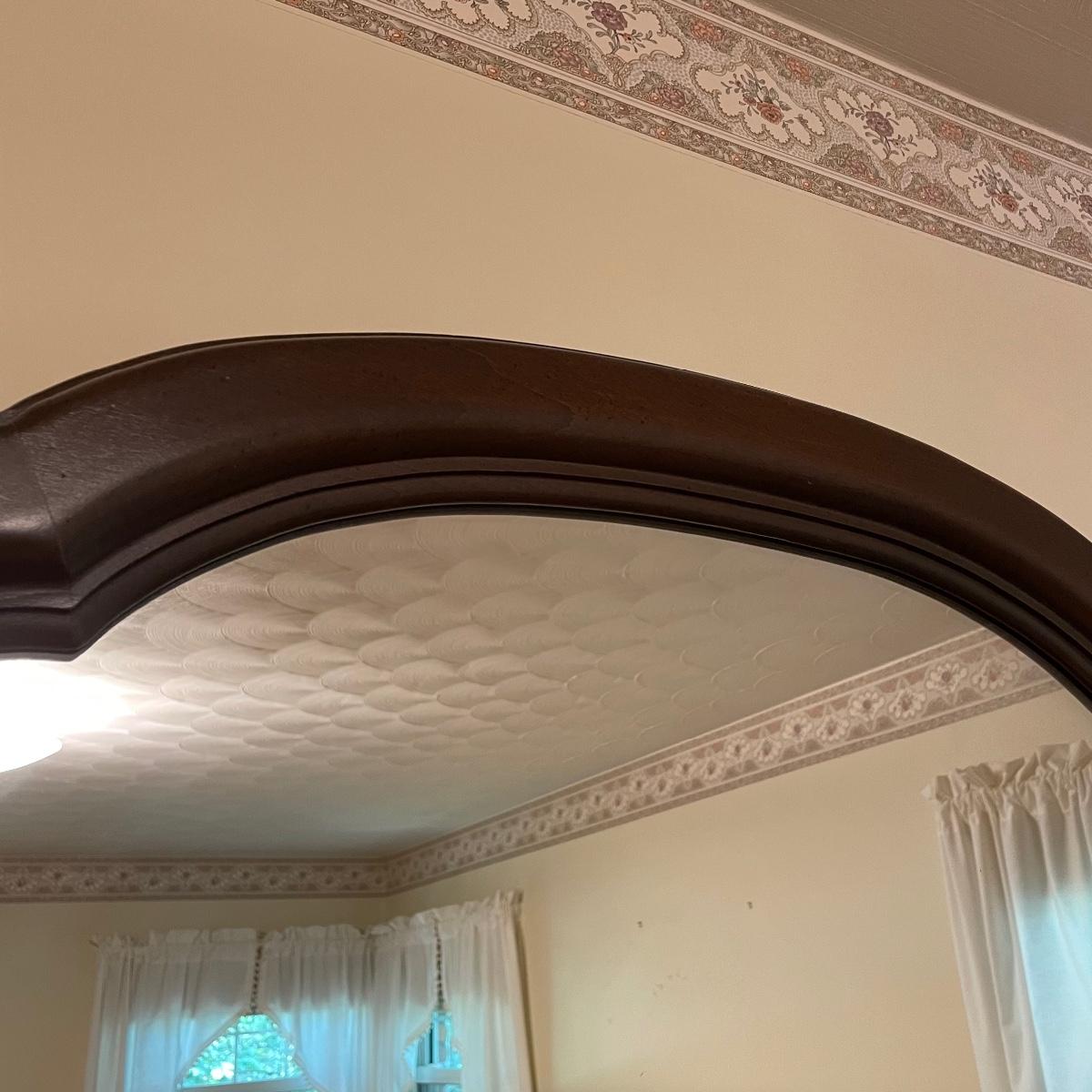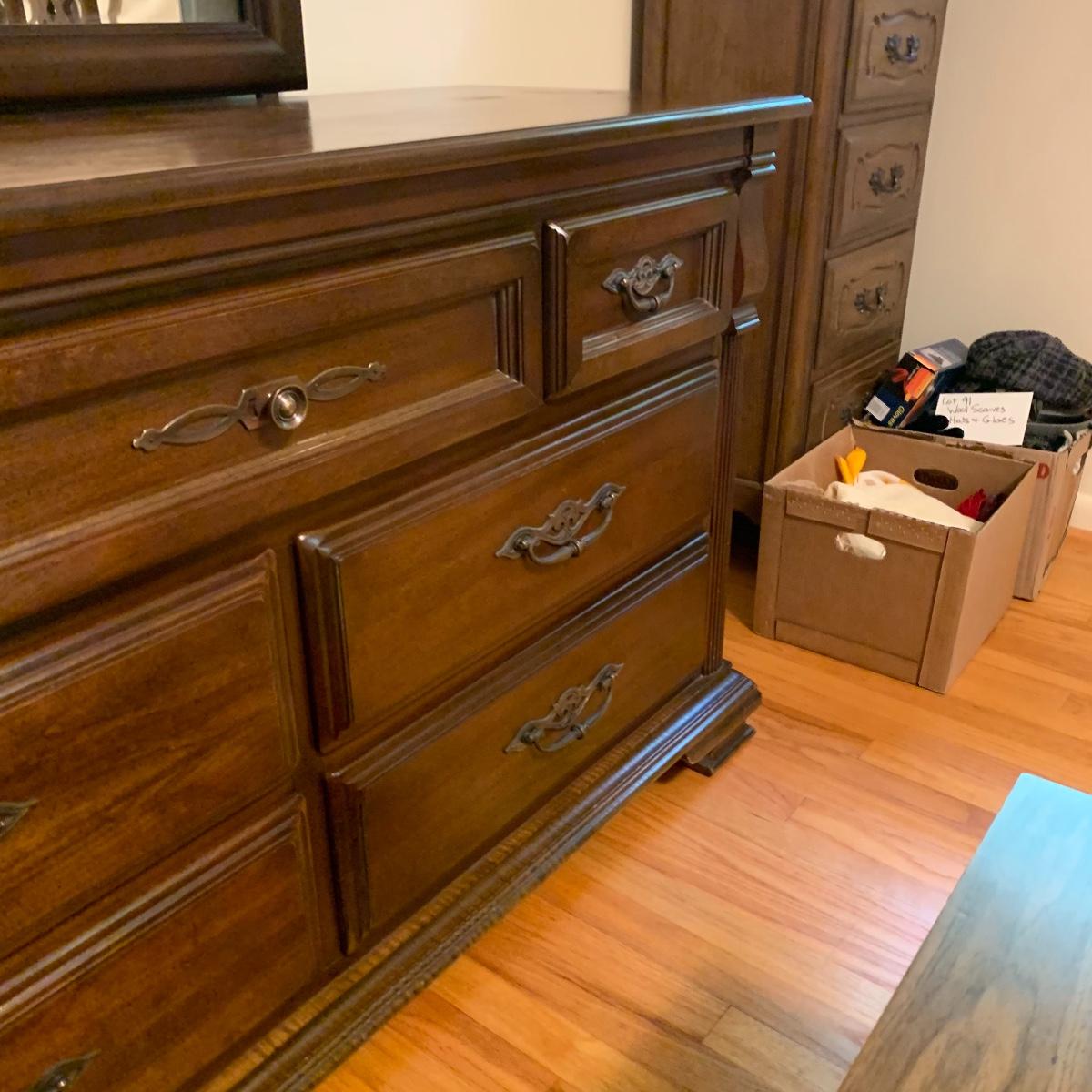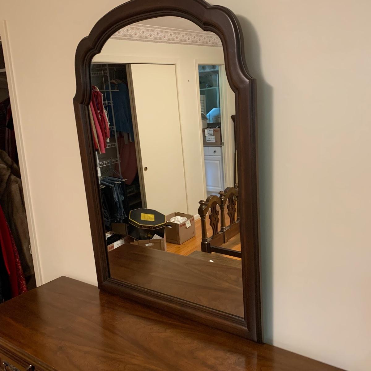 With a total of seven dovetail drawers, this dresser is mostly solid wood with some plywood on the back and drawers. It has a large attached mirror. The dresser itself is 4’8.5” x 1’7” x 2’8.5”. The height including the mirror is approximately 6’ 8”. The mirror is screwed in on the backside and is removable.