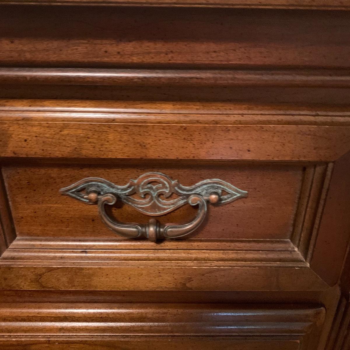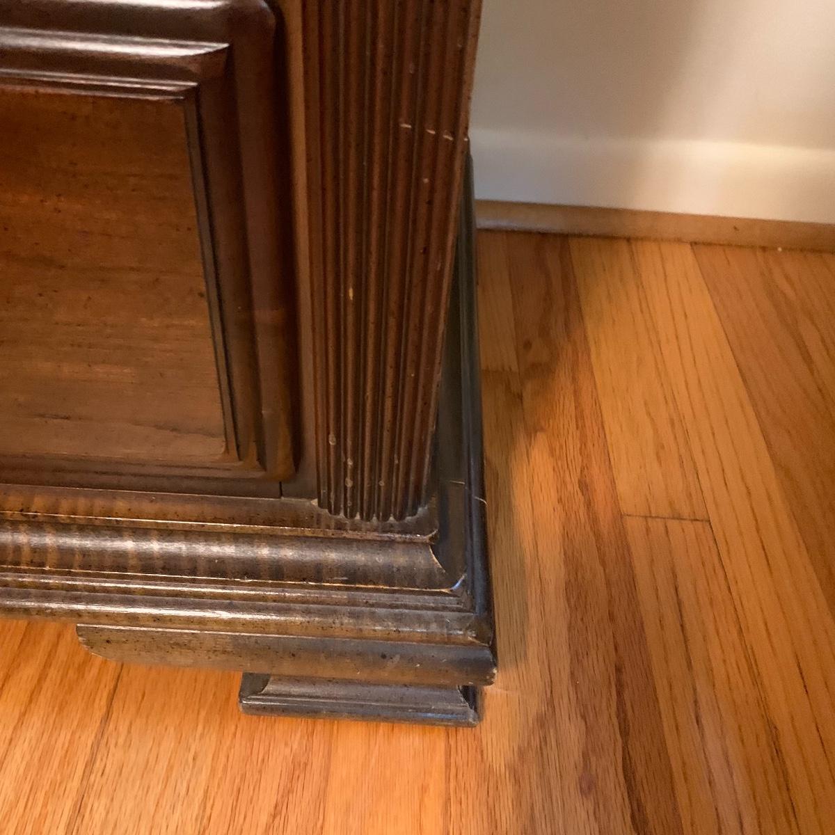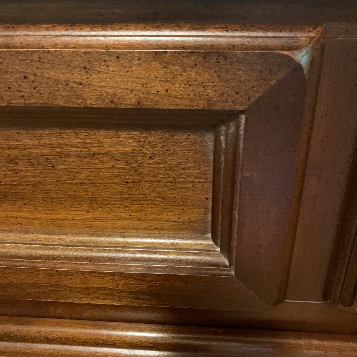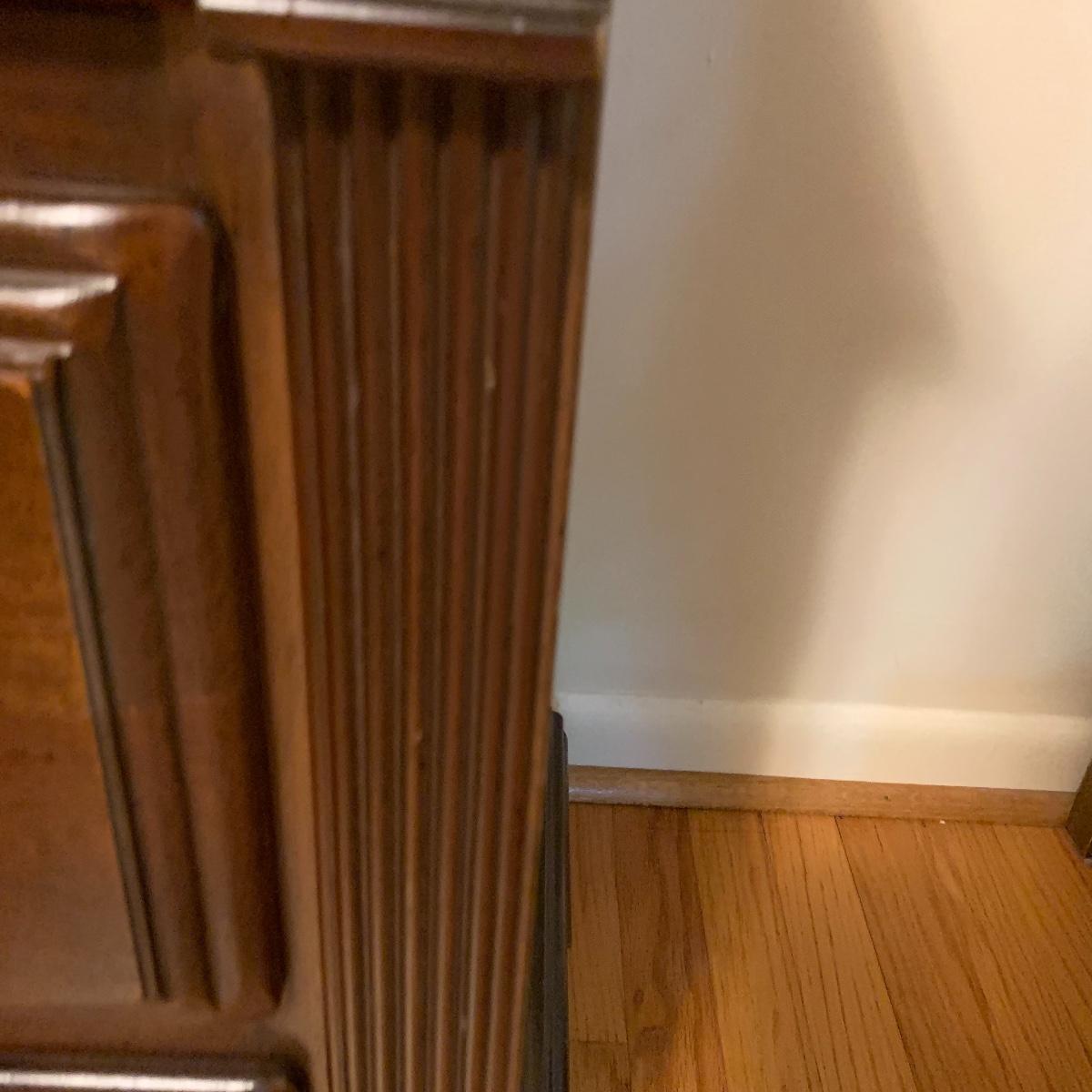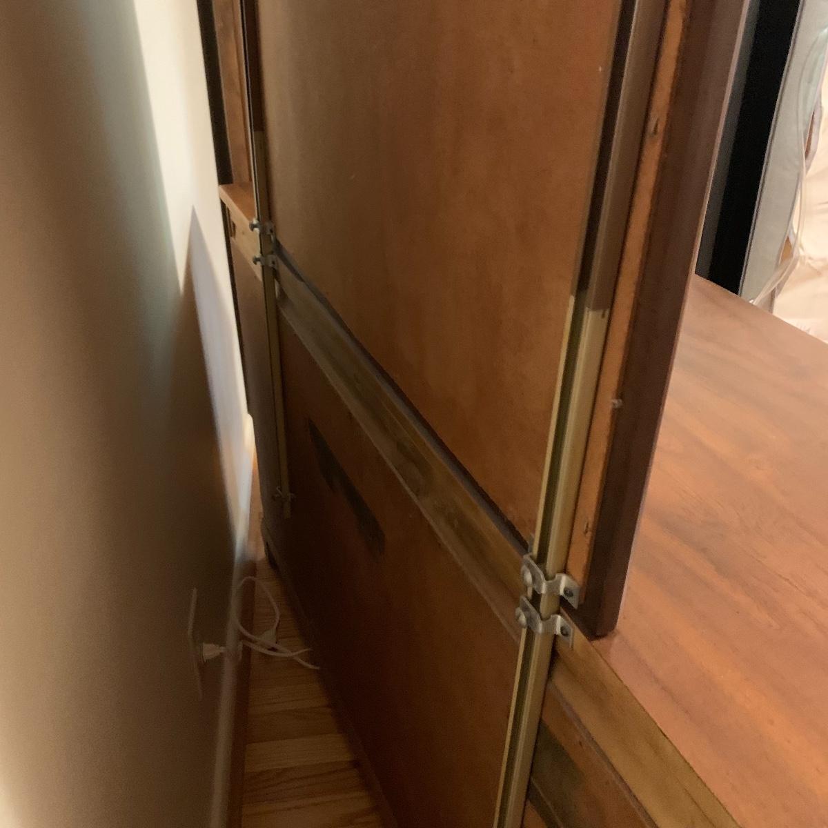 With a total of seven dovetail drawers, this dresser is mostly solid wood with some plywood on the back and drawers. It has a large attached mirror. The dresser itself is 4’8.5” x 1’7” x 2’8.5”. The height including the mirror is approximately 6’ 8”. The mirror is screwed in on the backside and is removable.