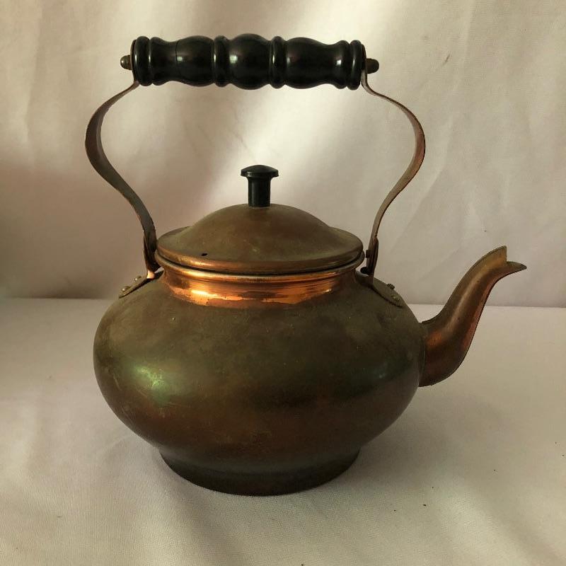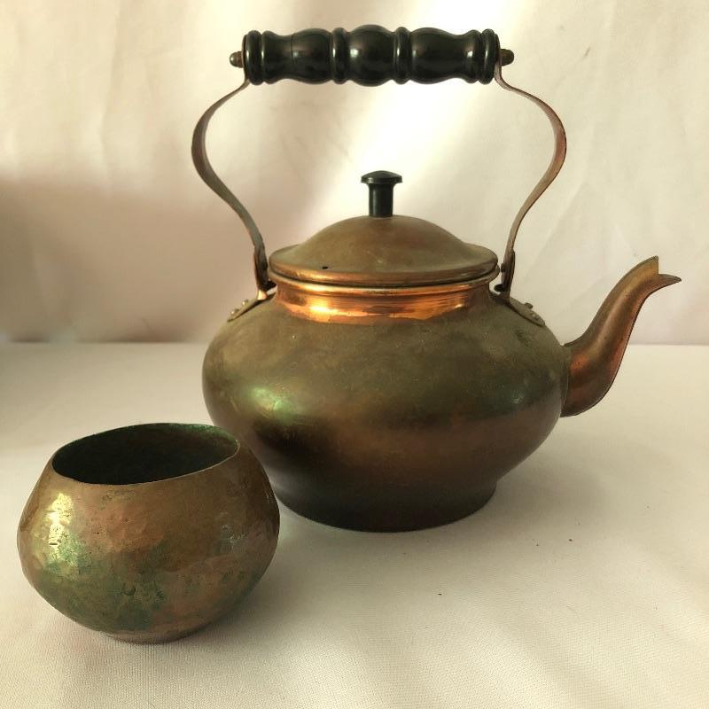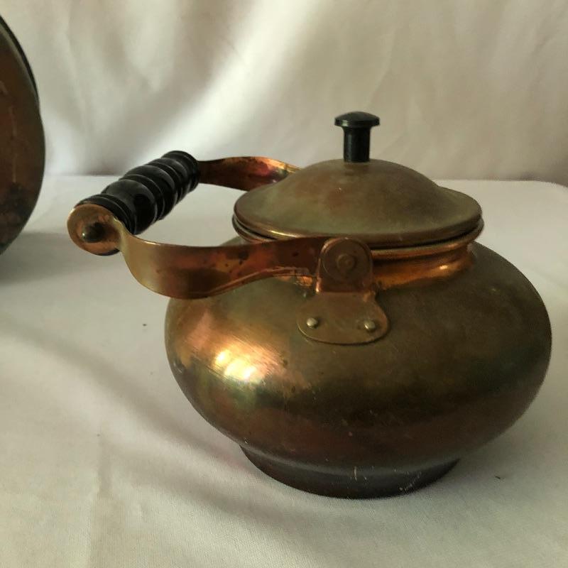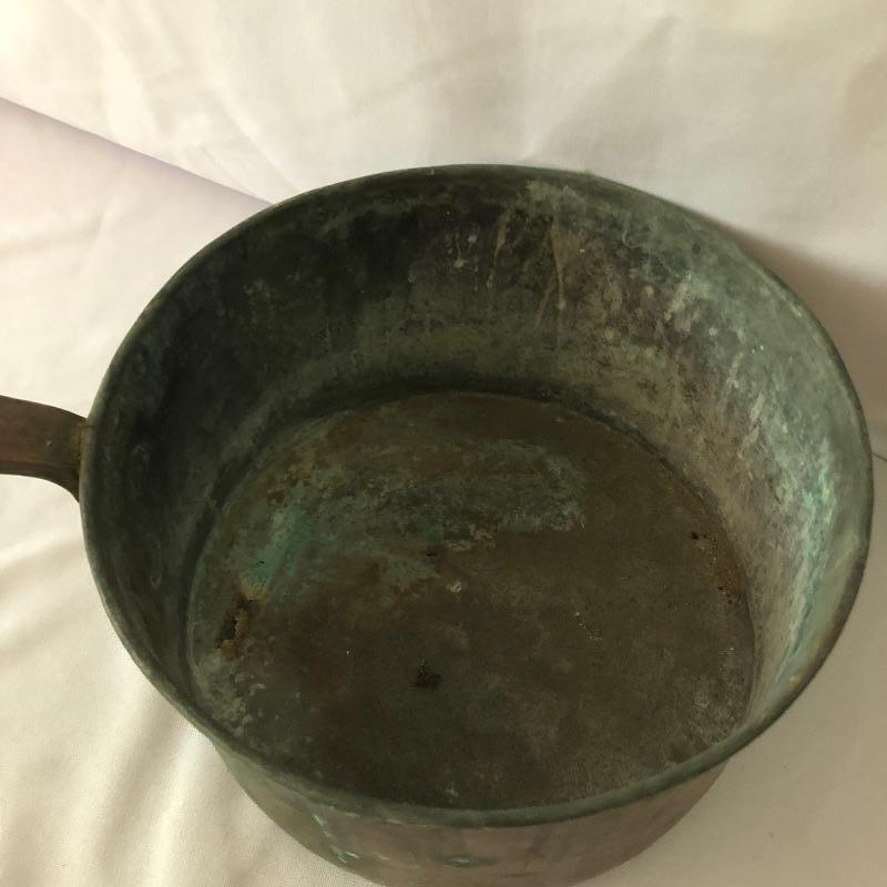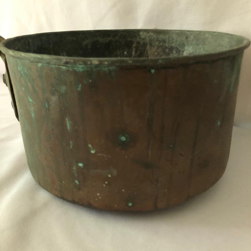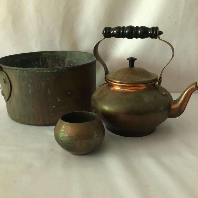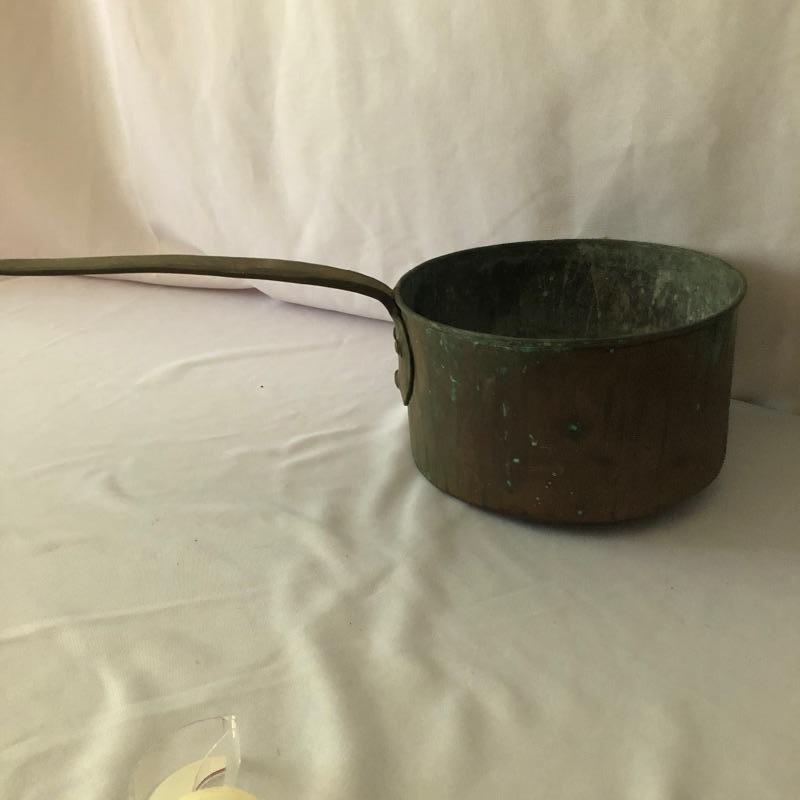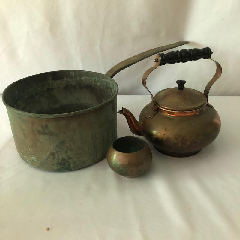 This vintage copper kettle has wonderful patina patterns throughout and will look great on display. We have added more copper items to round out this great lot that includes a small pot and a large saucepan all of them again have a wonderful patina for those who like that aged look or scrub them up to get that shiny copper look if you prefer.