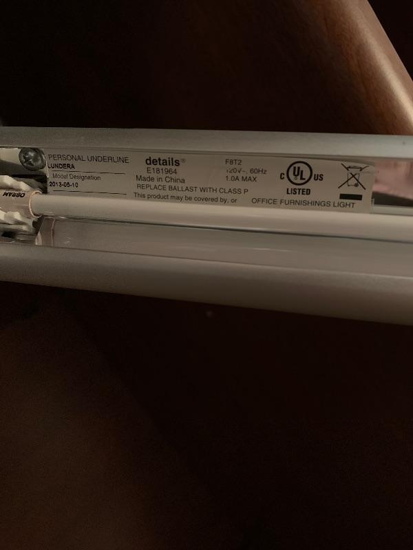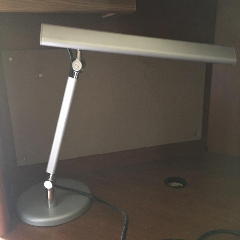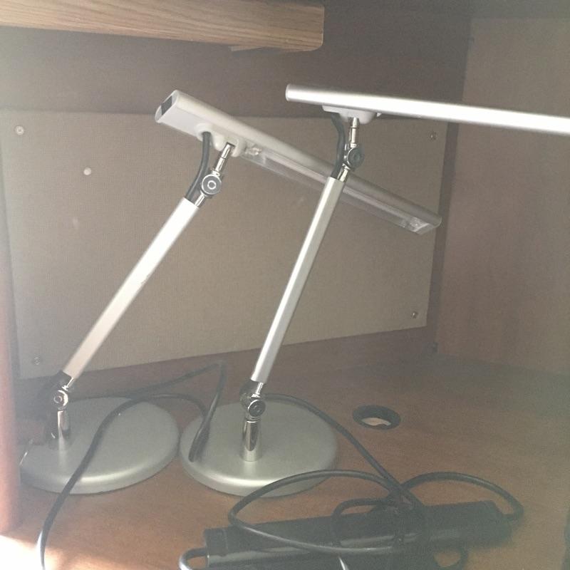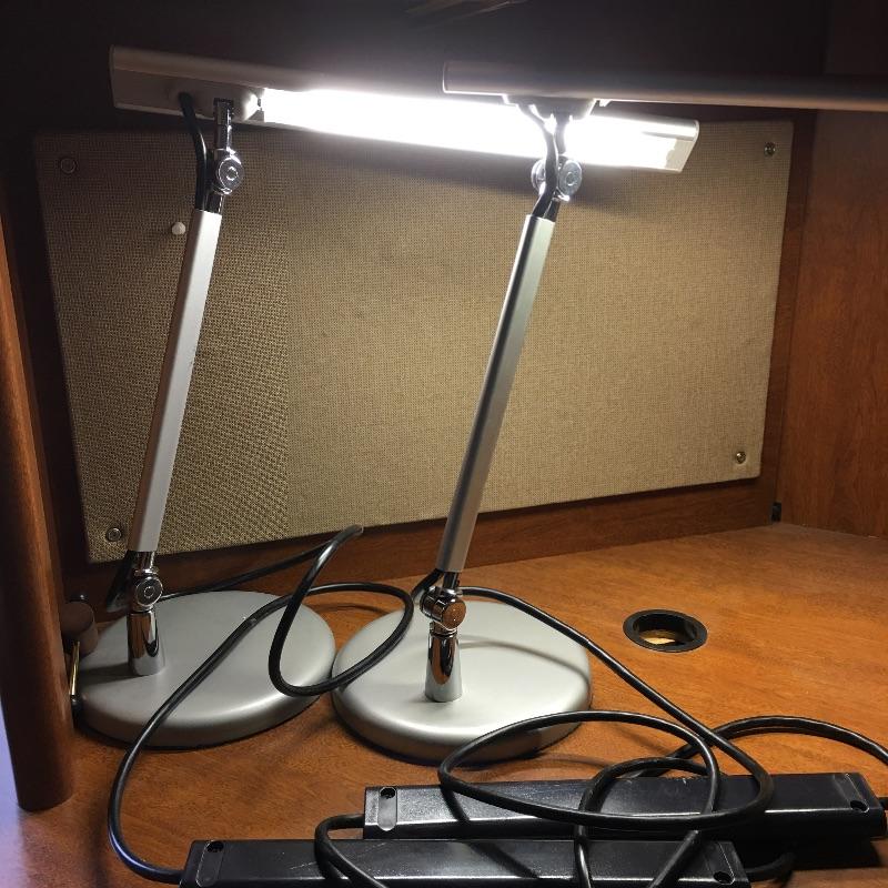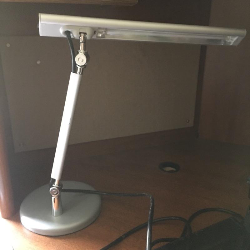 Trio of desk lamps. Lot includes three desk lamps with fluorescent bulbs. Two worked when tested and one is still new in box. A great way to light up your desk with these three adjustable lamps. Lamps measure 19.5” tall with a 17.75” wide light bar. Takes P light ballasts.