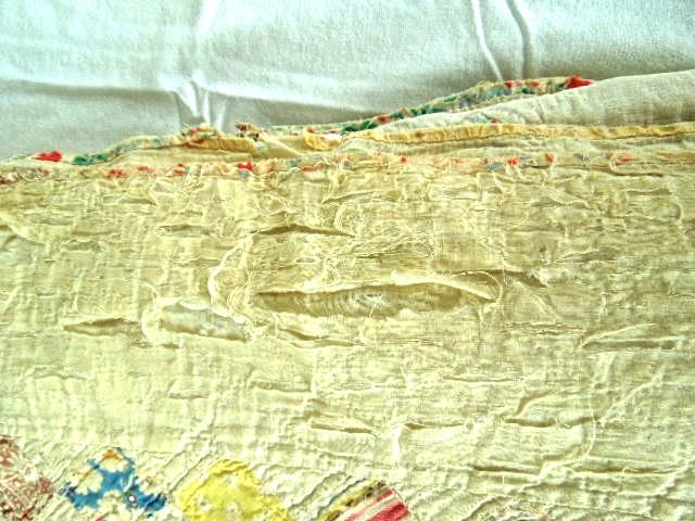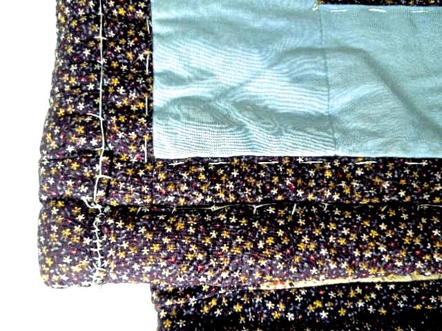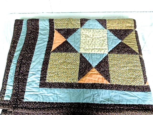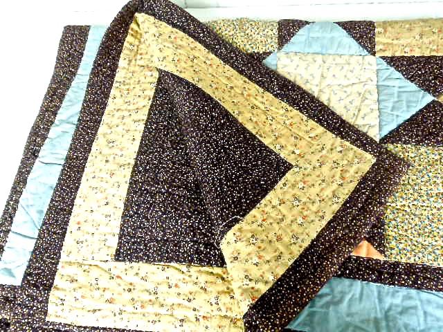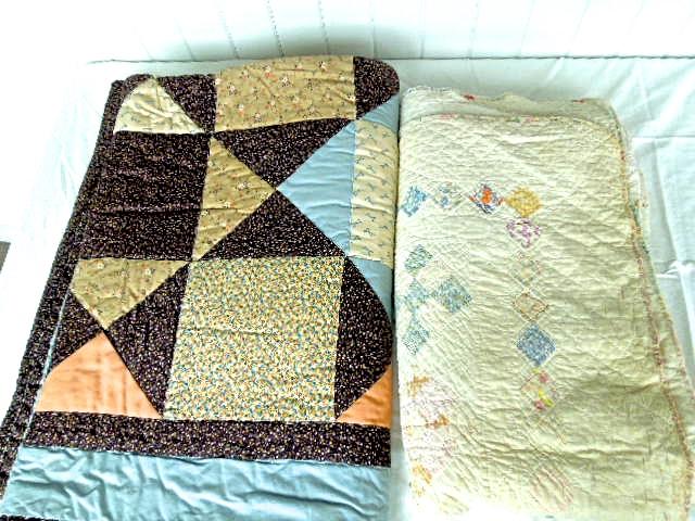 Two vintage handpieced cotton quilts. The white postage stamp quilt is made of muslin and feed sack. It is in very rough shape. Can be used for scrap craft projects. The brown, orange and blue star quilt is in good condition and is handquilted.