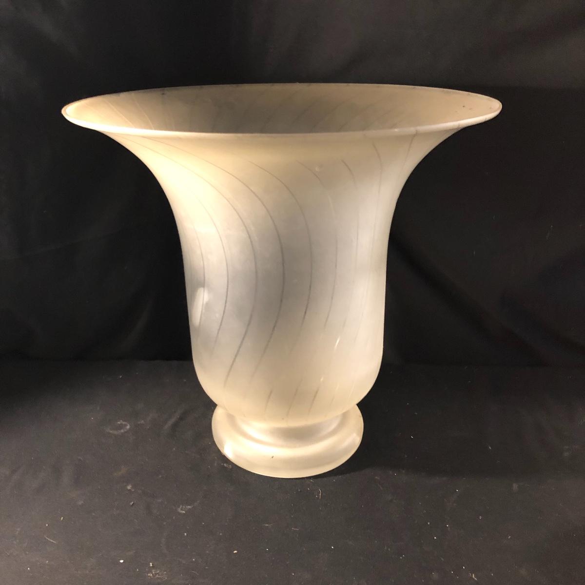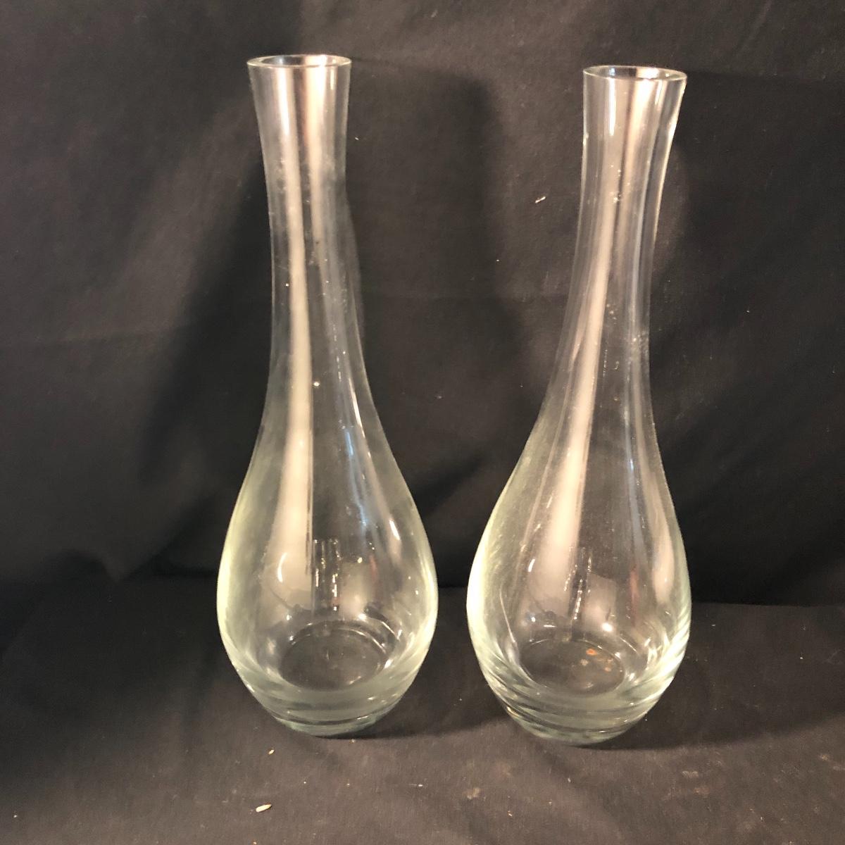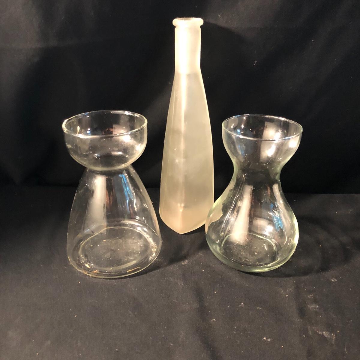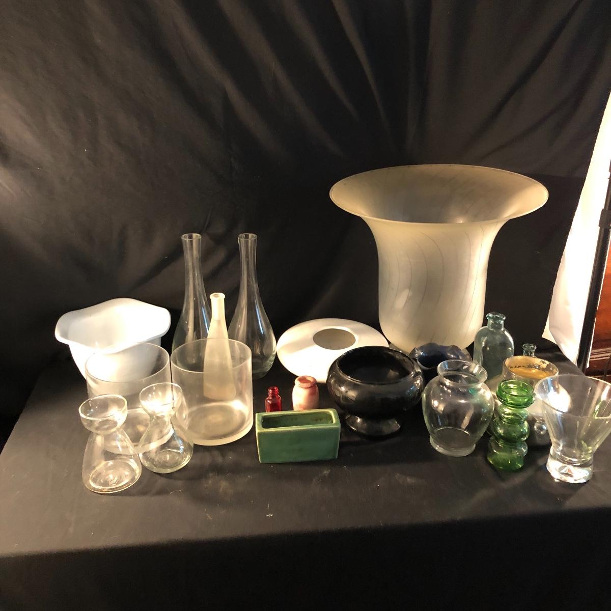 You can have flowers displayed all over your home with this large selection of vases. Lot includes large frosted glass vase, five glass bottle style vases, two large glass vases and four ceramic vases and more. Blue ceramic vase has chip, see pictures. Largest vase measures 17.5”D x 16.5” tall.