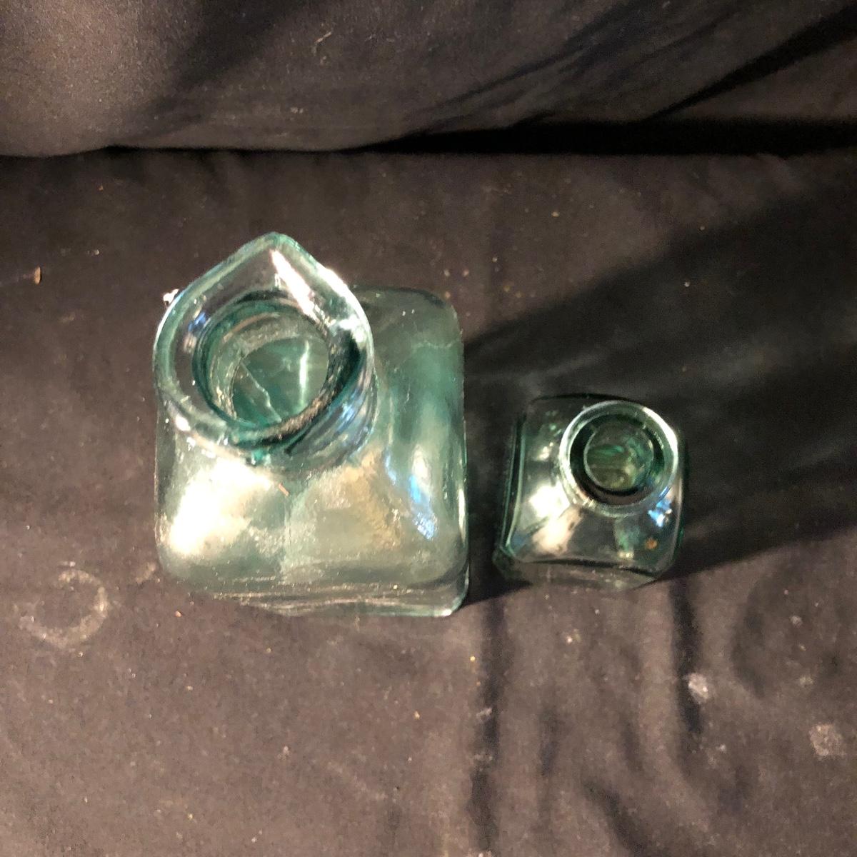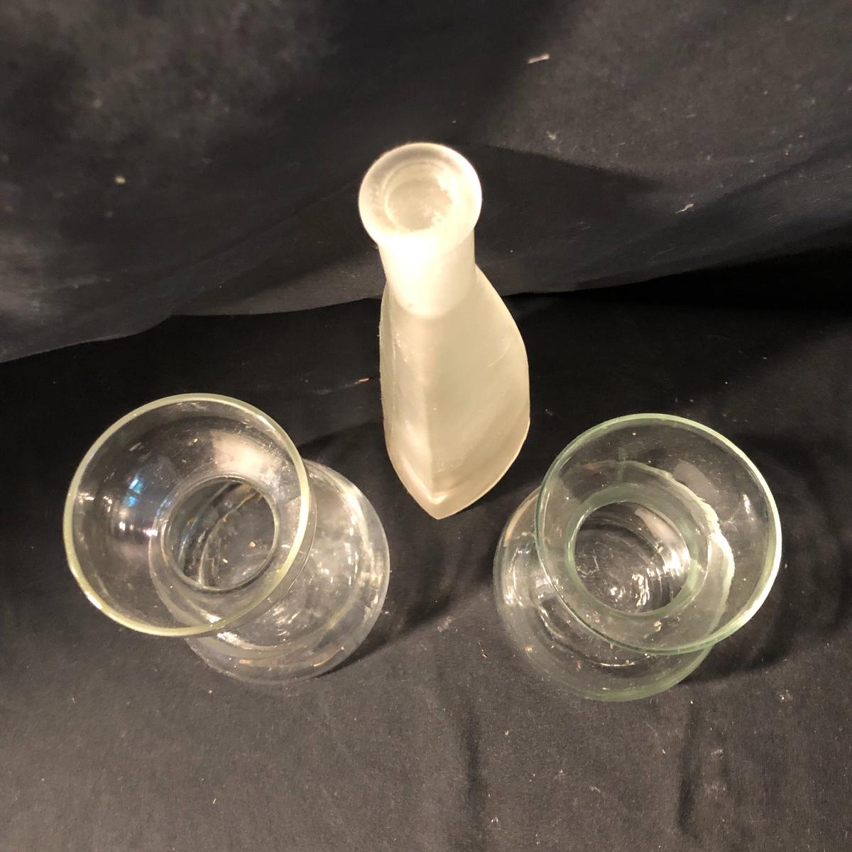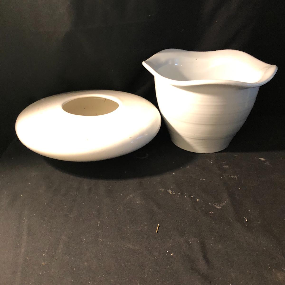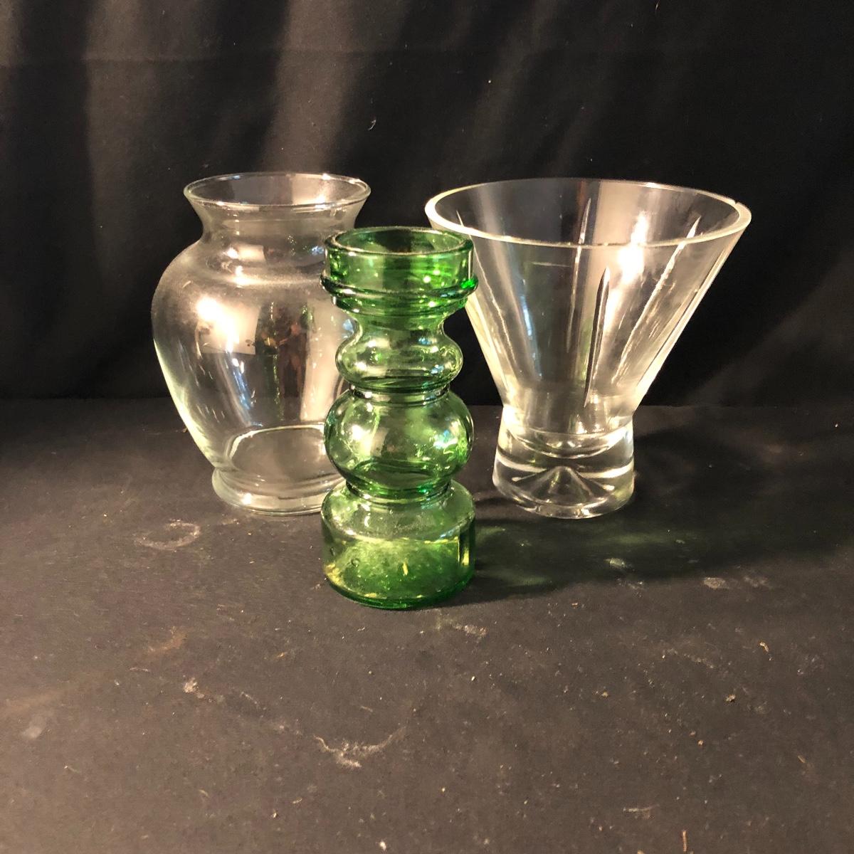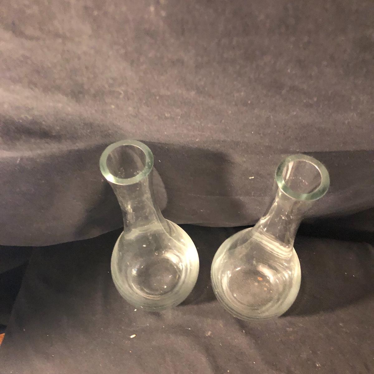 You can have flowers displayed all over your home with this large selection of vases. Lot includes large frosted glass vase, five glass bottle style vases, two large glass vases and four ceramic vases and more. Blue ceramic vase has chip, see pictures. Largest vase measures 17.5”D x 16.5” tall.