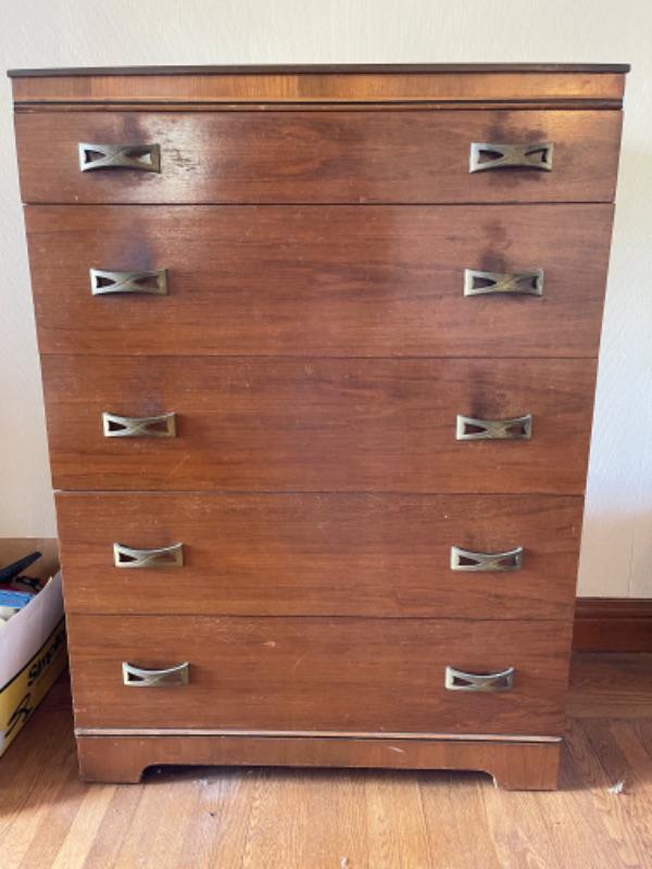 Lot 89. Vintage 1950s highboy “”5 drawers, walnut, metal handles,  35.5L x 19.25”D x 48.5”H--$65