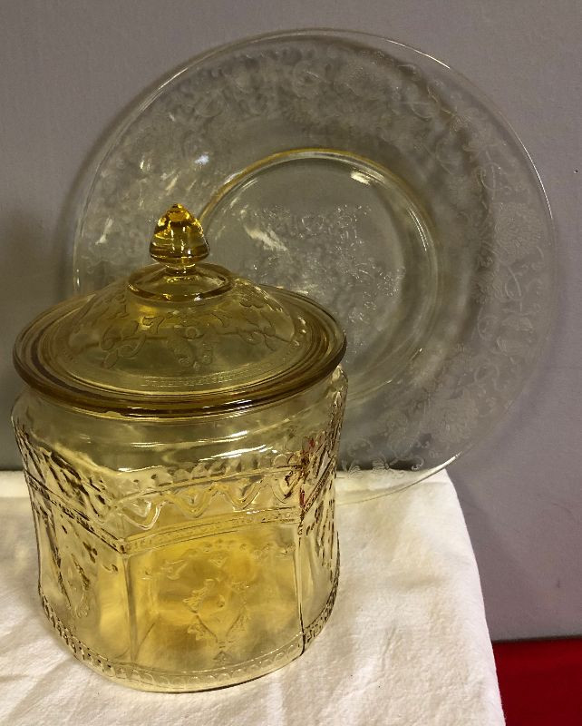 Lot 89 Yellow amber Depression Glass Cookie jar and Plate