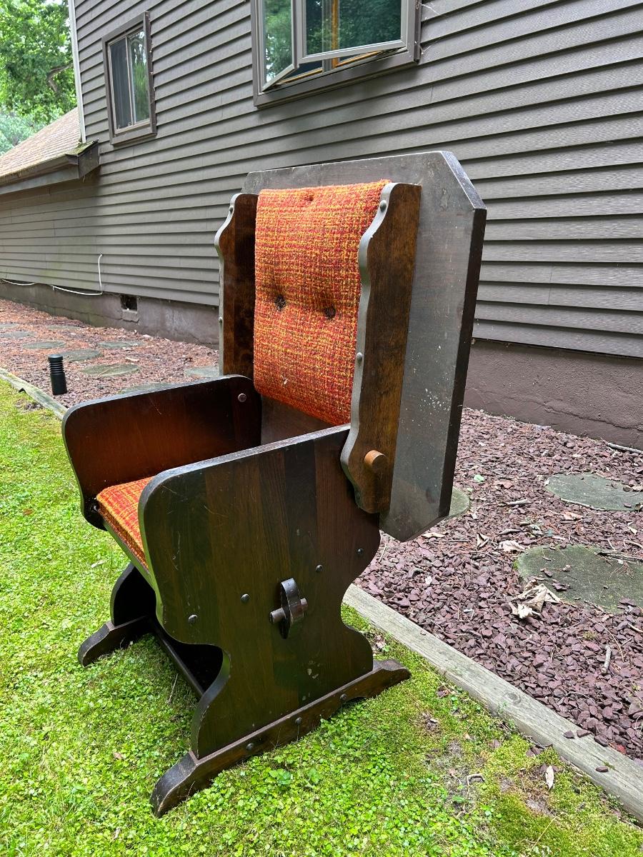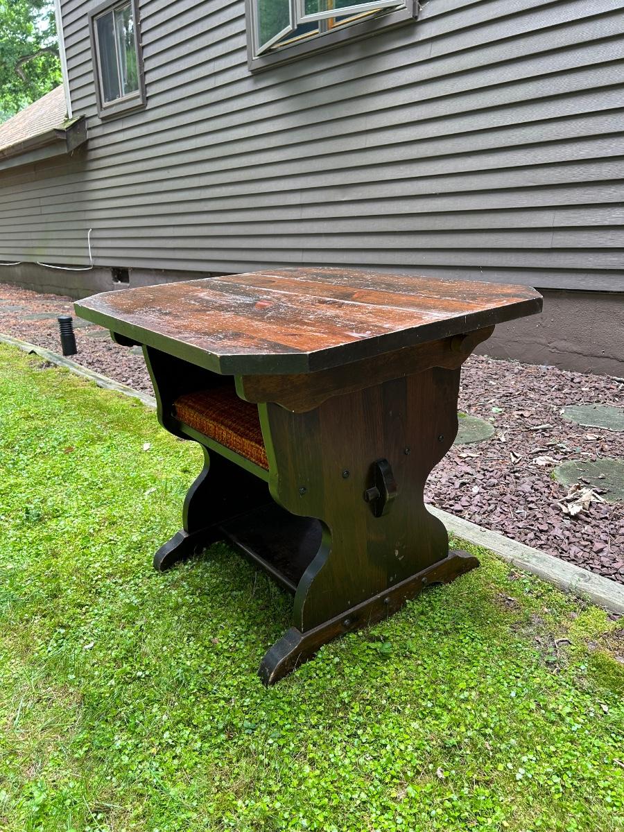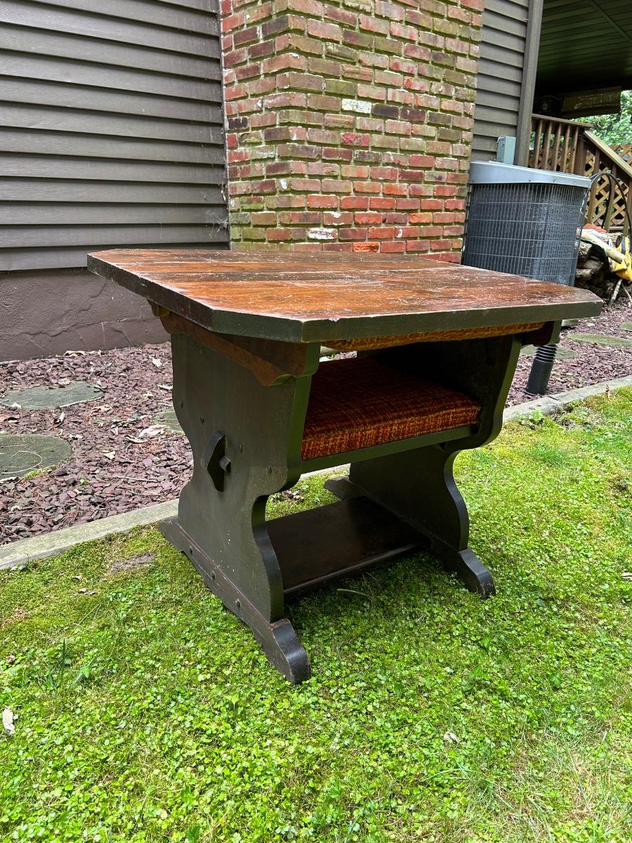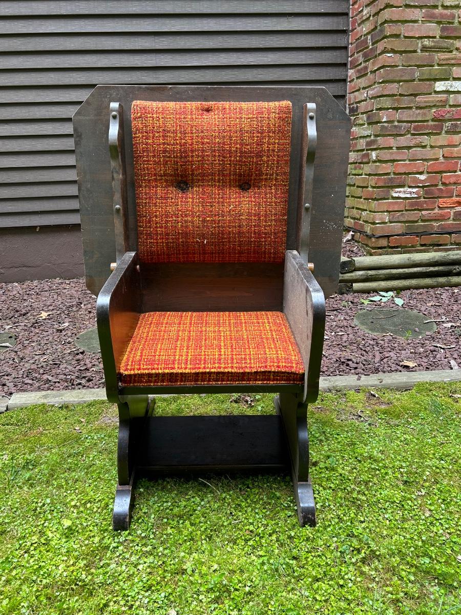 26”x34”x 27” Vintage Chair that turns into a table. Heavy wood frame. Please see all pictures as they are the best representation of the items. The pictures show condition, measurements if taken, and what is included in the lot. Due to the large amount that we photograph and the time frame, we are not always able to take measurements. All items unless noted, are pre-owned and have been used. If you purchased furniture, you must bring help. We do not allow one person to carry large furniture out on their own. Bring help, tools and a truck for the safety of our client’s homes, and your personal safety. Any damages that result to the property including walls, and floors due to moving of the furniture will be charged to the buyer. Company policy. Thank you.`q