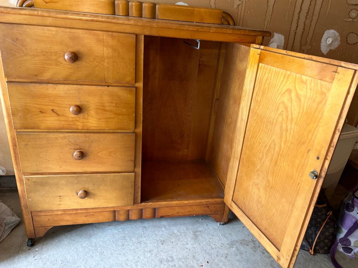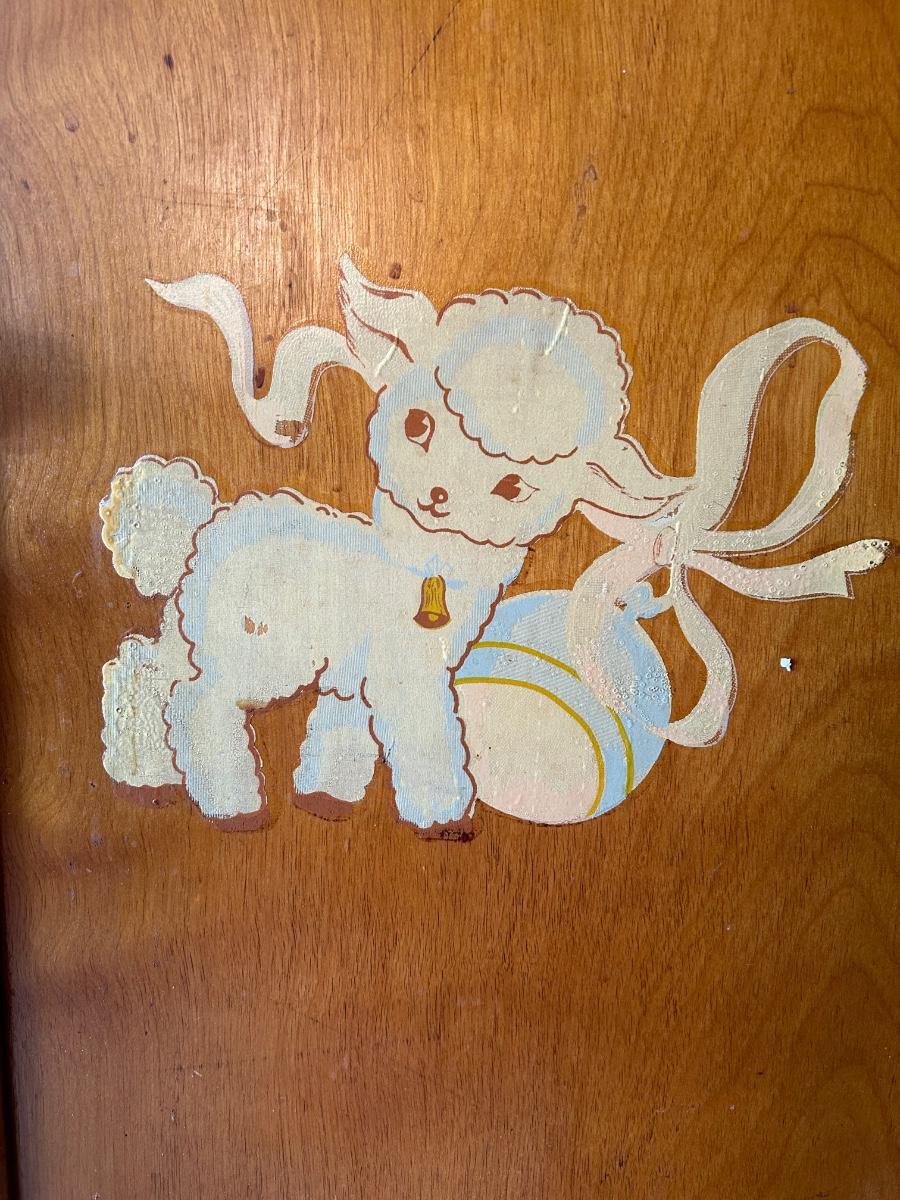40”x43”x 17” Baby Changing Table. Wood with Lamb detail. Four drawers and a cabinet. Lot includes vintage plastic crib mobile. Please see all pictures as they are the best representation of the items. The pictures show condition, measurements if taken, and what is included in the lot. Due to the large amount that we photograph and the time frame, we are not always able to take measurements. All items unless noted, are pre-owned and have been used. If you purchased furniture, you must bring help. We do not allow one person to carry large furniture out on their own. Bring help, tools and a truck for the safety of our client’s homes, and your personal safety. Any damages that result to the property including walls, and floors due to moving of the furniture will be charged to the buyer. Company policy. Thank you.