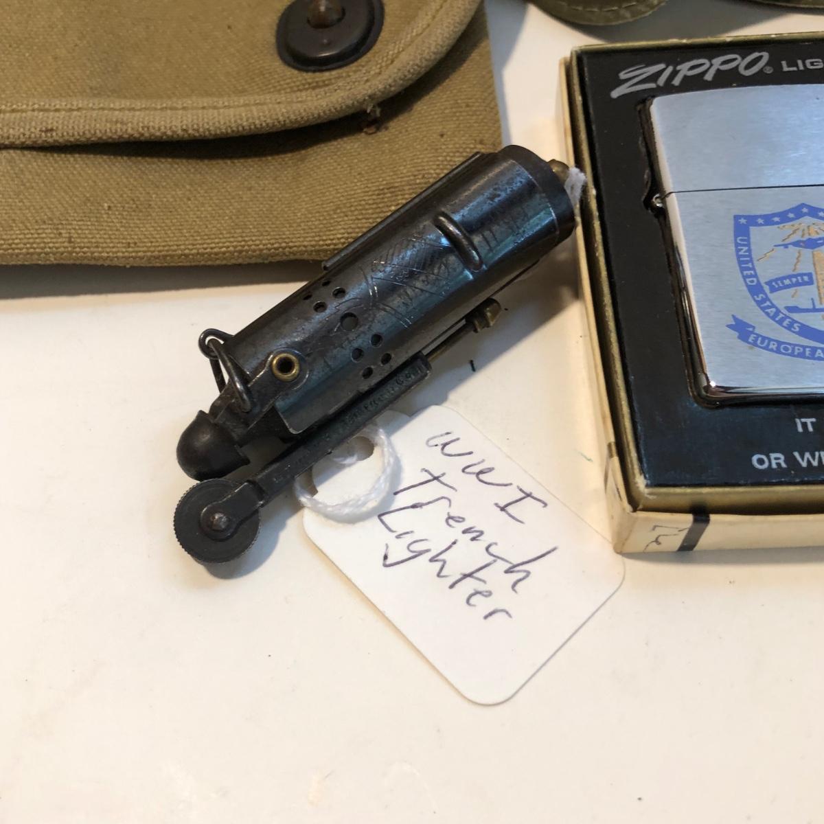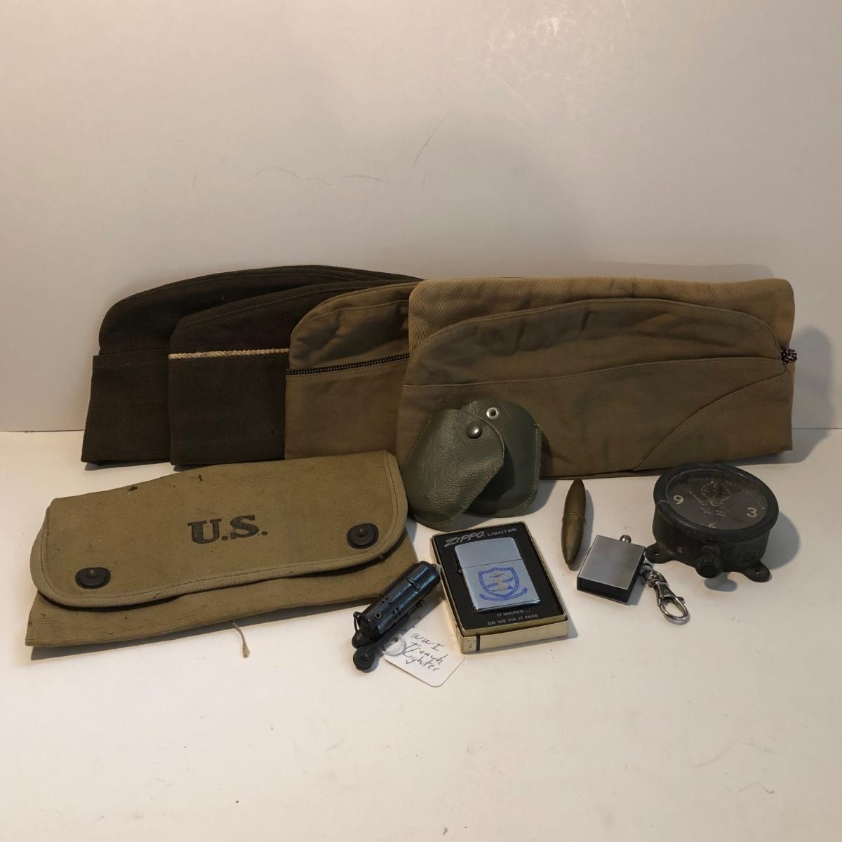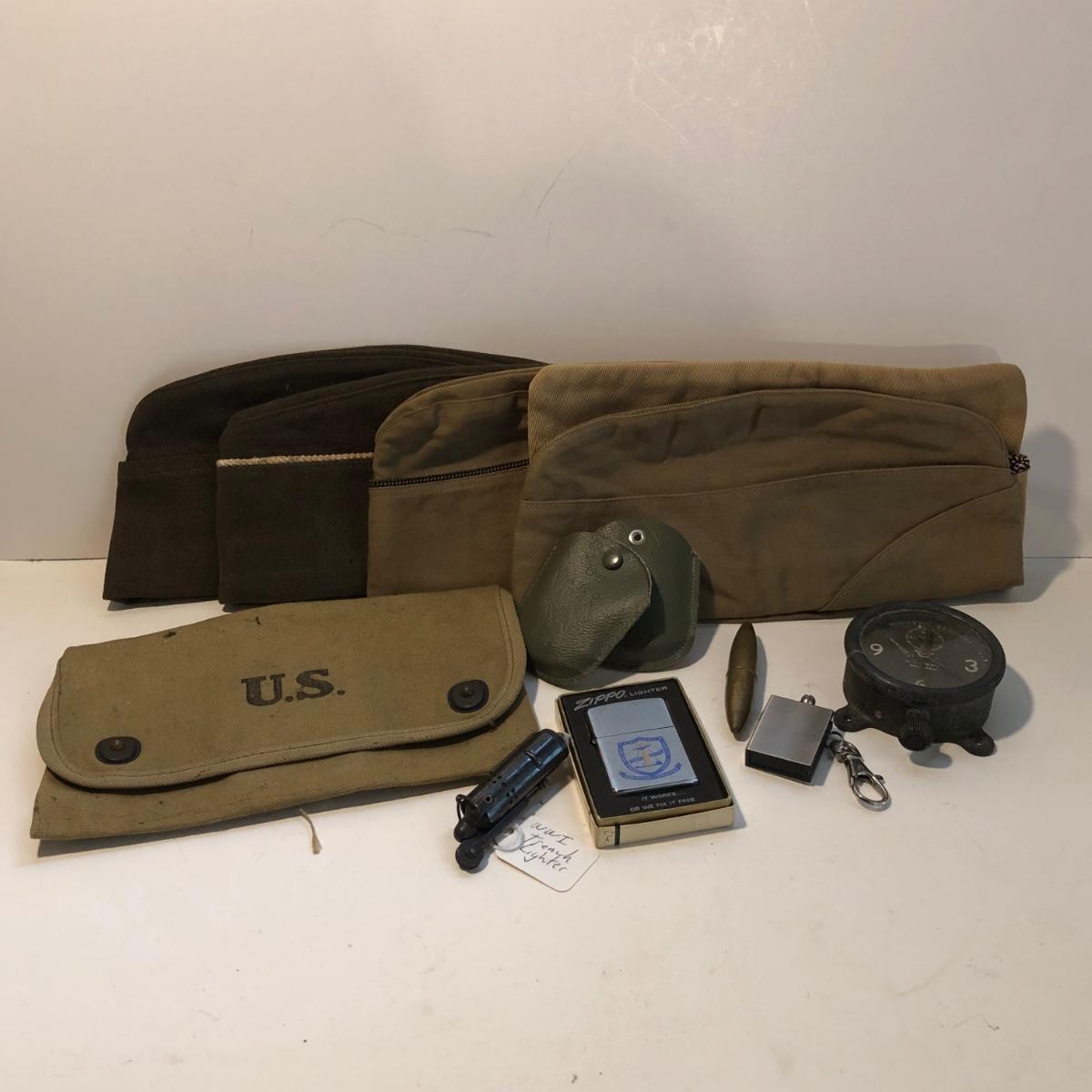 LOT 83M: WWI Trench Lighter, US Army Waltham Clock/Compass, WWII Bullet Lighter, Military Hats, US Stamped Wallet & More