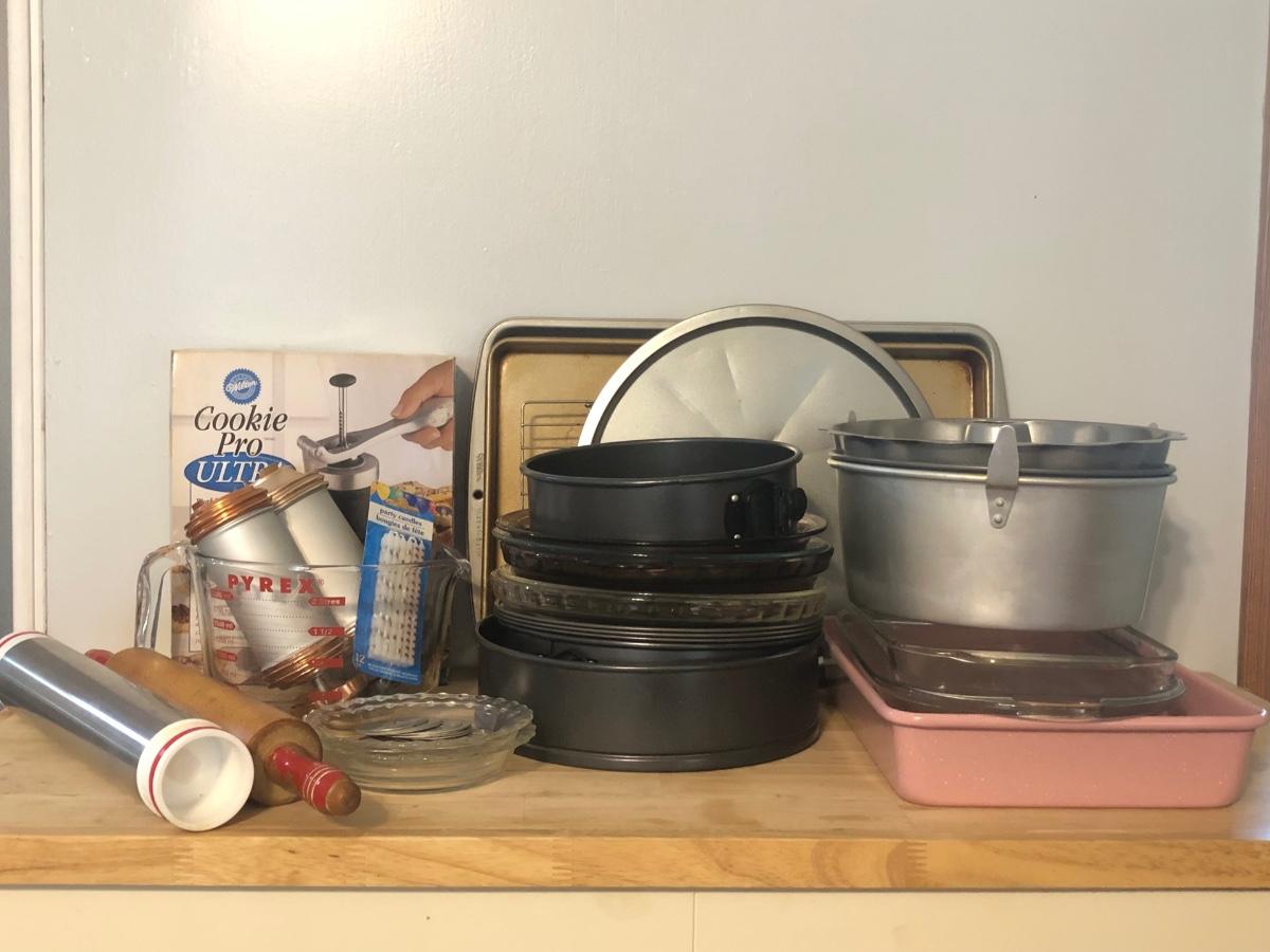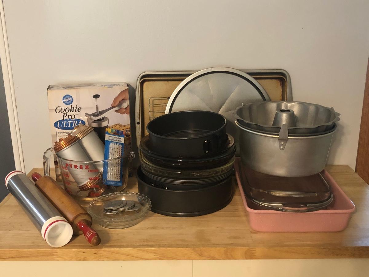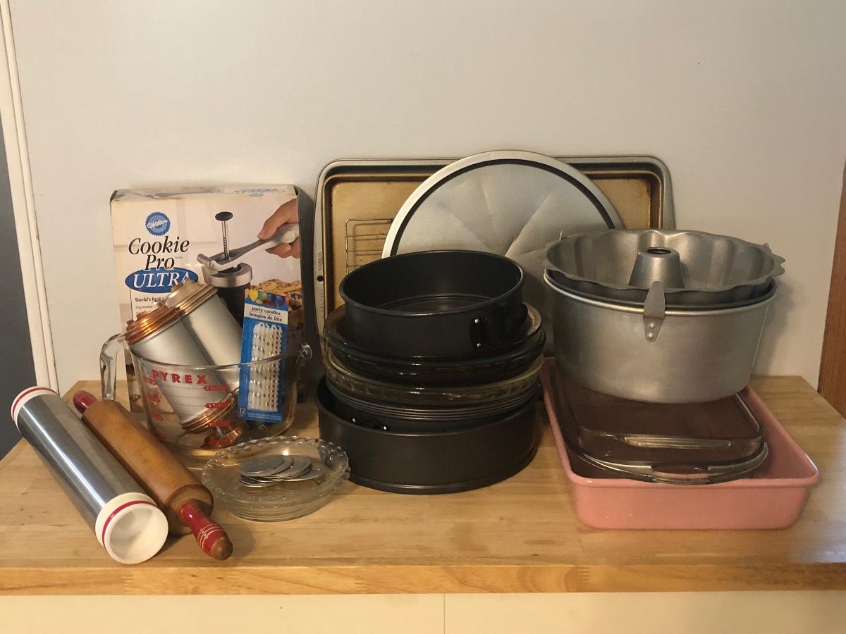 LOT 172M: Baking Collection - Cookie Presses, Pyrex Pie Dishes, Cake Pans & More