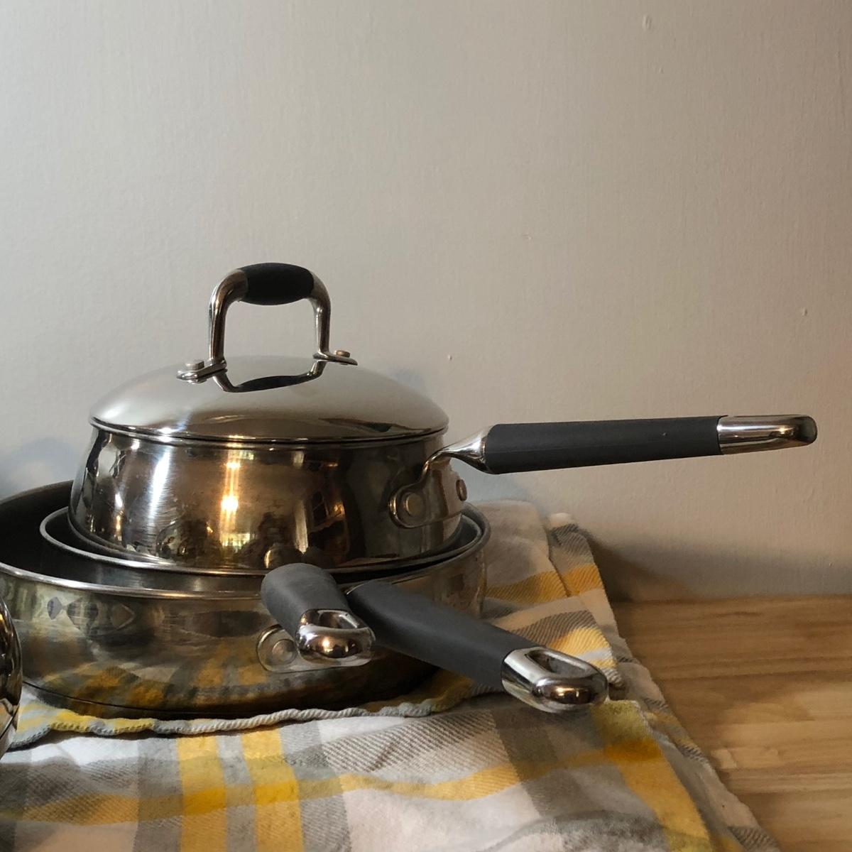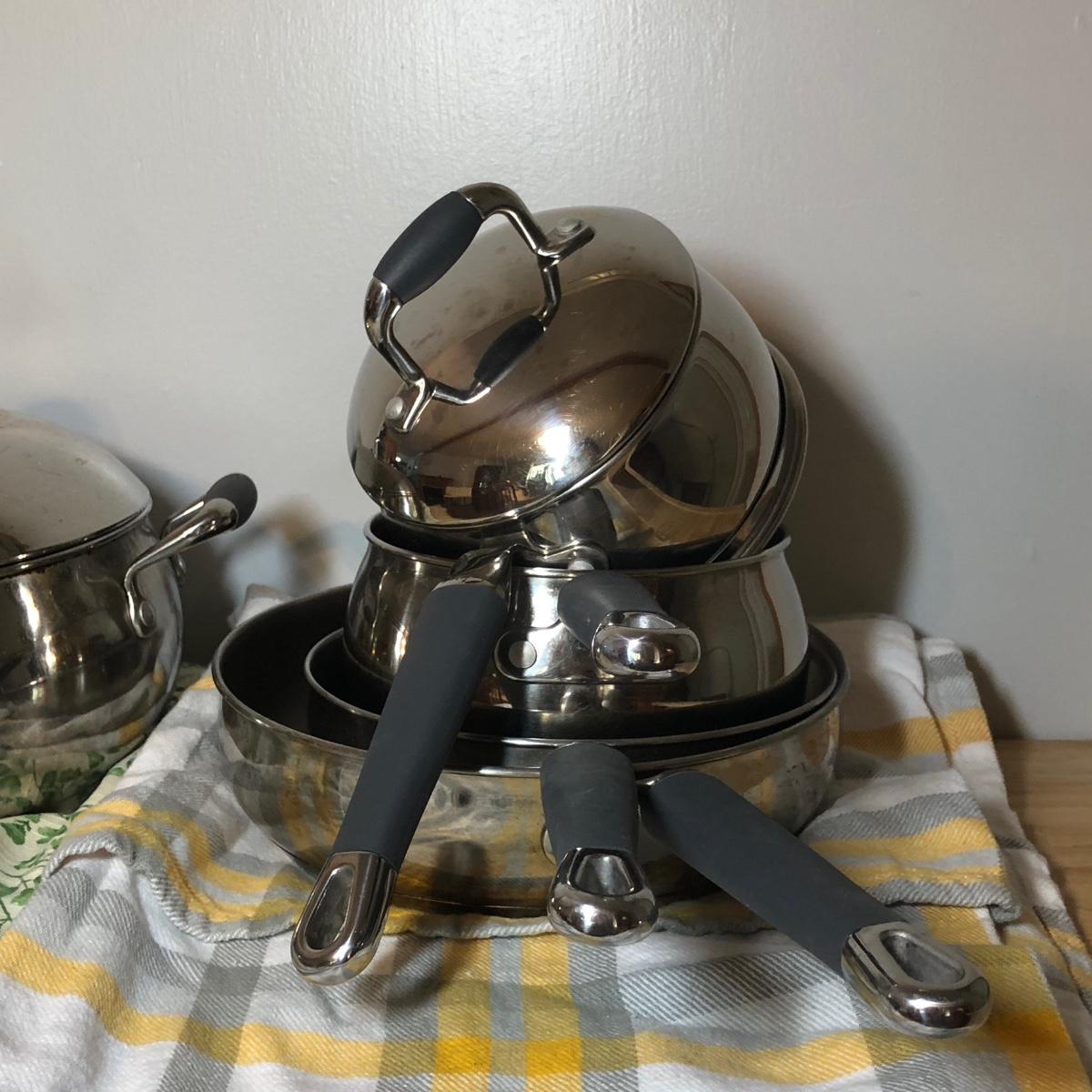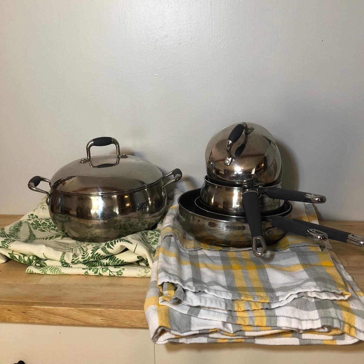 LOT 185M: Martha Stewart Everyday Pots & Pans Set & Tablecloths