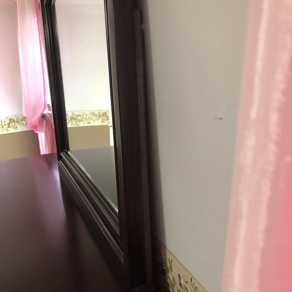 Dresser measures 66W x 18D x 40H and attached mirror measures 32 x 46 inches.
