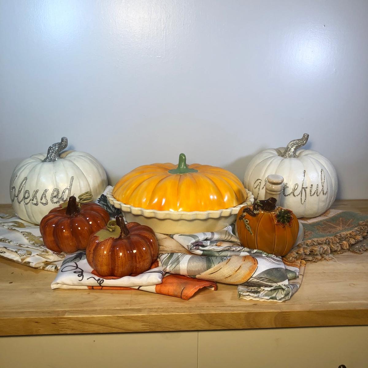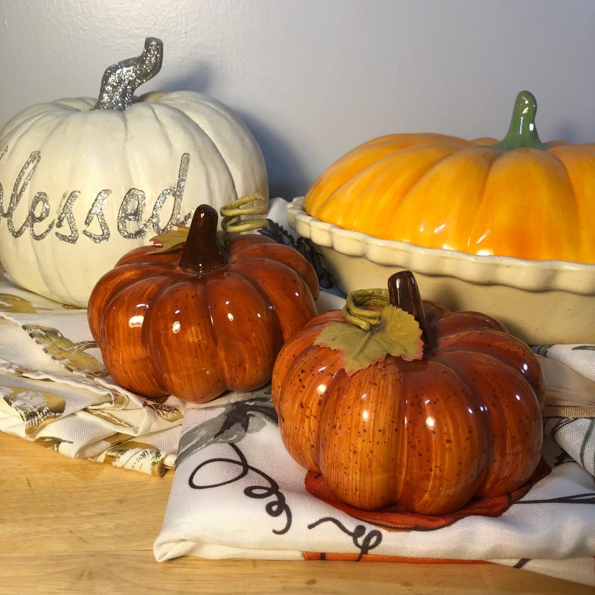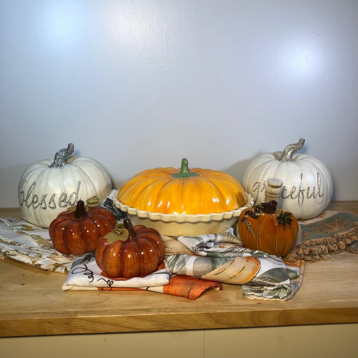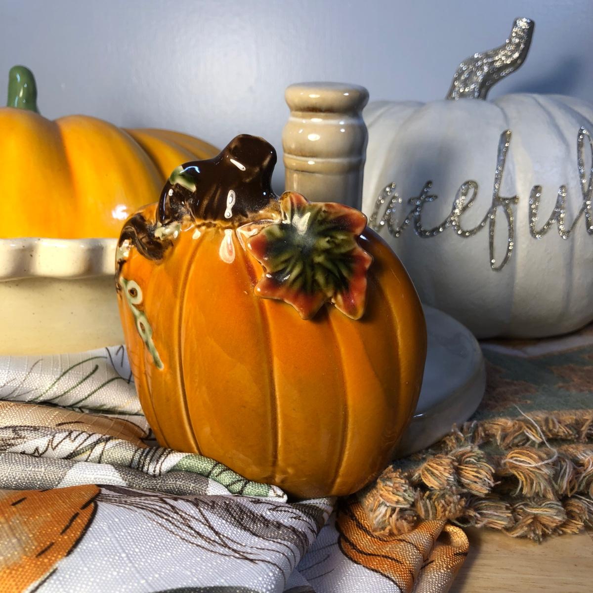 LOT 272M: Thanksgiving Home Decor - Ceramic Pumpkin Pie Dish, Pumpkins, Tablecloths & Turkey S&P Shakers