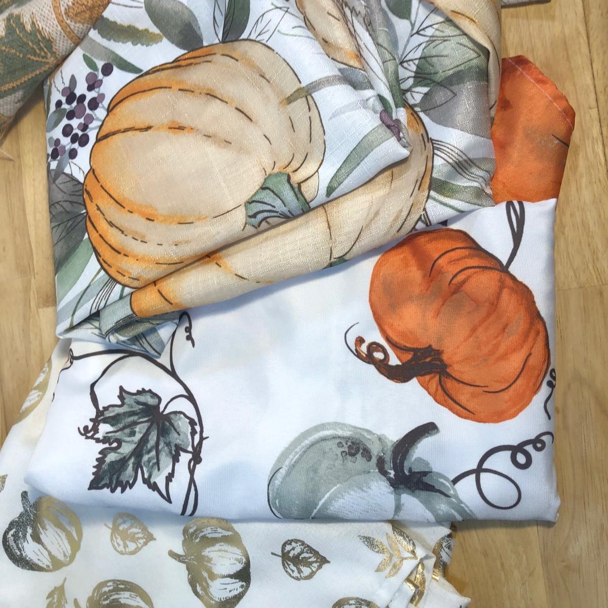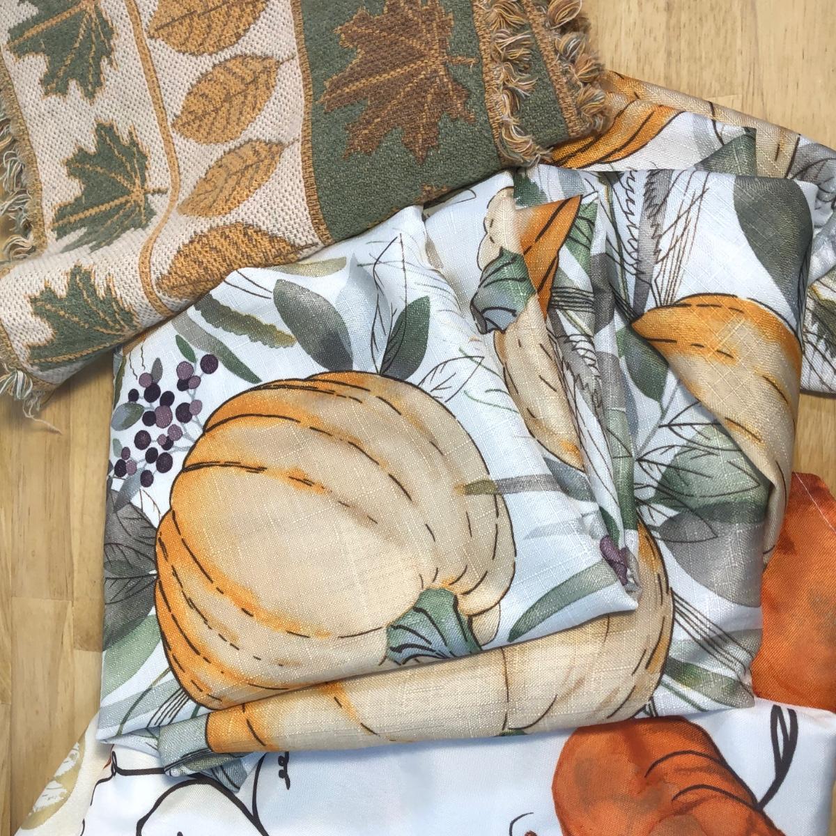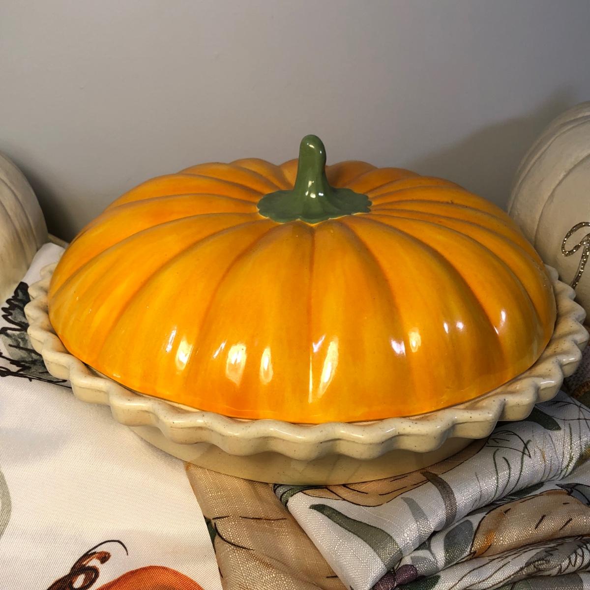 LOT 272M: Thanksgiving Home Decor - Ceramic Pumpkin Pie Dish, Pumpkins, Tablecloths & Turkey S&P Shakers