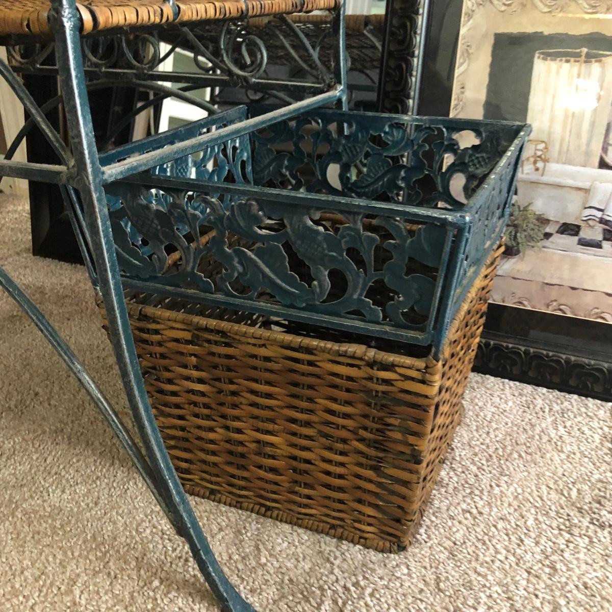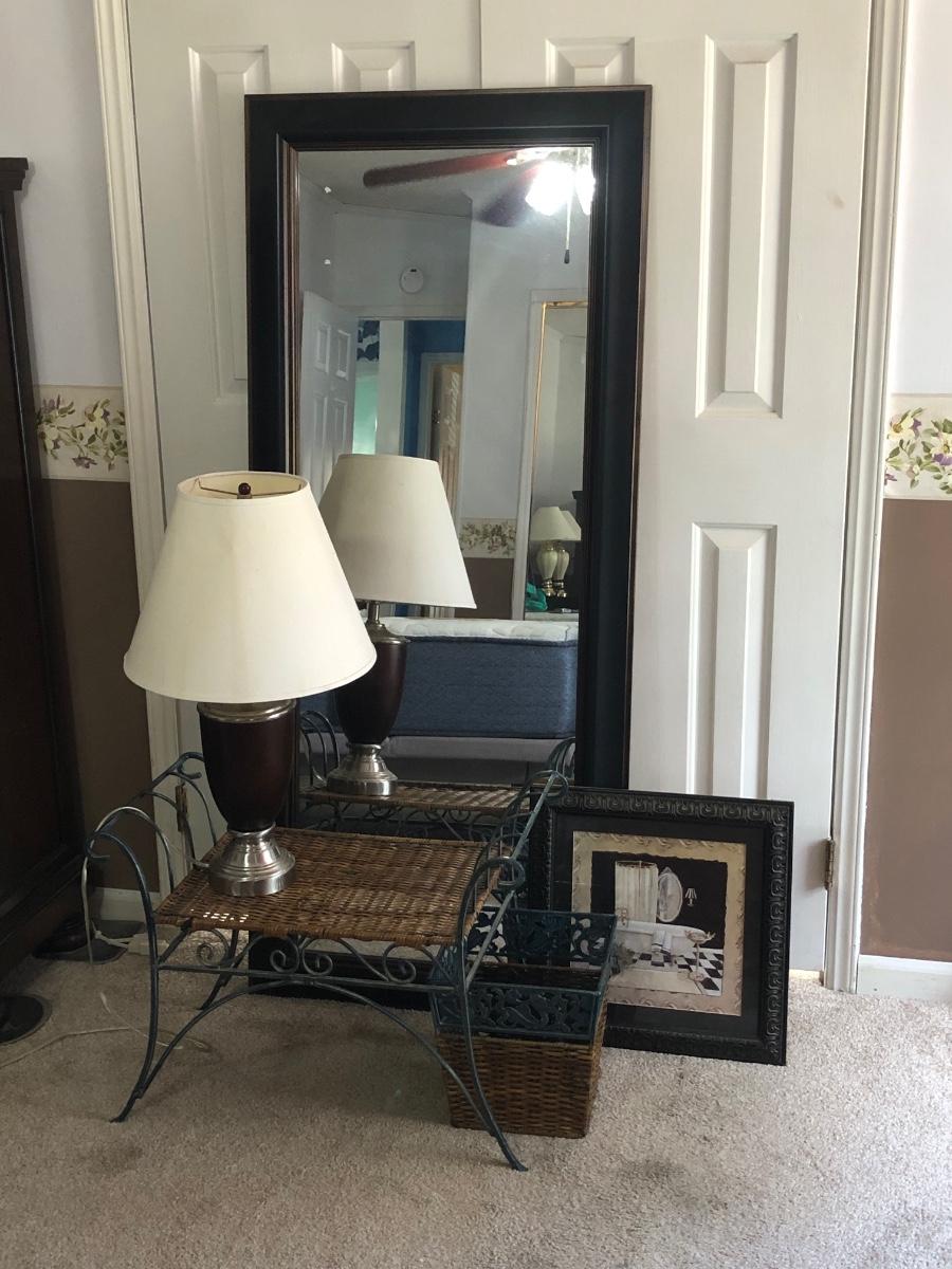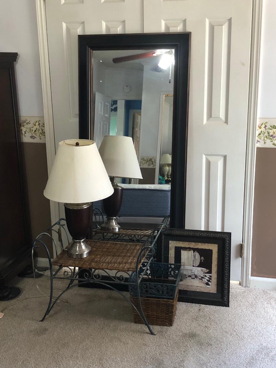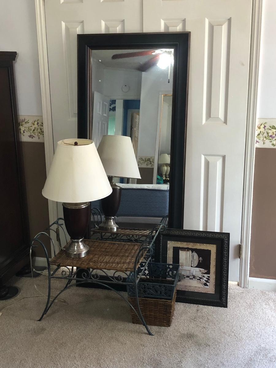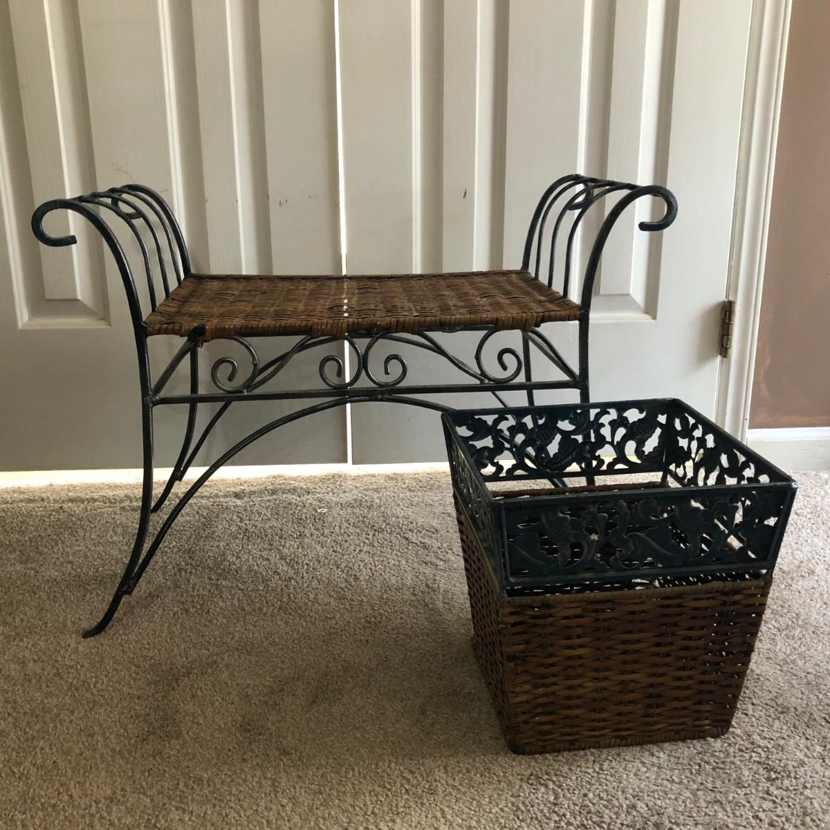 LOT 280M: Large Mirror, Wicker & Metal Bench, Framed Print, Waste Basket & Lamp