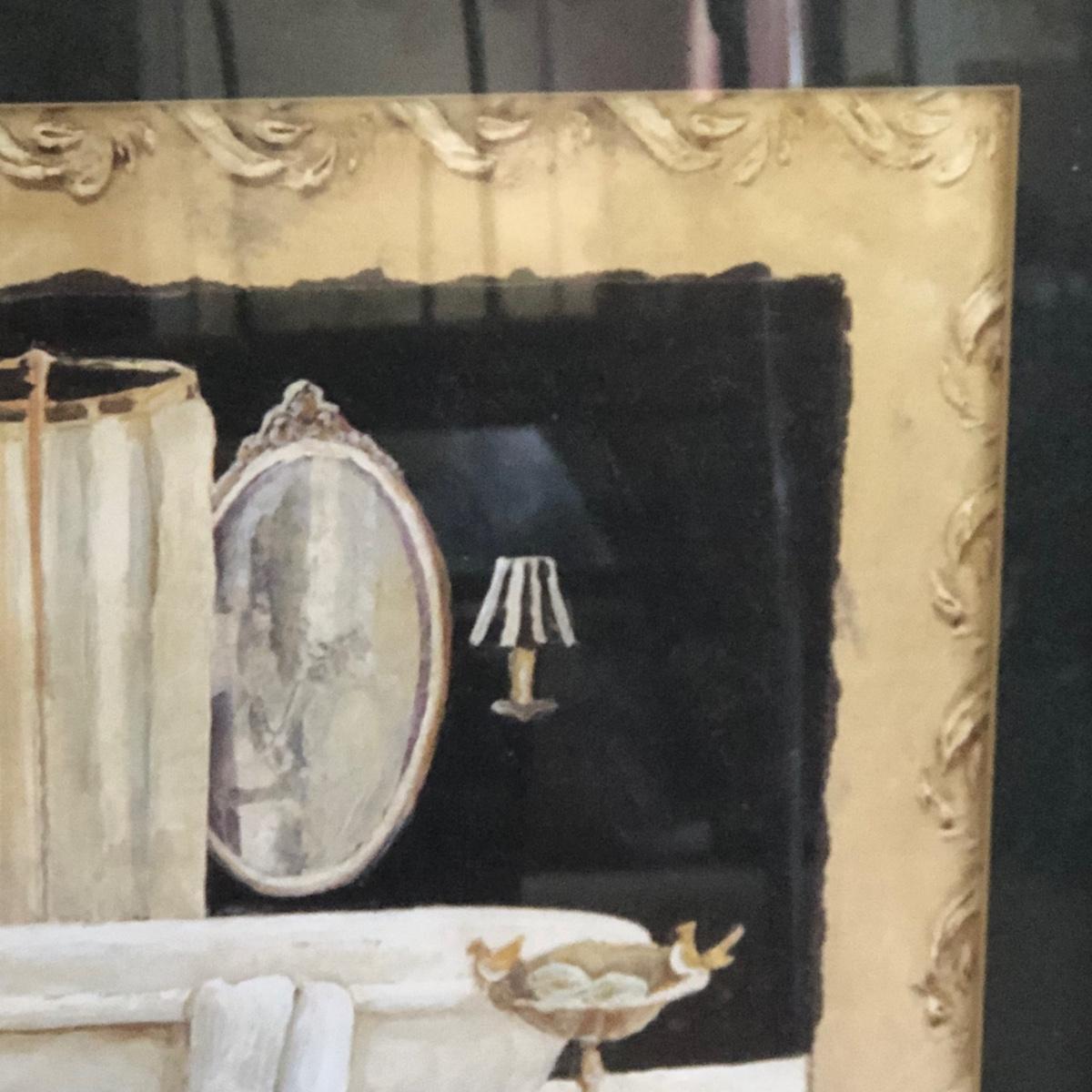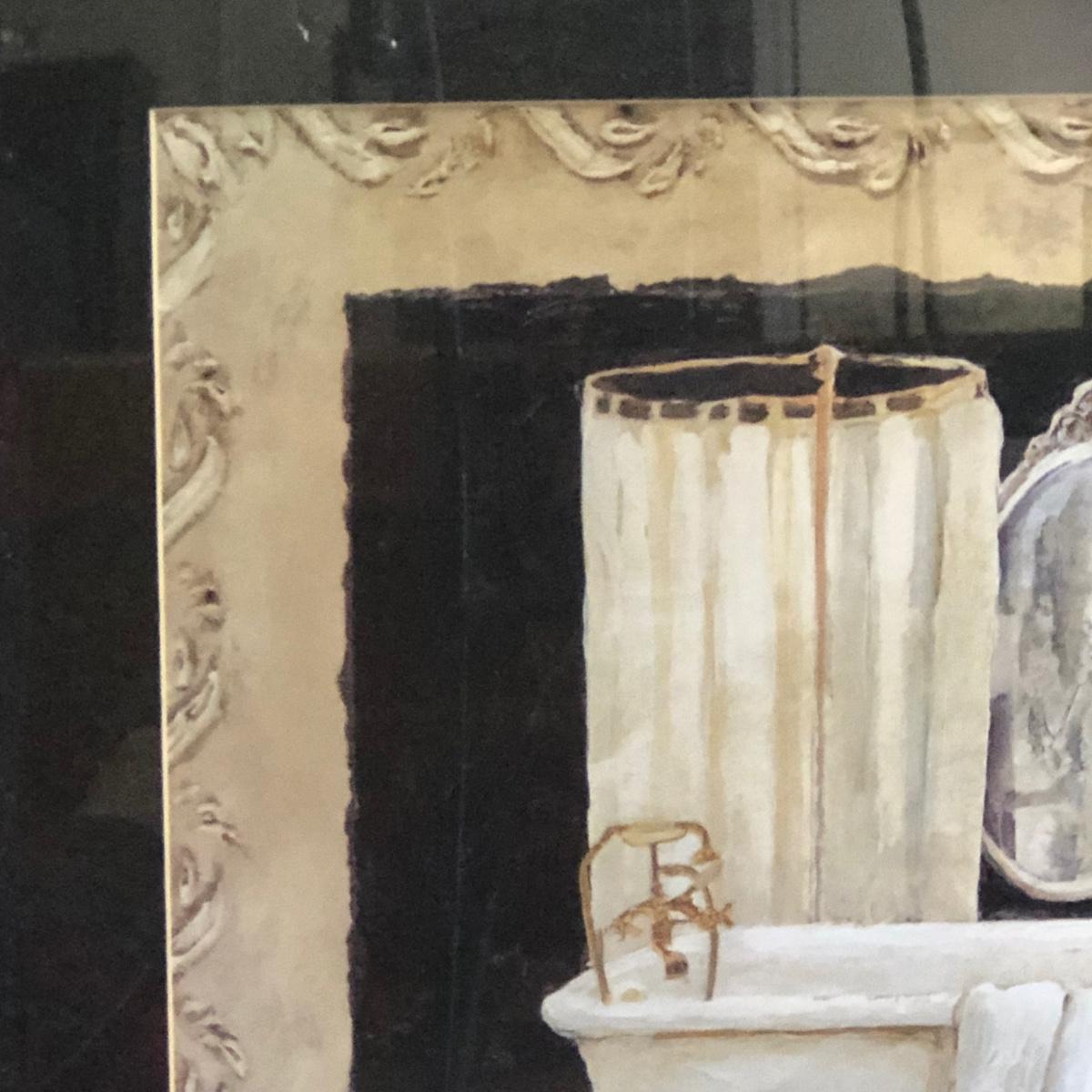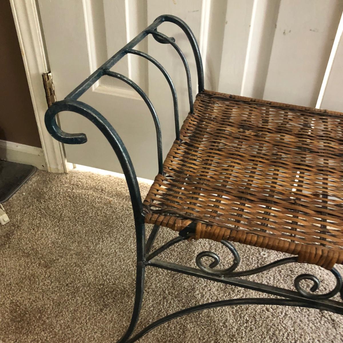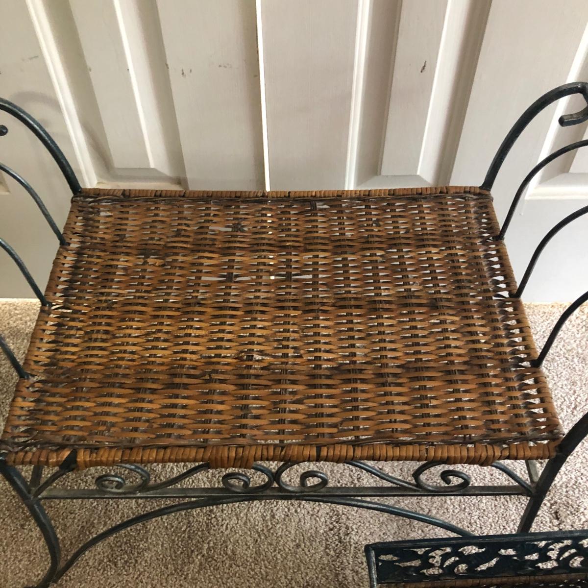 LOT 280M: Large Mirror, Wicker & Metal Bench, Framed Print, Waste Basket & Lamp