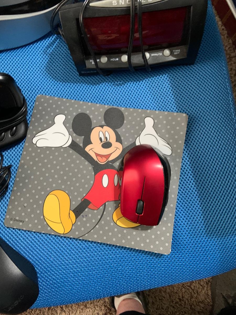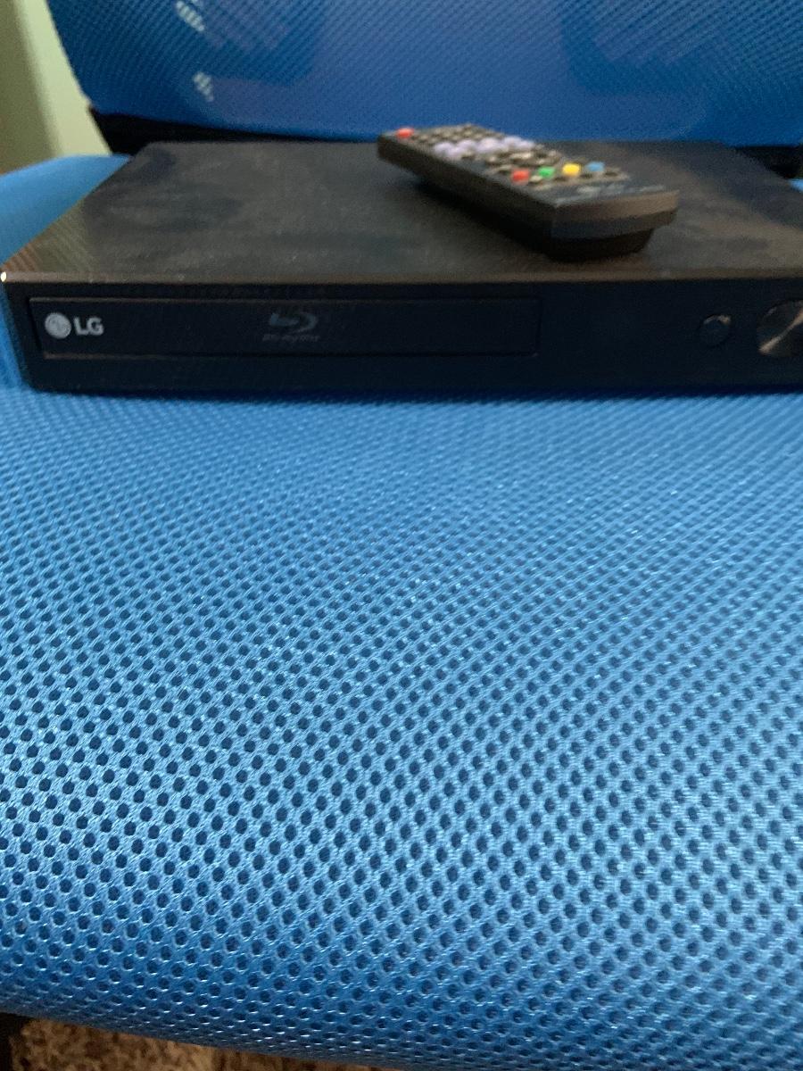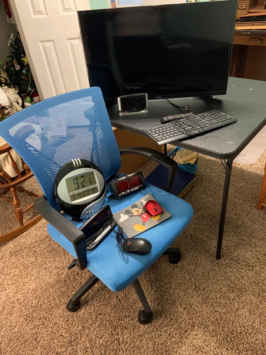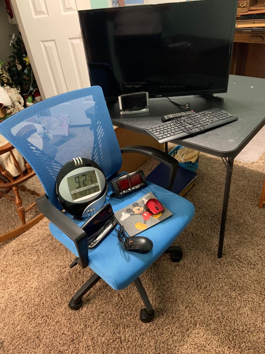 LOT:230G: Office Essentials Including a Samsung TV with Remote an LG Blueray Player with Remote, Blue Desk Chair, a Keyboard Clocks and a Mickey Mouse Pay with Mice..