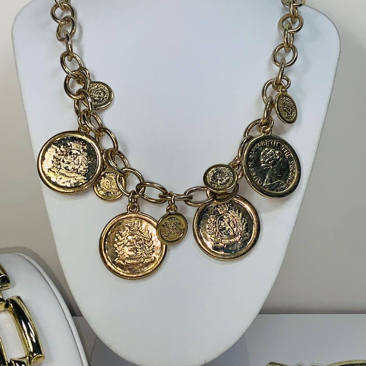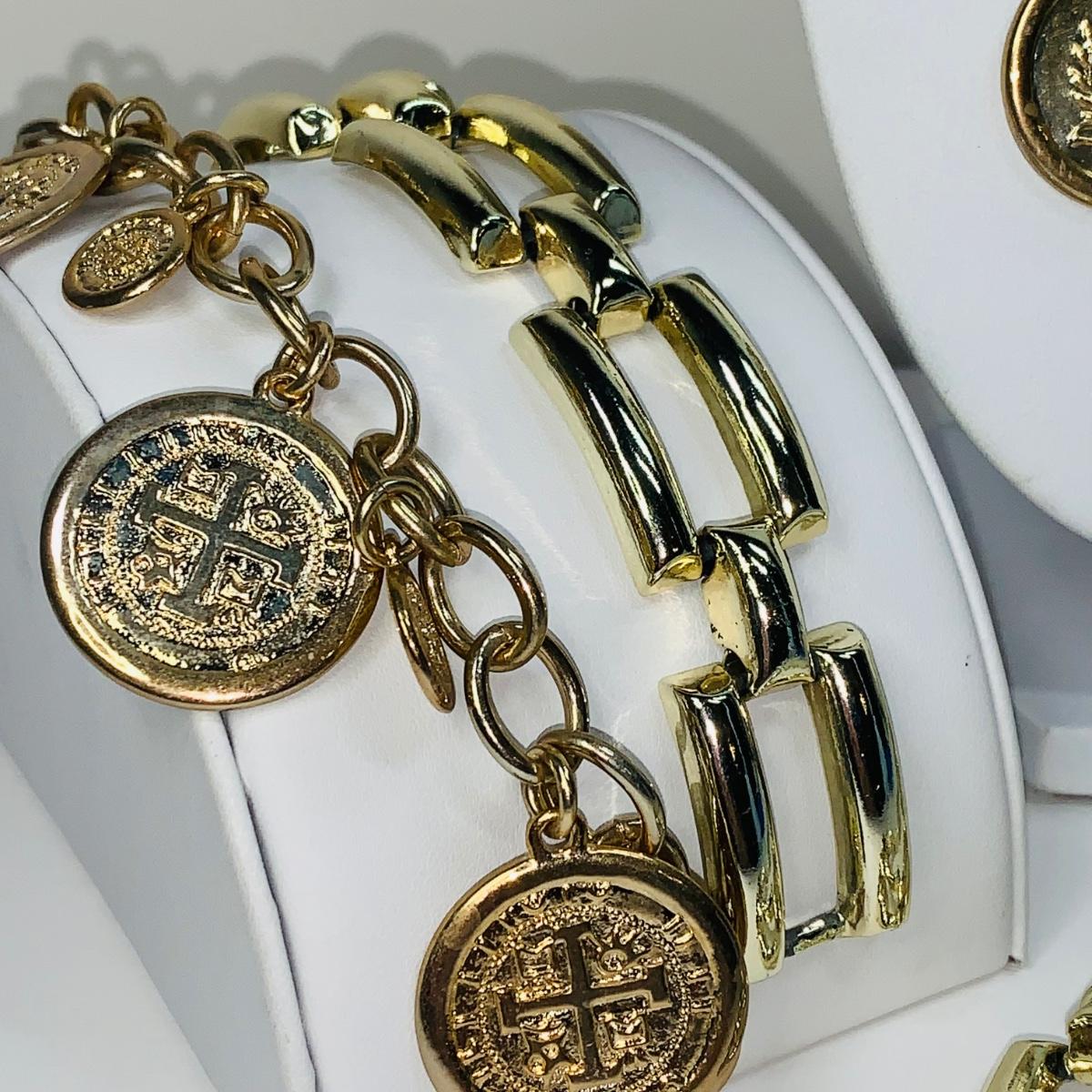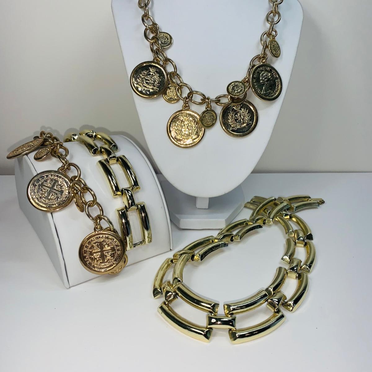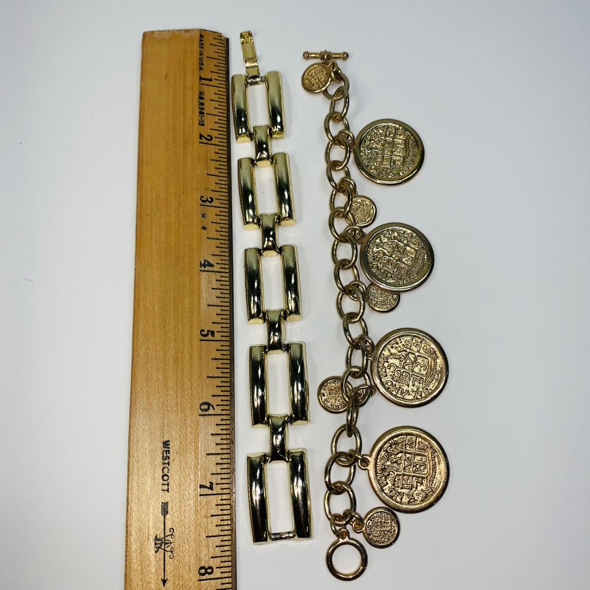 LOT 2: Gold Tone Necklace & Bracelet Sets: Faux Coins Charms & Box Chain