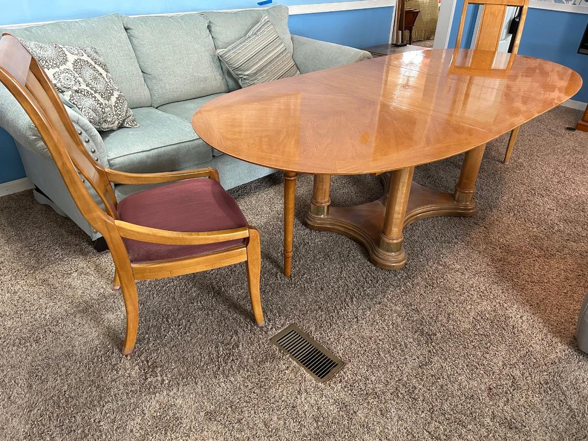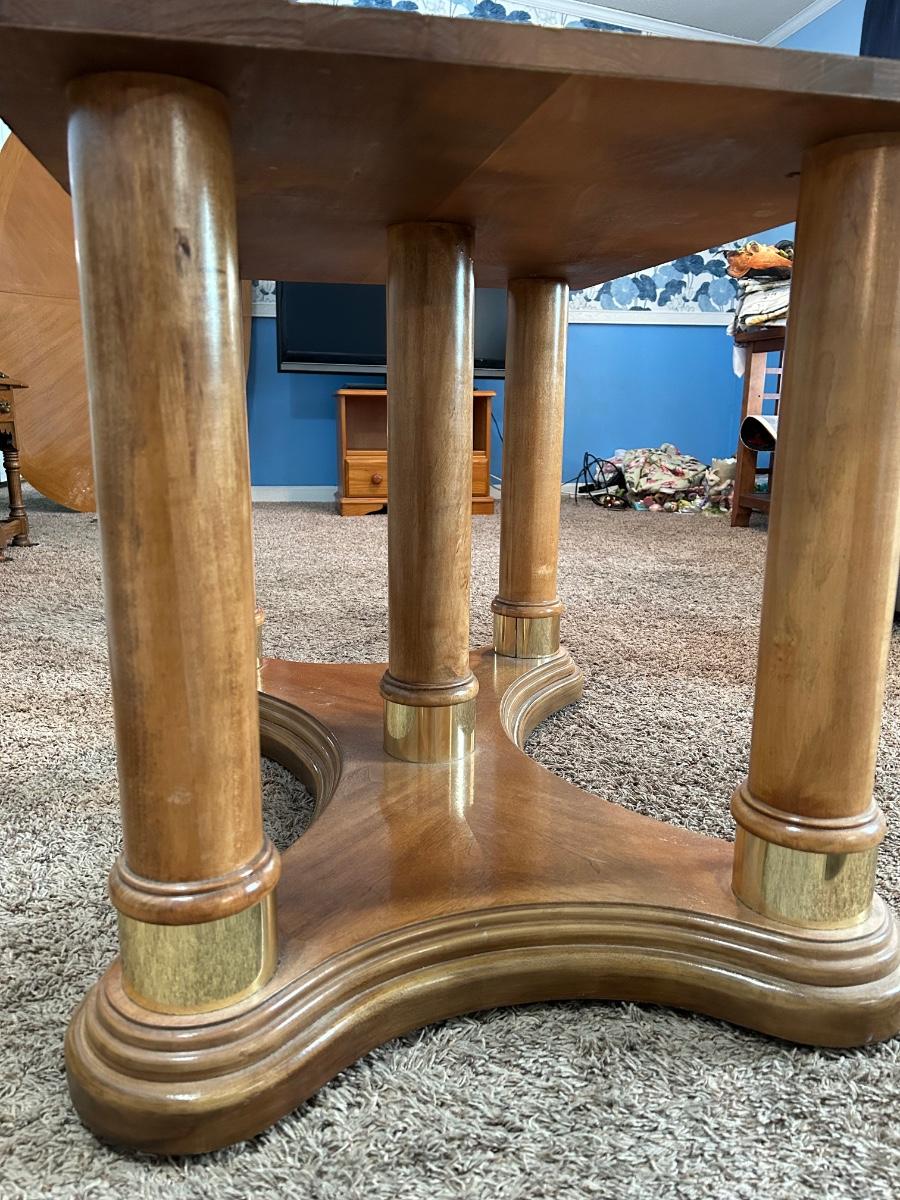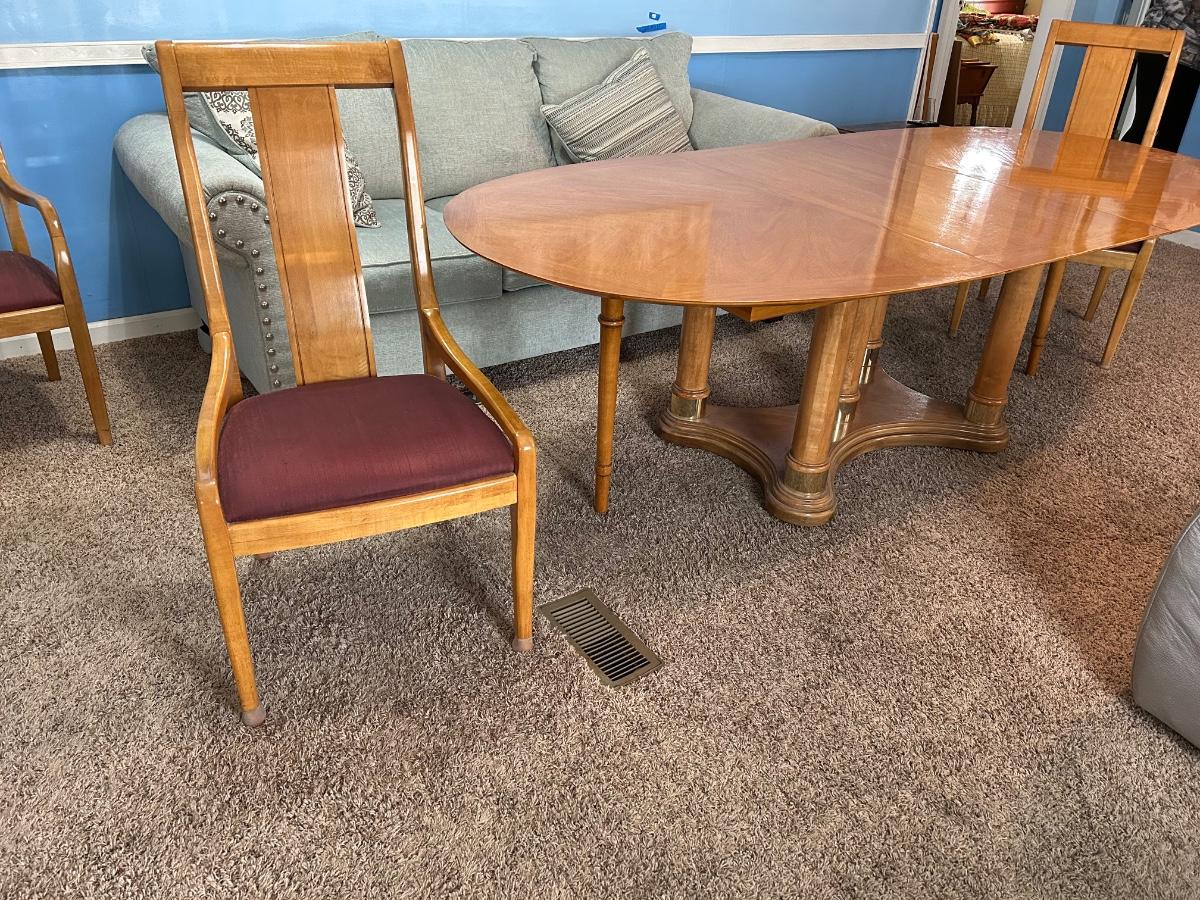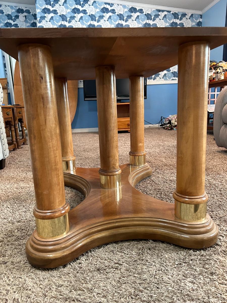 This dinning table can extend to 96” with its 24” leaf. Without leaf the table will be 44”. Please notice pictures of the tables stand without table top placed on top. Stand has brass detailing. Lot includes 5 dinning chairs.