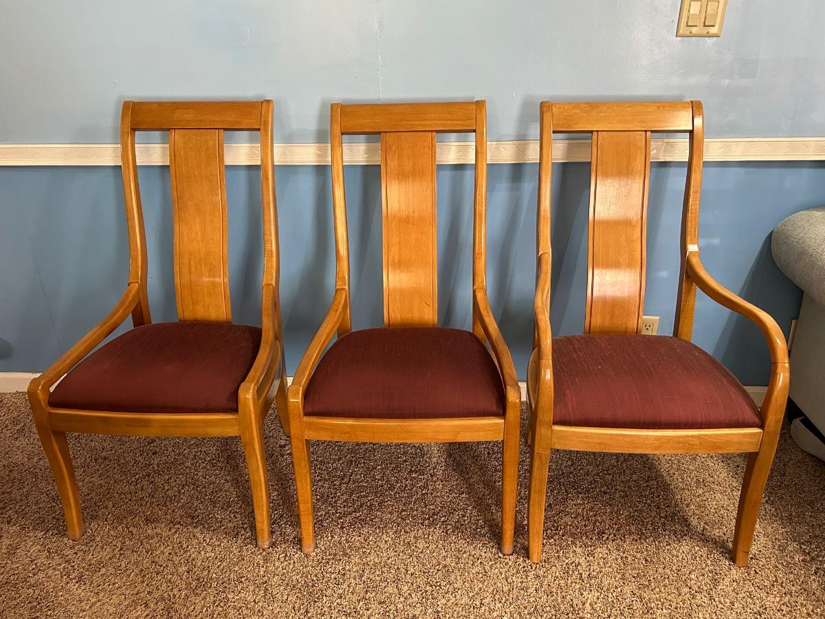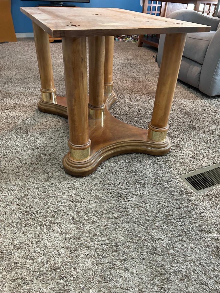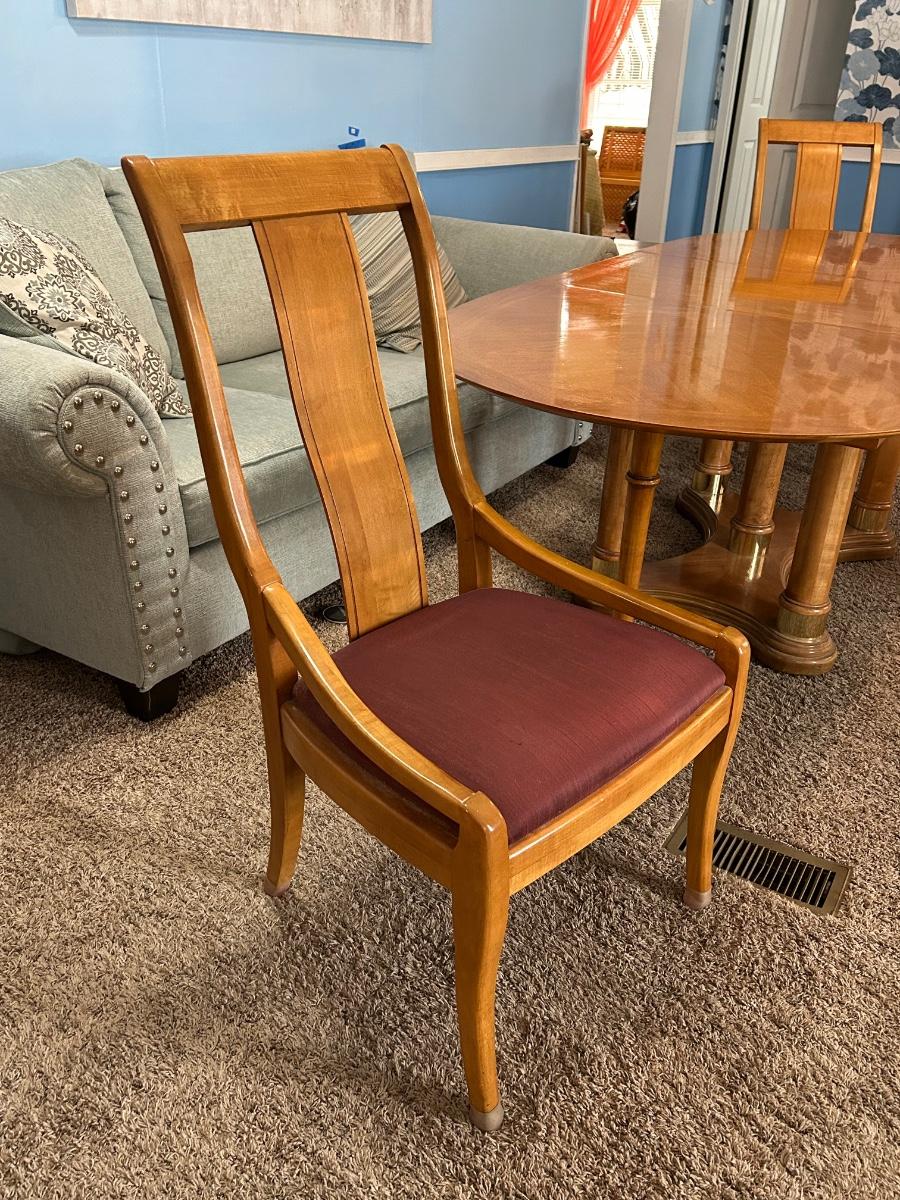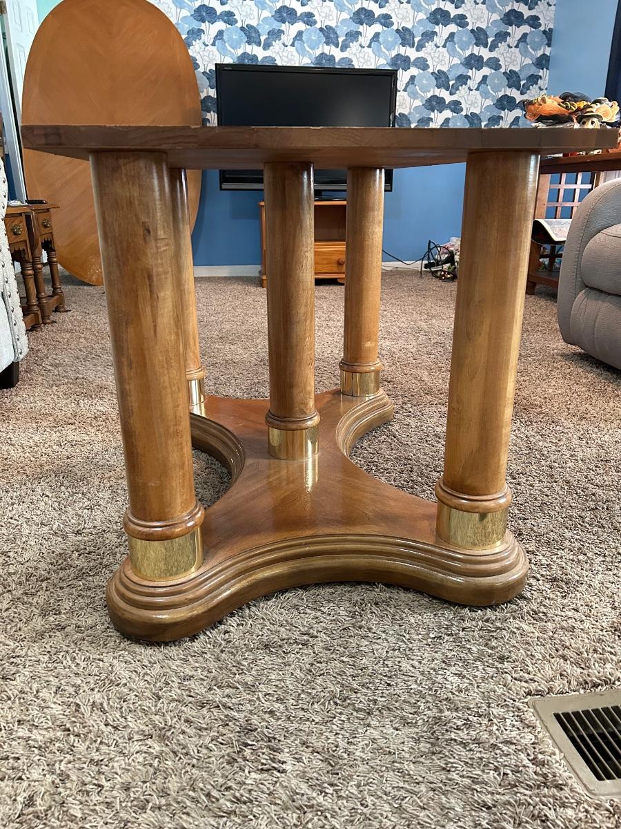 This dinning table can extend to 96” with its 24” leaf. Without leaf the table will be 44”. Please notice pictures of the tables stand without table top placed on top. Stand has brass detailing. Lot includes 5 dinning chairs.