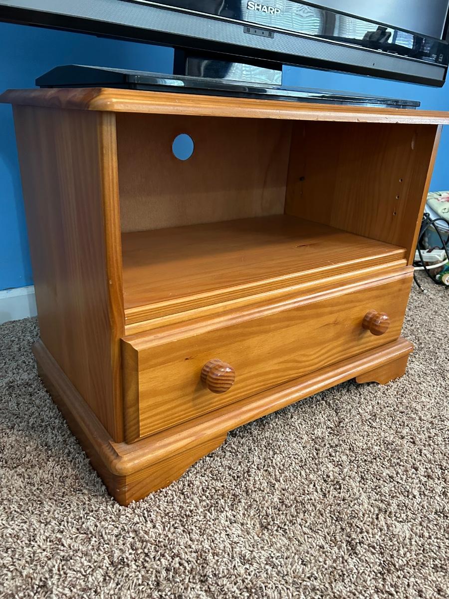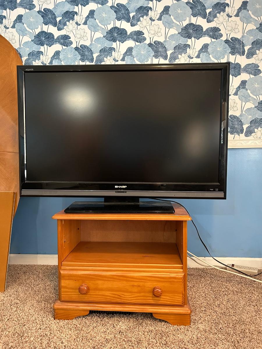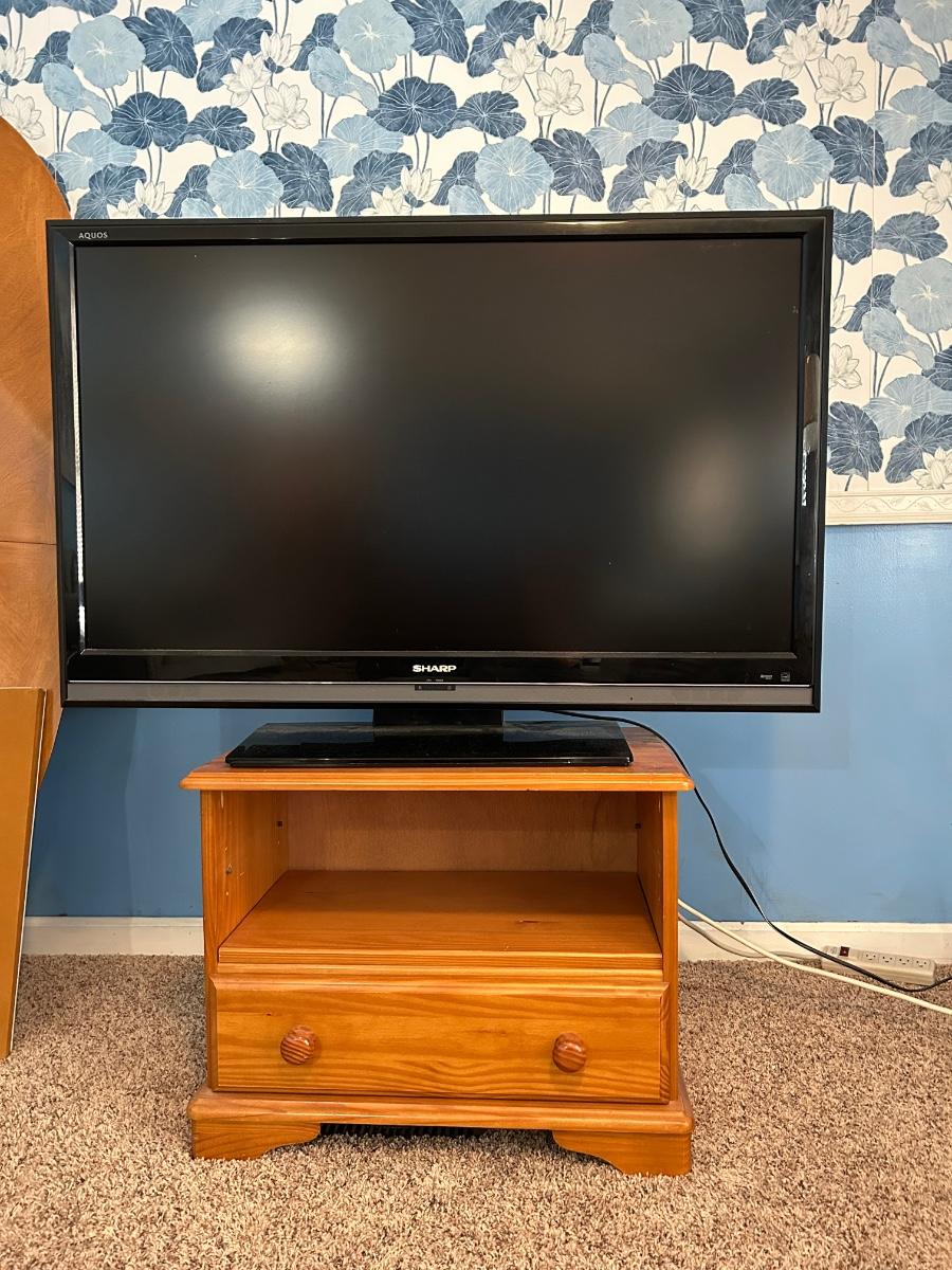 Tv stand is 27”x 21”x 15” in size and has drawer. Tv is made by Sharp. Photos include model number.