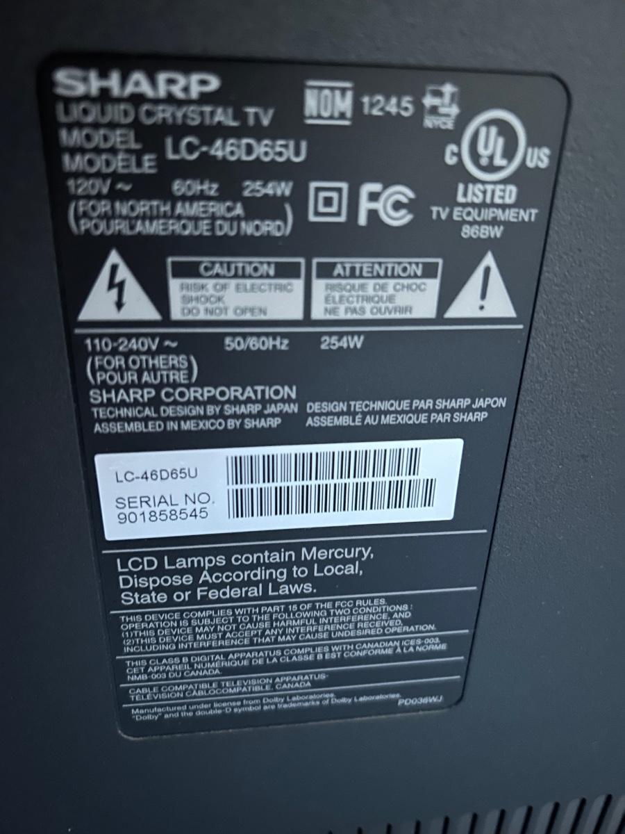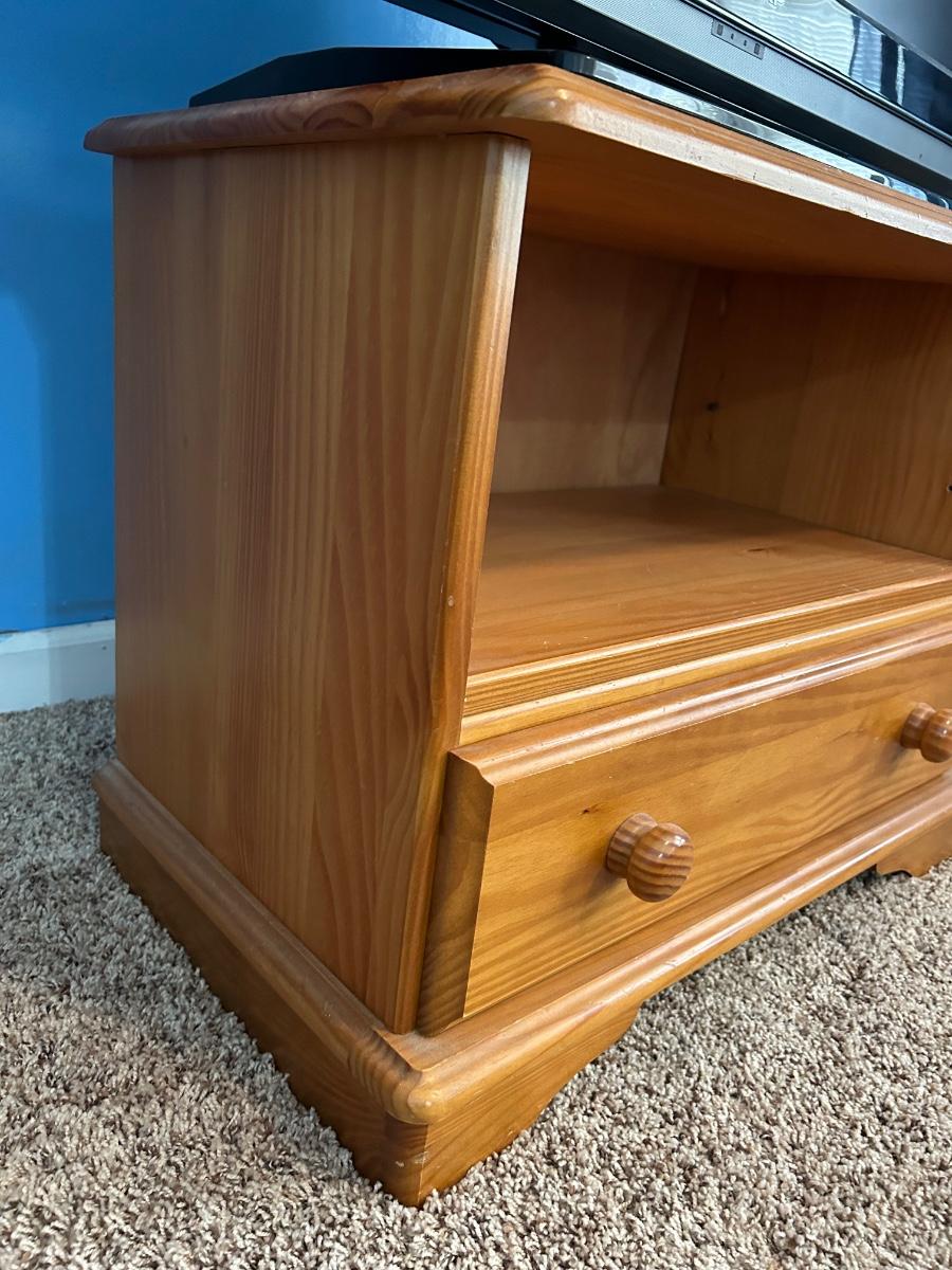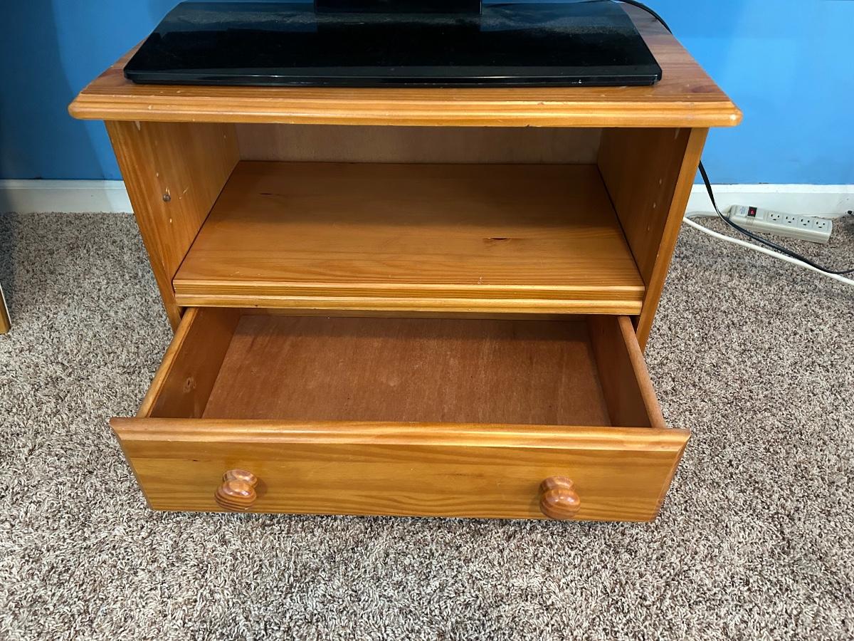 Tv stand is 27”x 21”x 15” in size and has drawer. Tv is made by Sharp. Photos include model number.