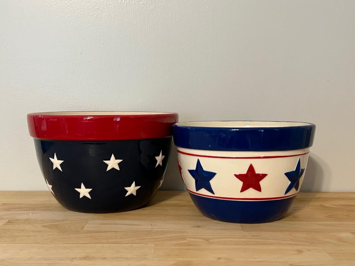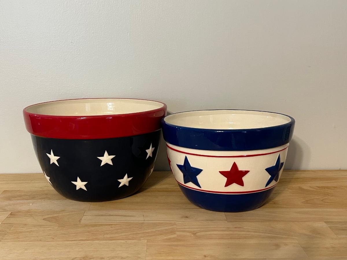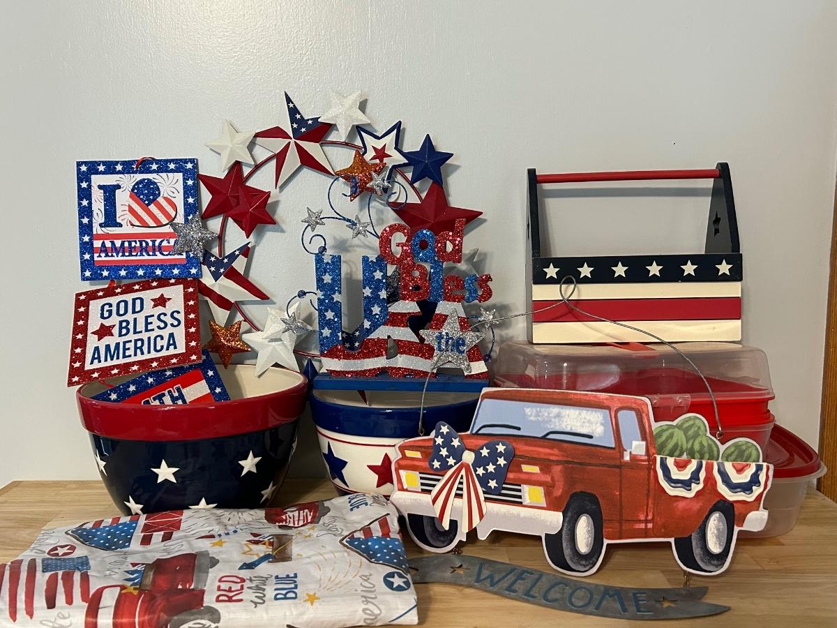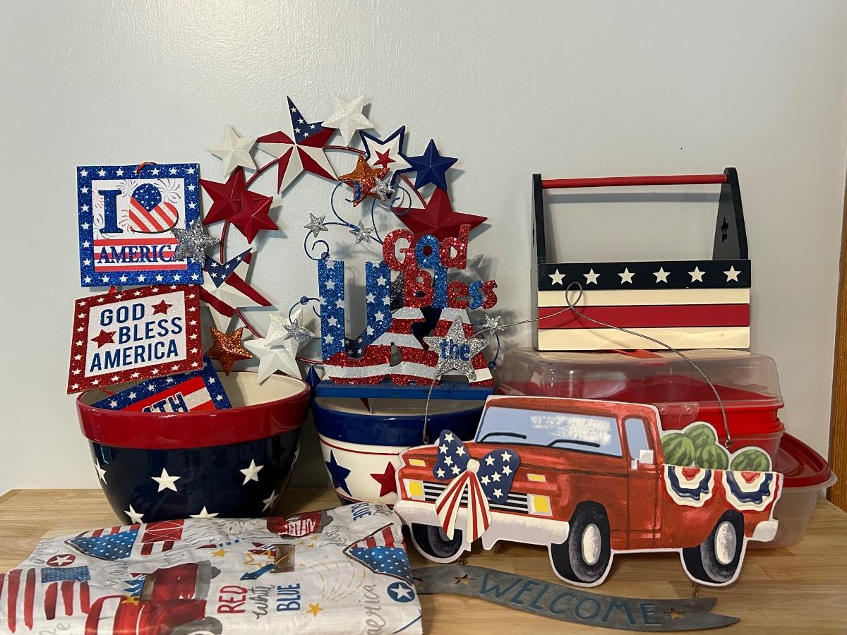 Lot includes red white and blue decor, serving bowls with stars, wreath, plastic tablecloths and more.