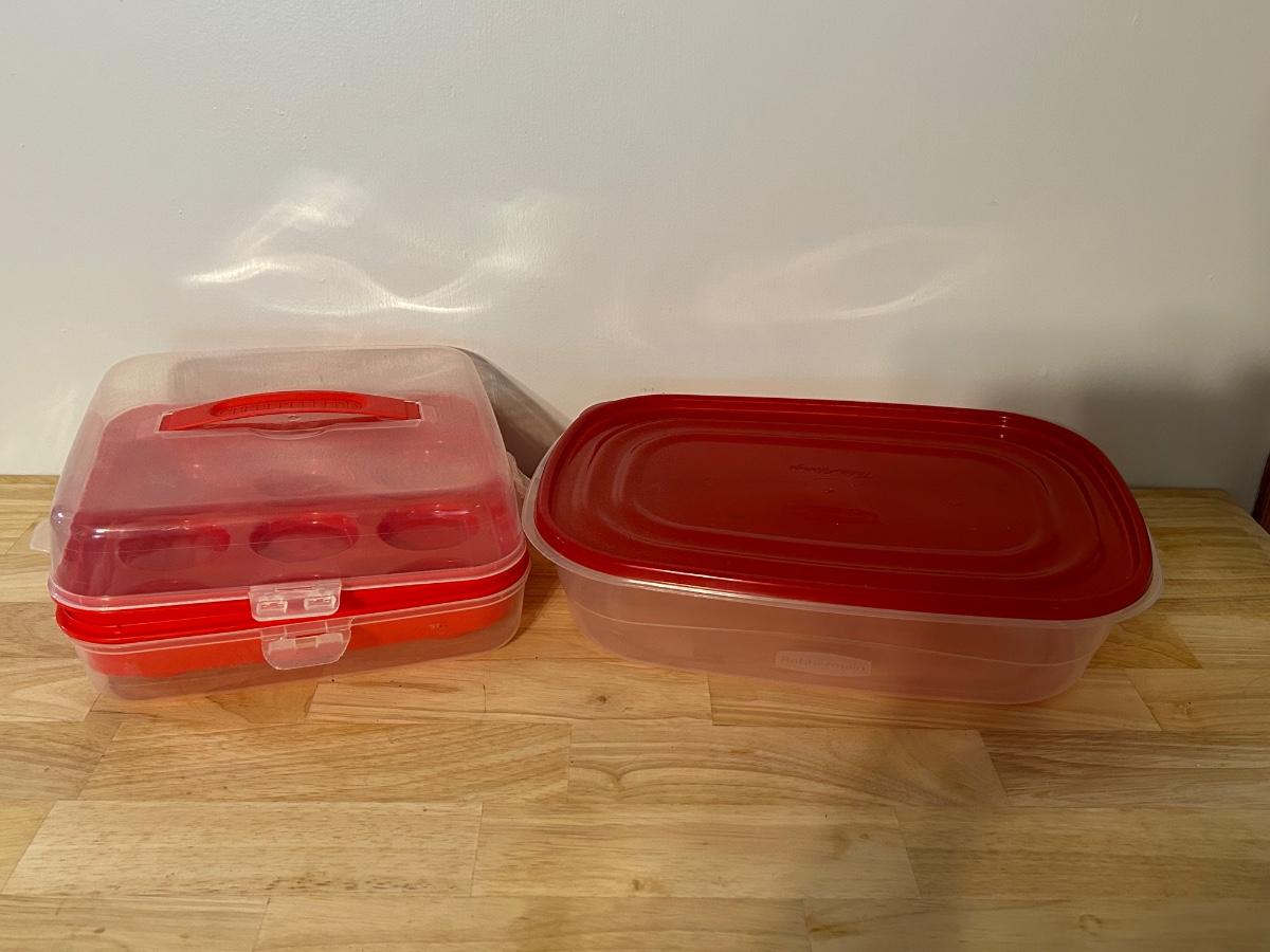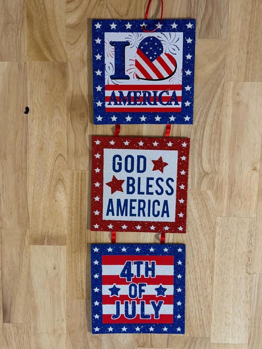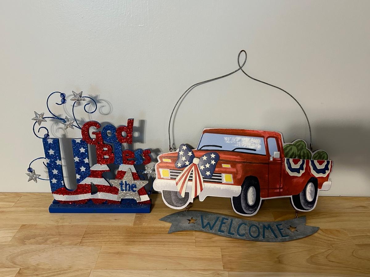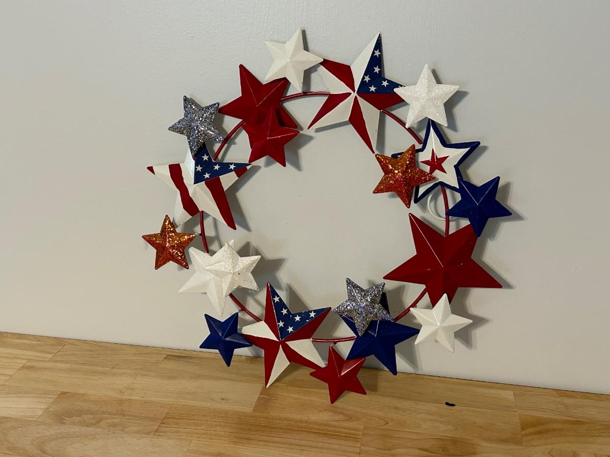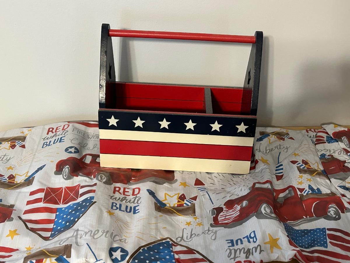 Lot includes red white and blue decor, serving bowls with stars, wreath, plastic tablecloths and more.