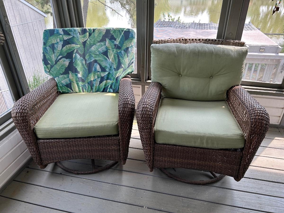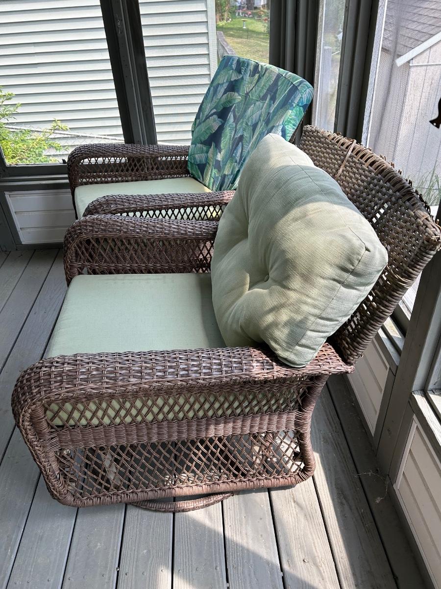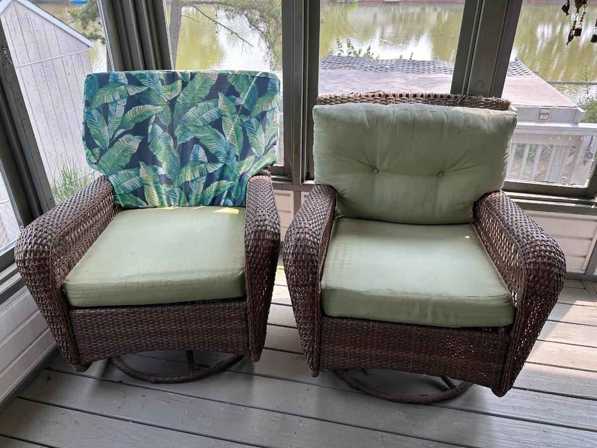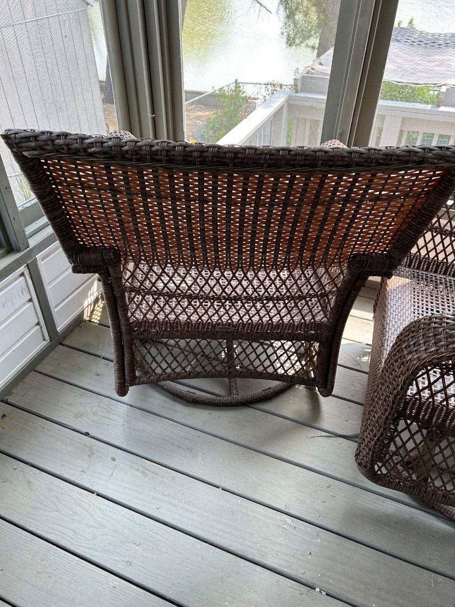Two plastic wicker swivel chairs. One chair is in good used condition, one chair shows wear from use. Photos show plastic starting to unravel on back of chair. Lot includes cushions. Chairs measure 31”x 35”.