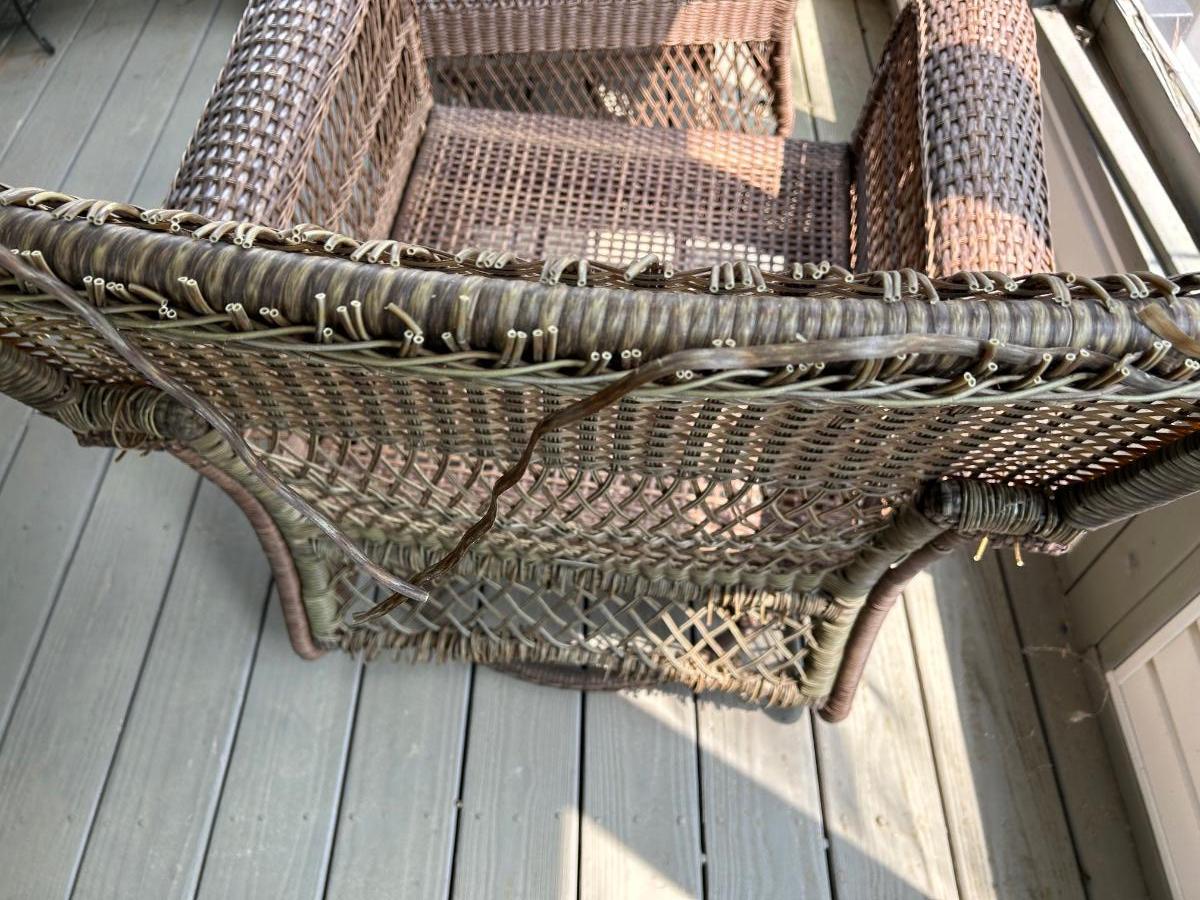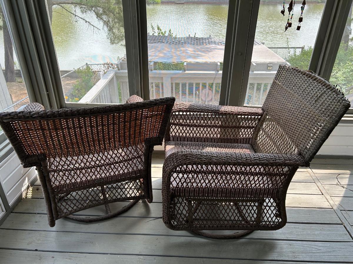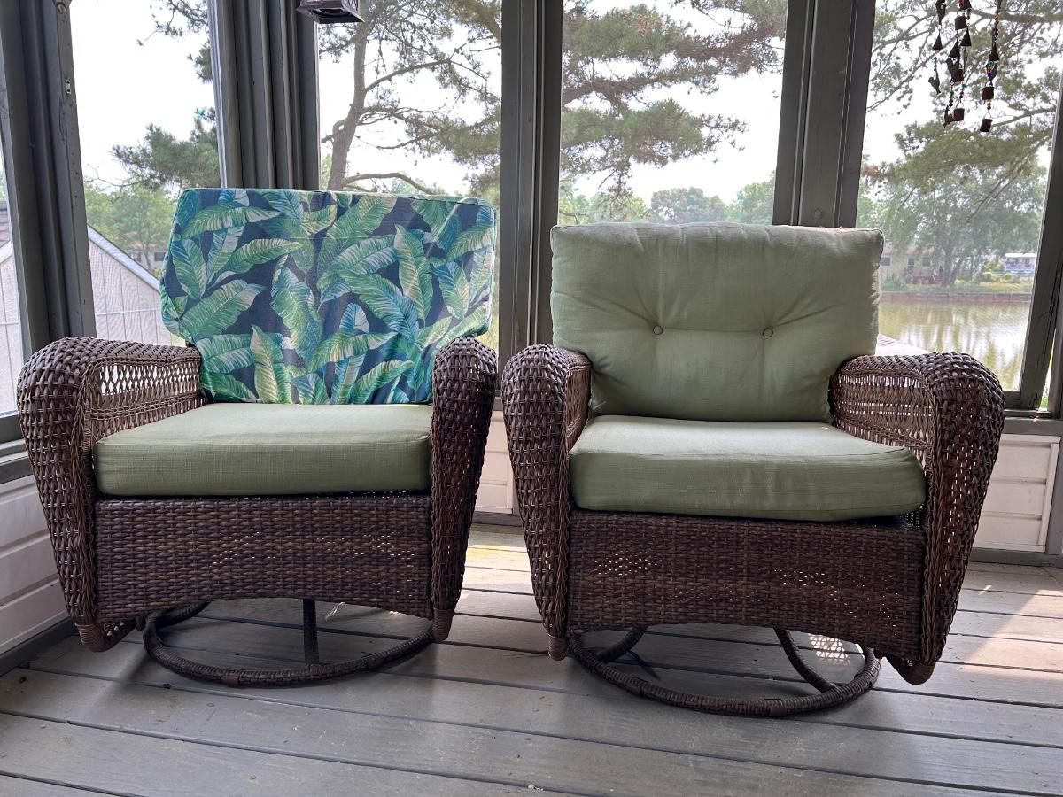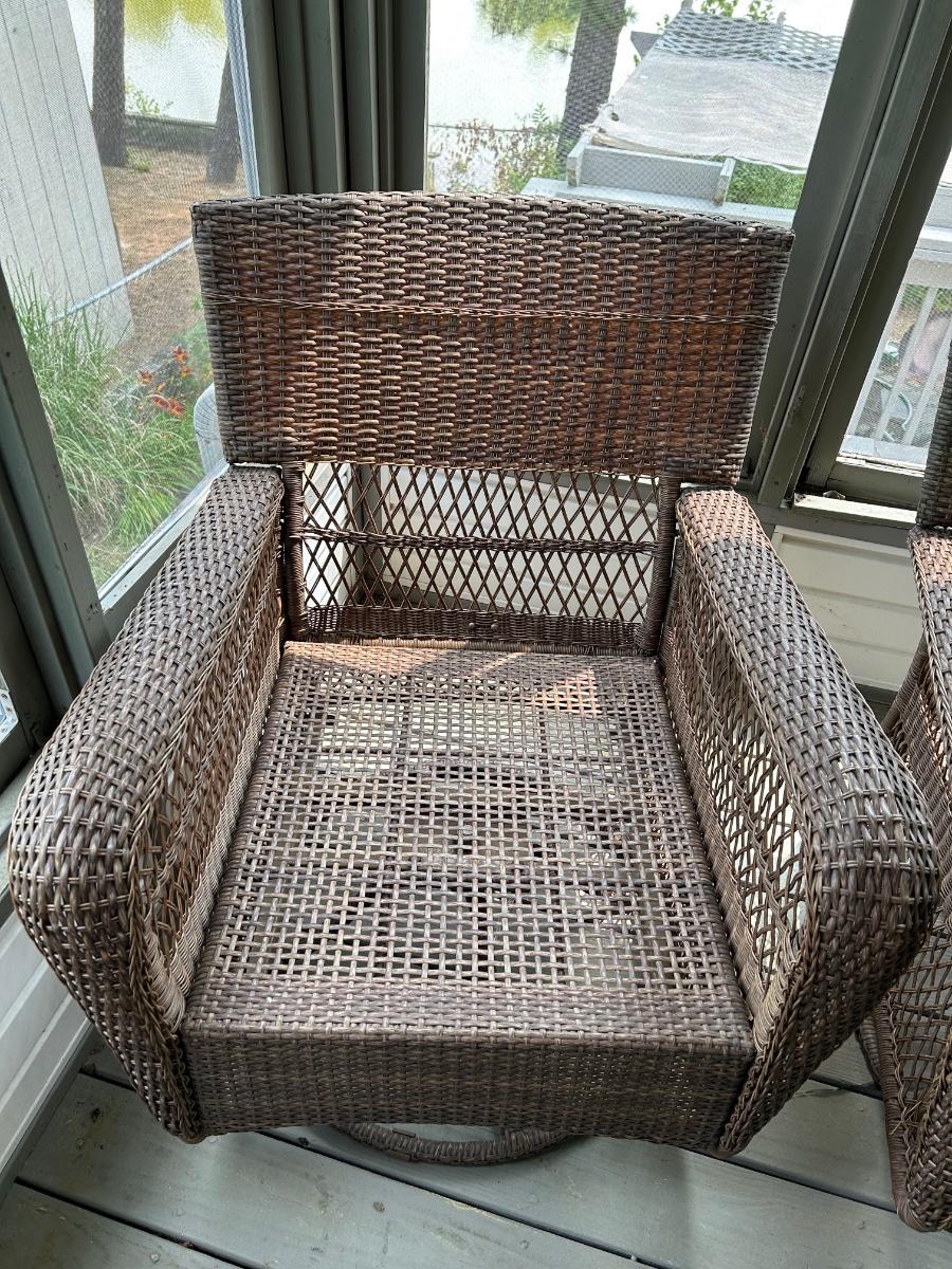 Two plastic wicker swivel chairs. One chair is in good used condition, one chair shows wear from use. Photos show plastic starting to unravel on back of chair. Lot includes cushions. Chairs measure 31”x 35”.