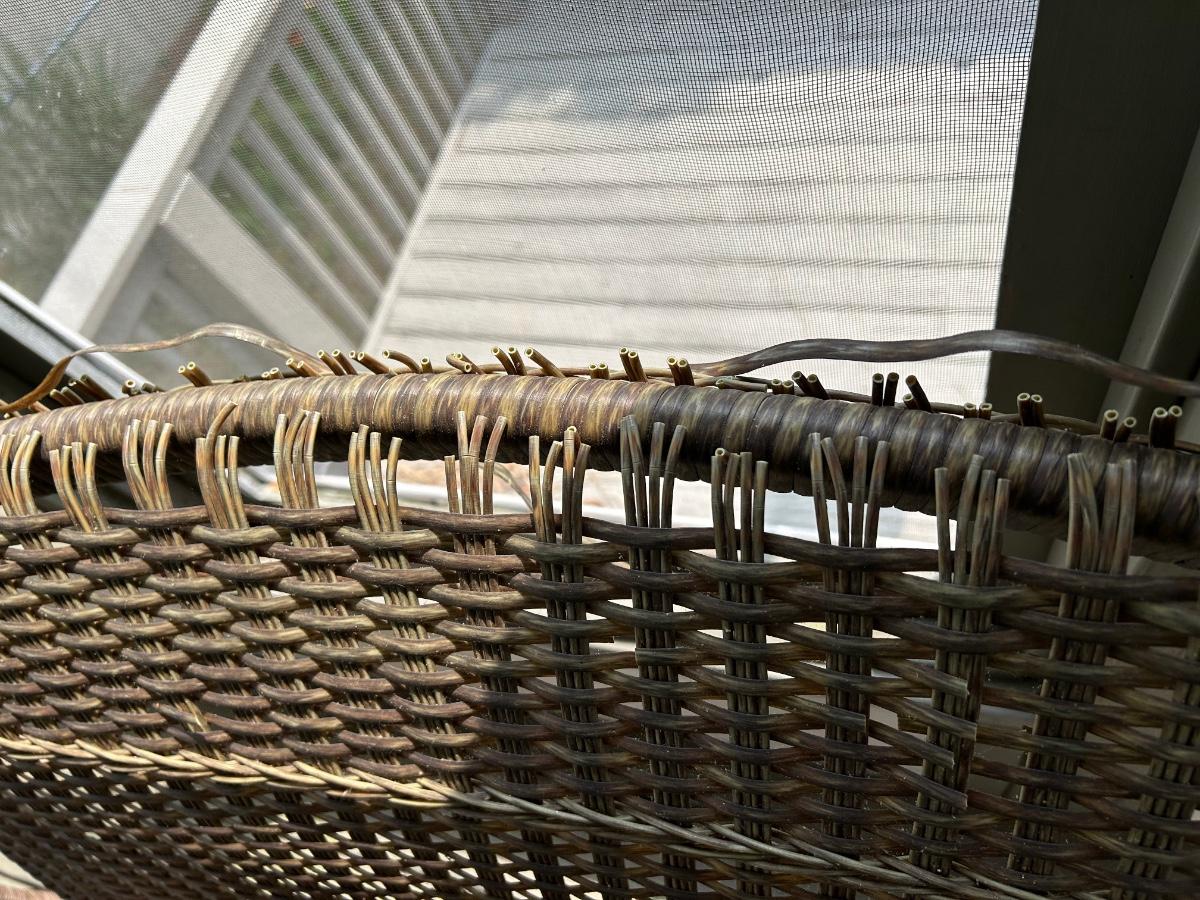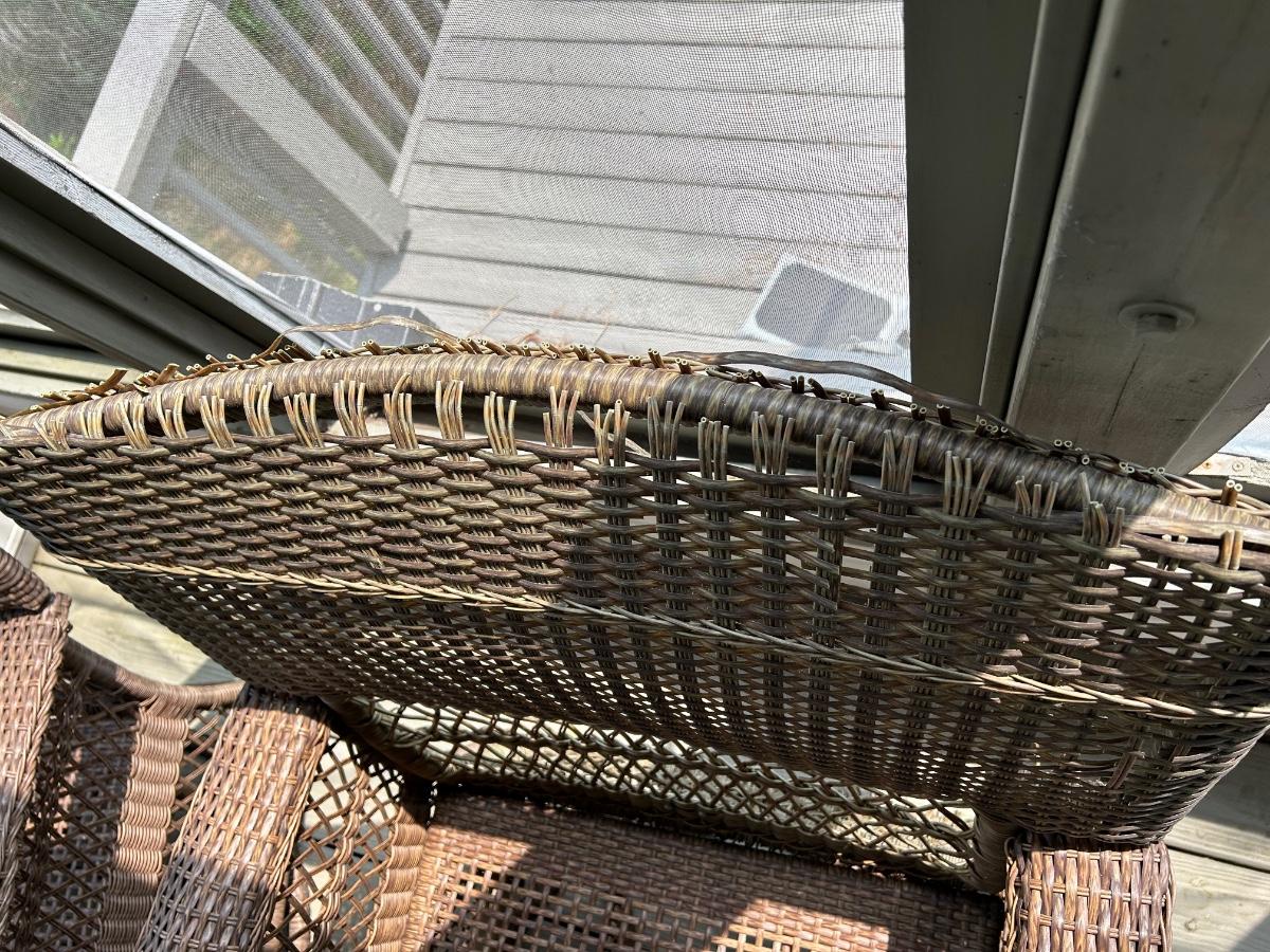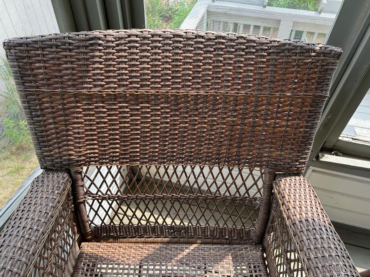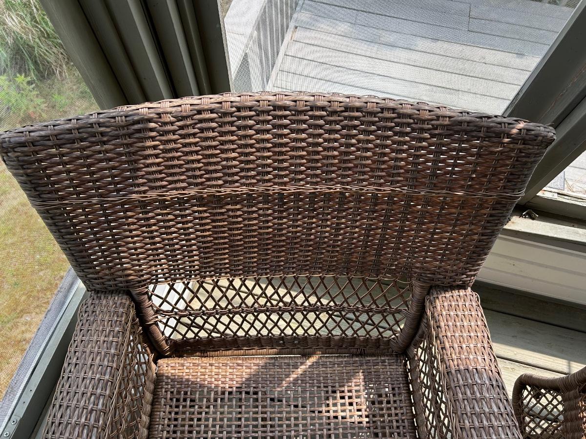Two plastic wicker swivel chairs. One chair is in good used condition, one chair shows wear from use. Photos show plastic starting to unravel on back of chair. Lot includes cushions. Chairs measure 31”x 35”.
