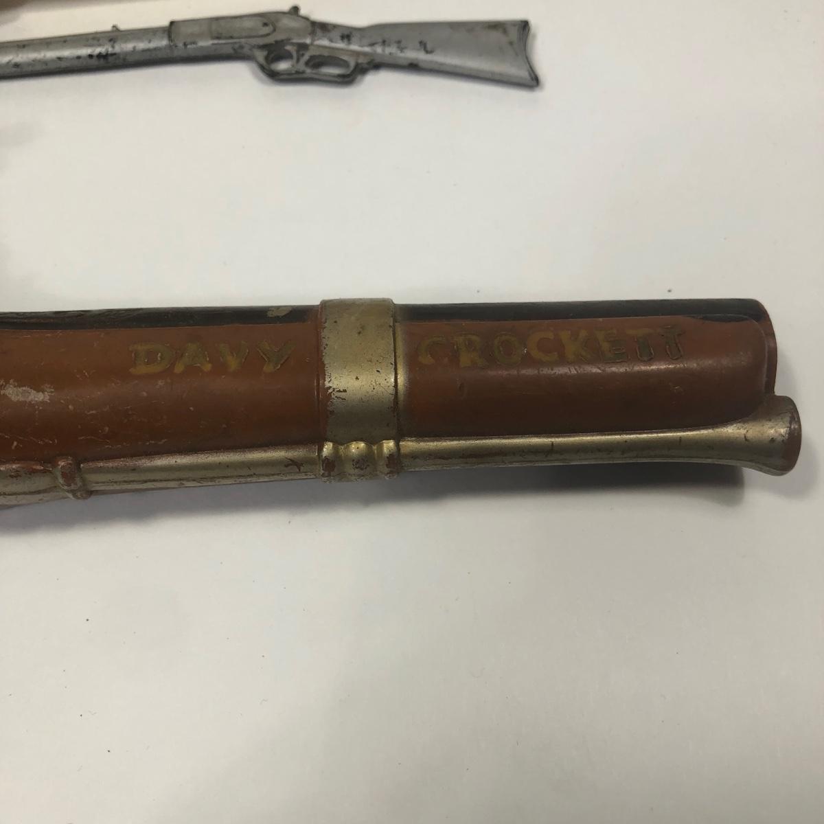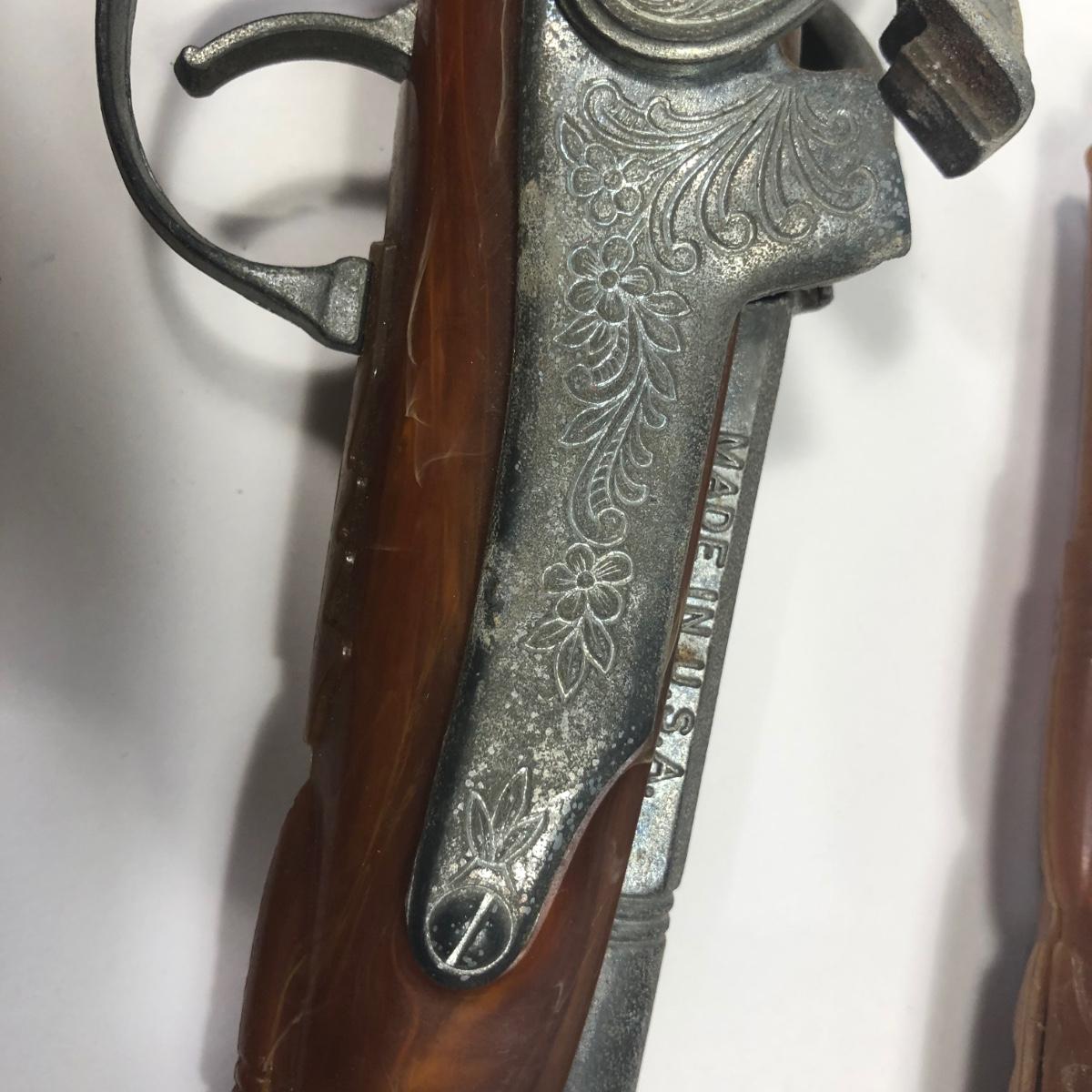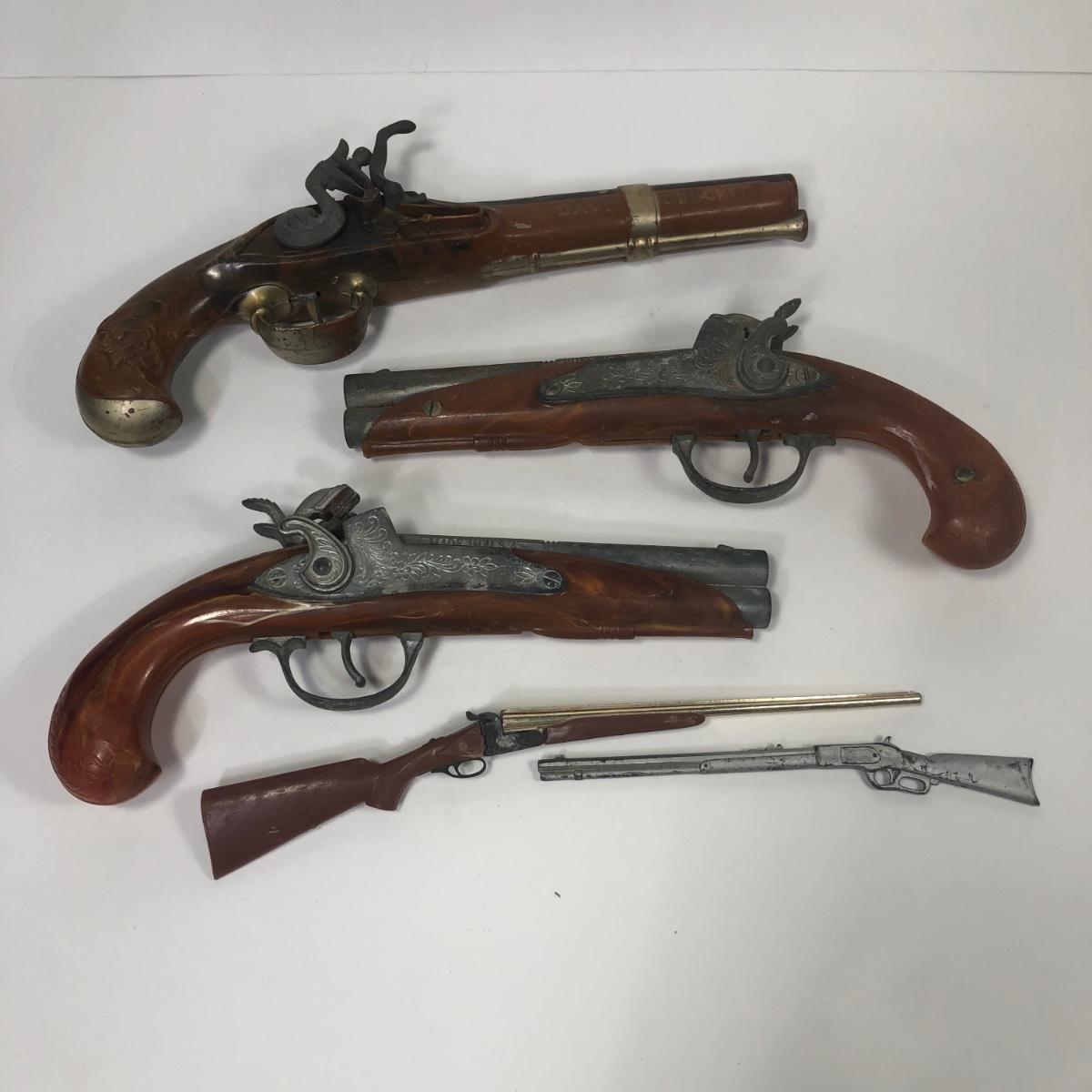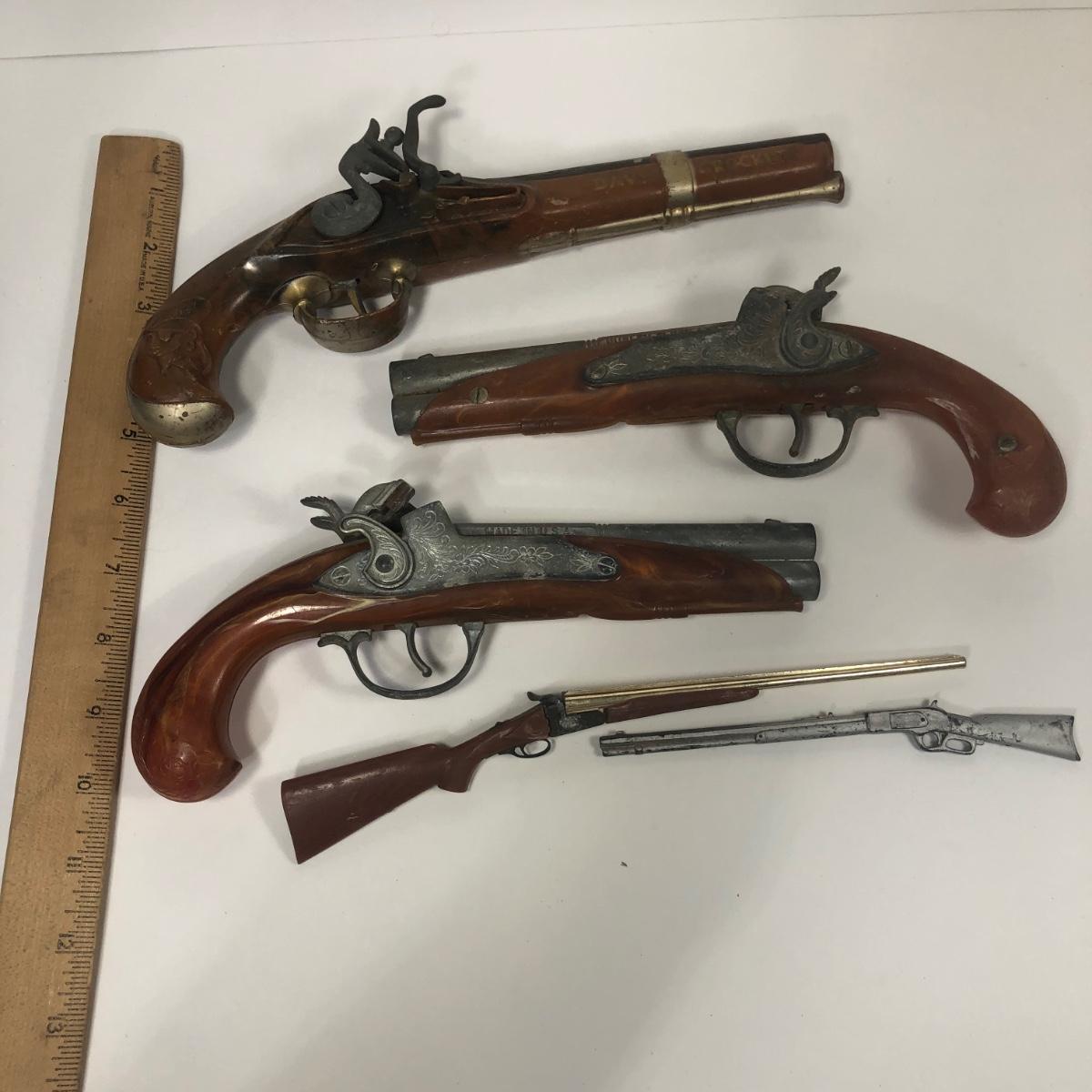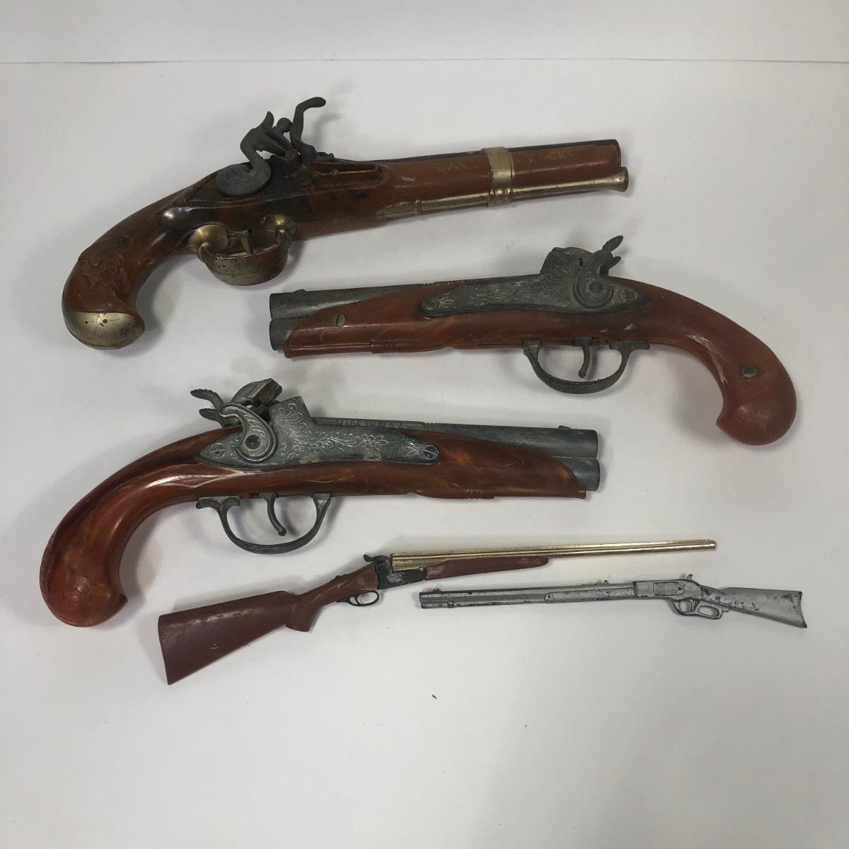 LOT 113: Two 1950s Hubley Flintlock Pistol Cap Guns, Davy Crockett Plastic Pistol Toy & More