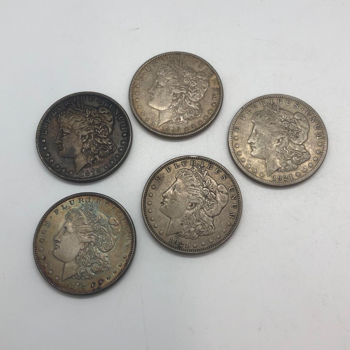 LOT 119: Silver Morgan Dollars - 1878P (2), 1885P, 1921S & 1921D