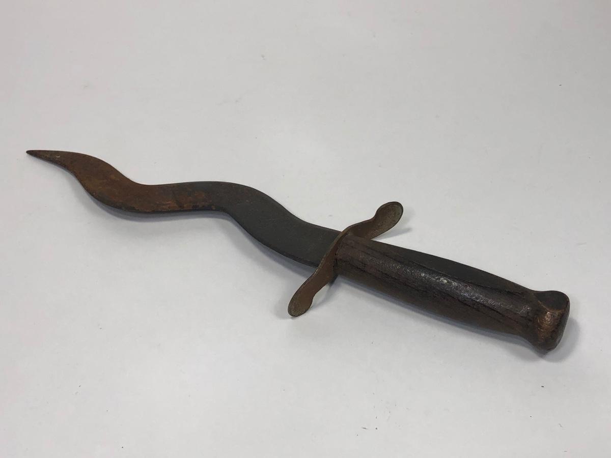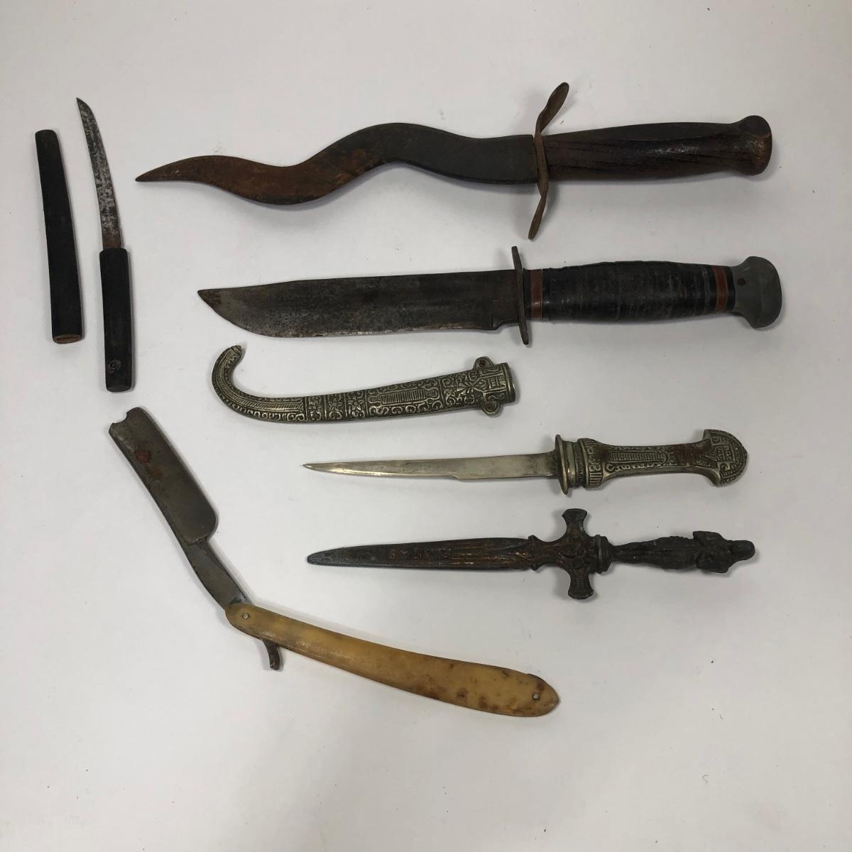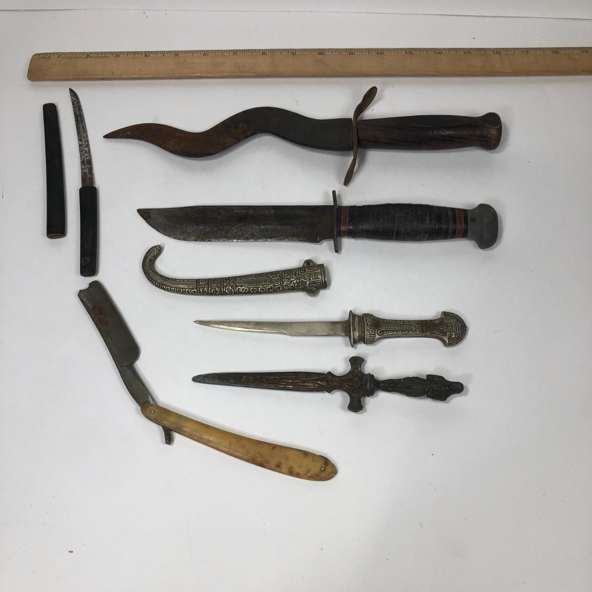 LOT 137: Korium Japan Curved Dagger, Knife w/ Curved Sheath marked ITALY, Knife w/ Wooden Handle/Sheath, Faux Knife marked Remis 45 & More