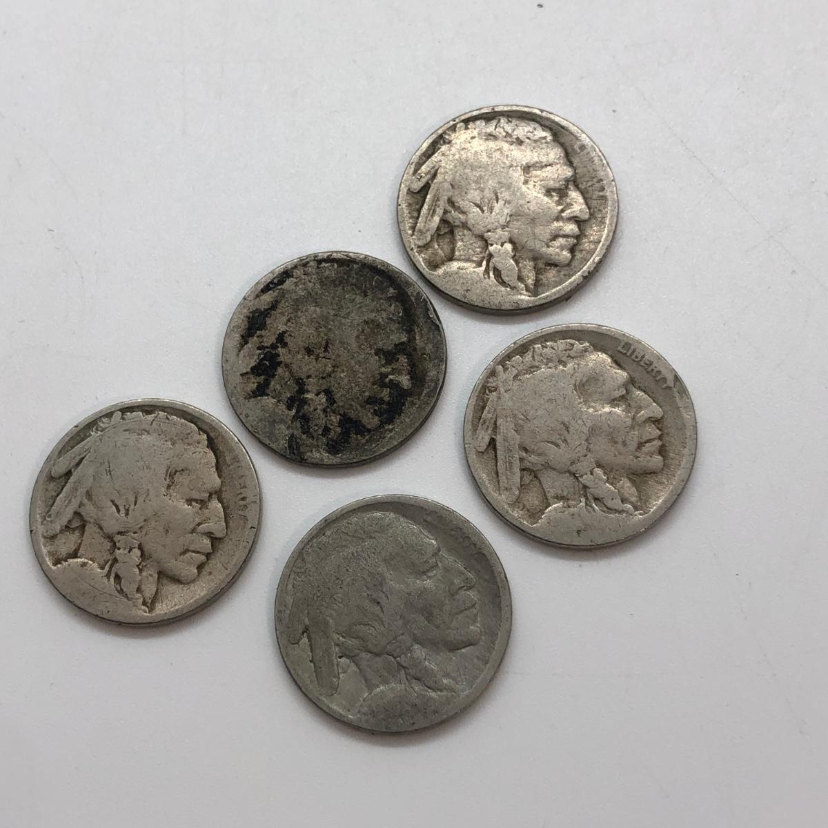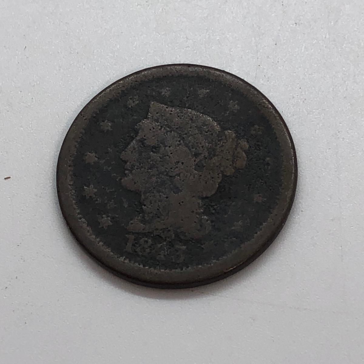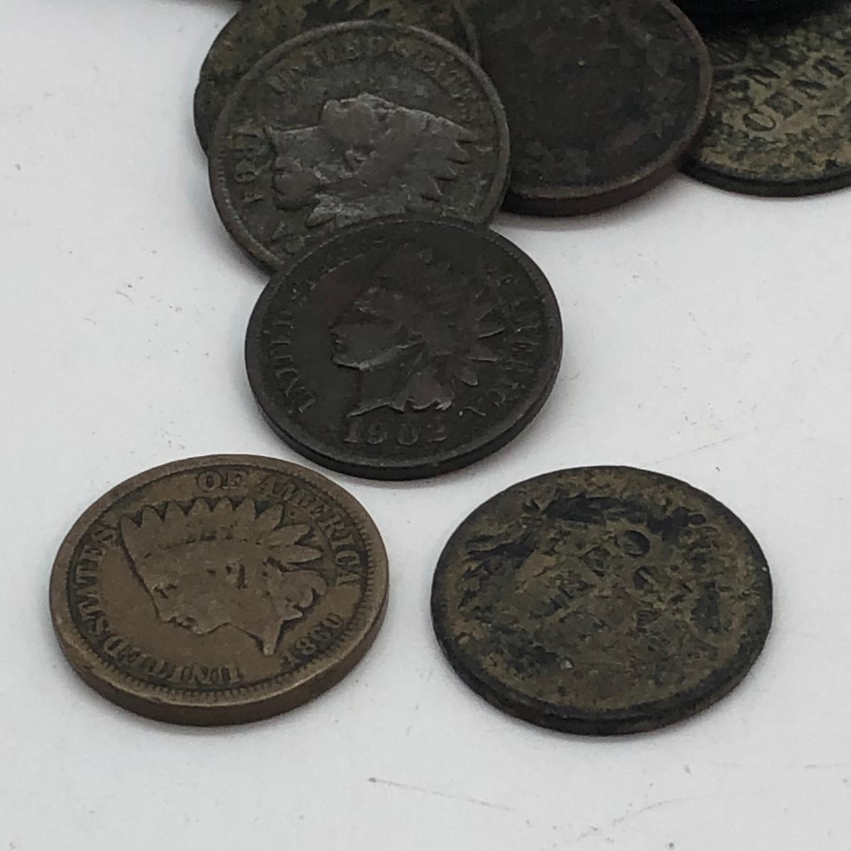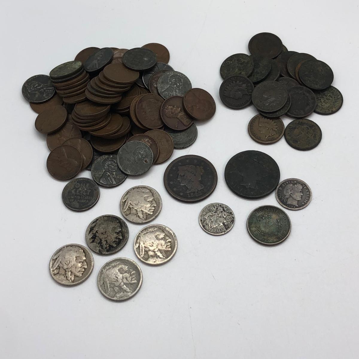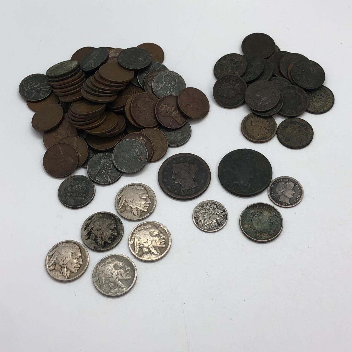 LOT 142: Antique/Vintage US Coins - 1843 Larger Cent Coins (2), 1899 Barber Dime, 3-Cent Nickel (unreadable), 1902 Liberty, Indian Head Wheat  Pennies, Buffalo Nickels