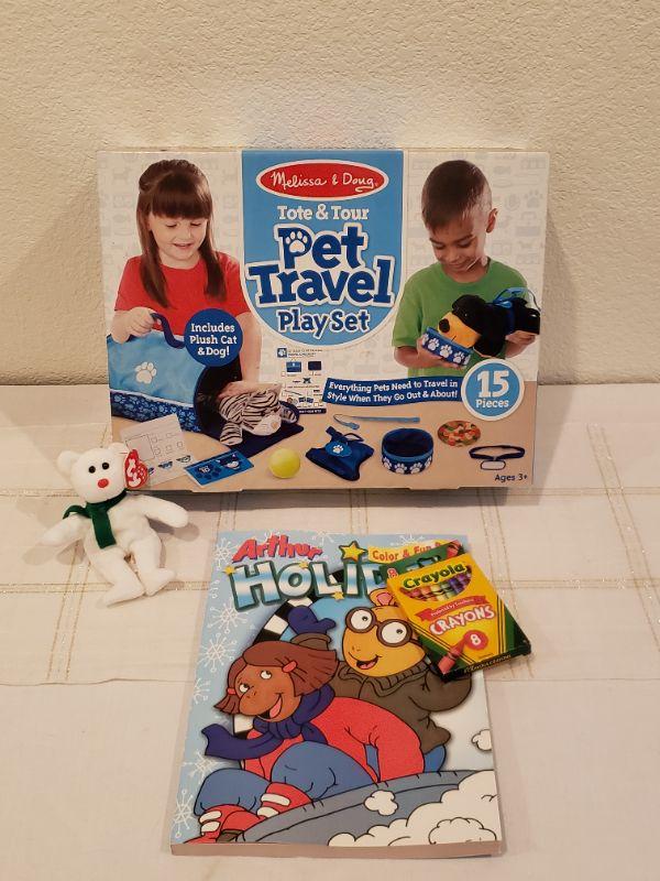 Lot 898: NEW Melissa & Doug Pet Travel Play Set, Coloring Book & Crayons and Ty Beanie Baby Ornament