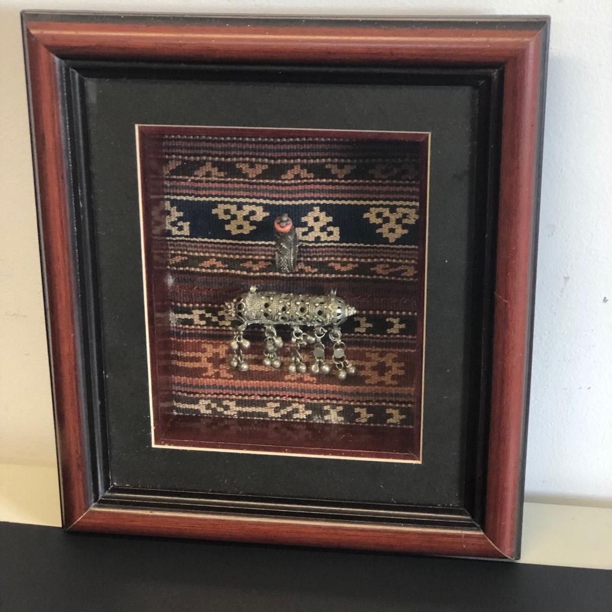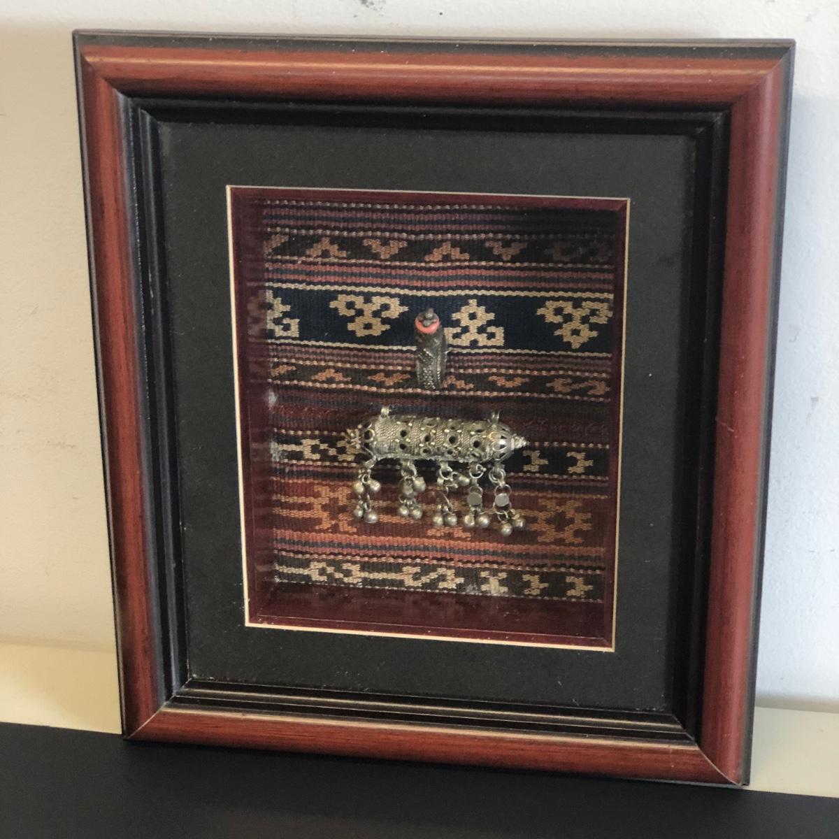 Probably from Yemen or surrounding area, sold in Saudi Arabia as a souvenir. Frame measures 12 x 13.5.