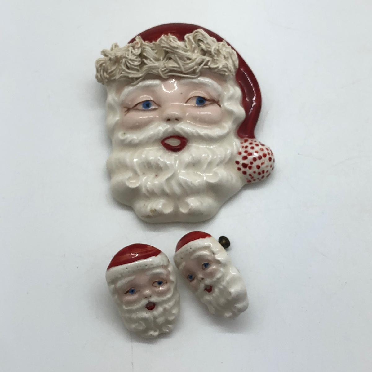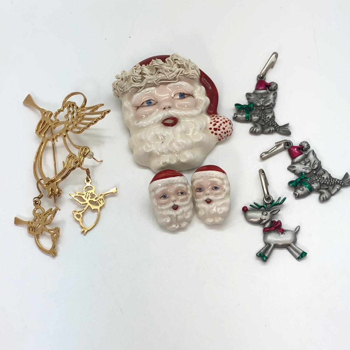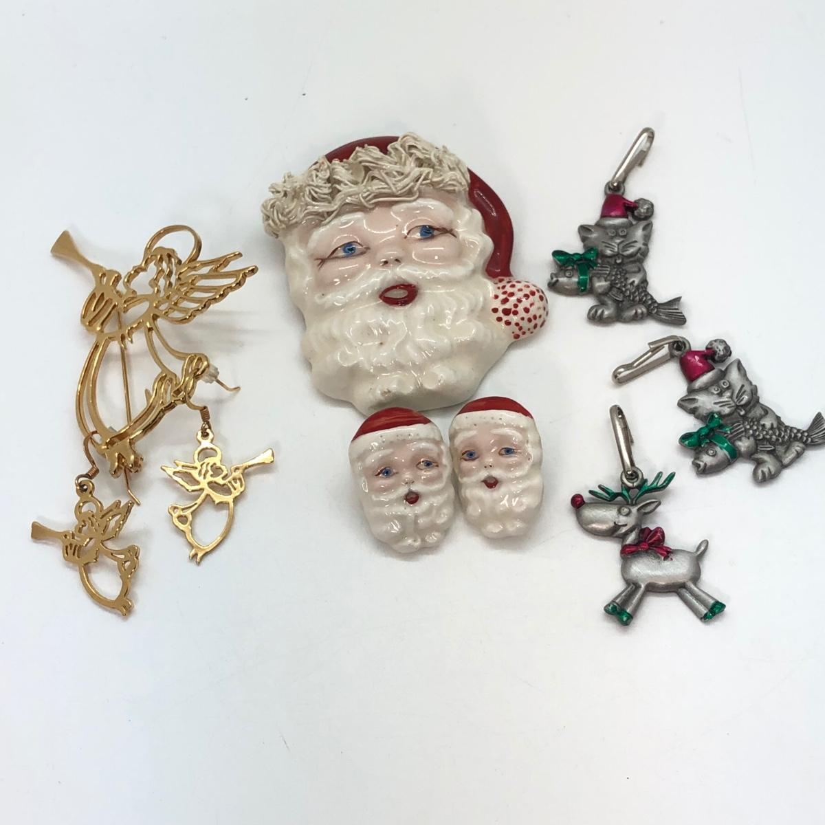LOT 27: Vintage Handmade "Holland Mold" Santa Claus Brooch & Screwback Earrings, JJ Pewter Charms, & Goldtone Angel Brooch w/ Matching Pierced Earrings