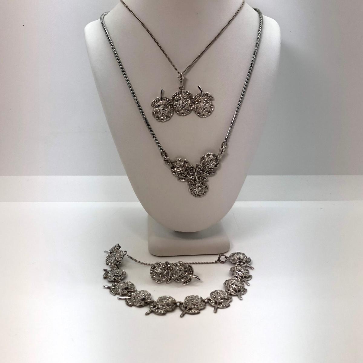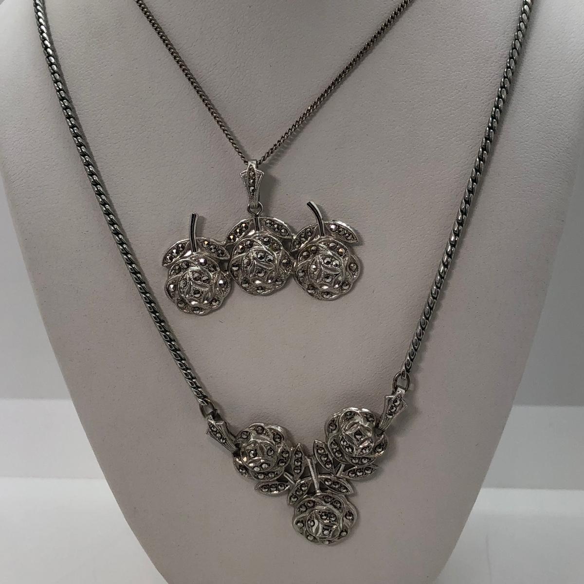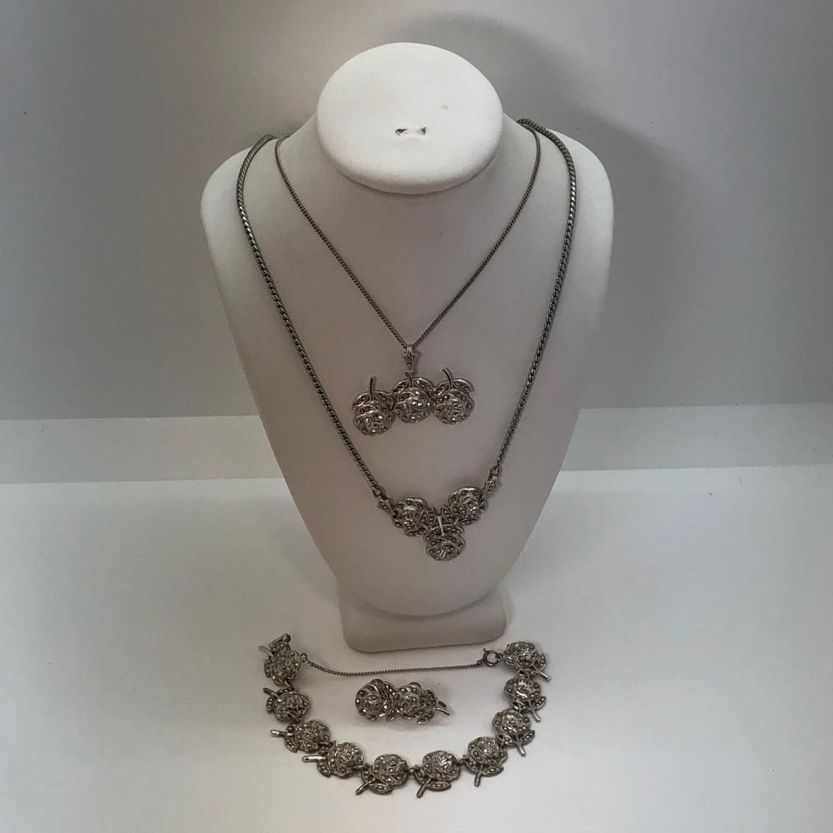 LOT 30: Sterling Silver Rose Jewelry - 14" Necklace, 16" Necklace, Bracelet w/ Safety Chain & Screwback Earrings