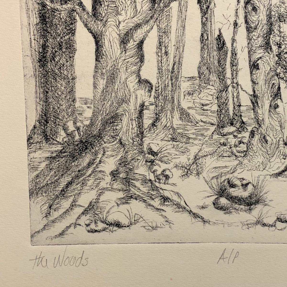 "Woman" measures 12 x 15 inches and "The Woods" measures 16 x 14 inches.