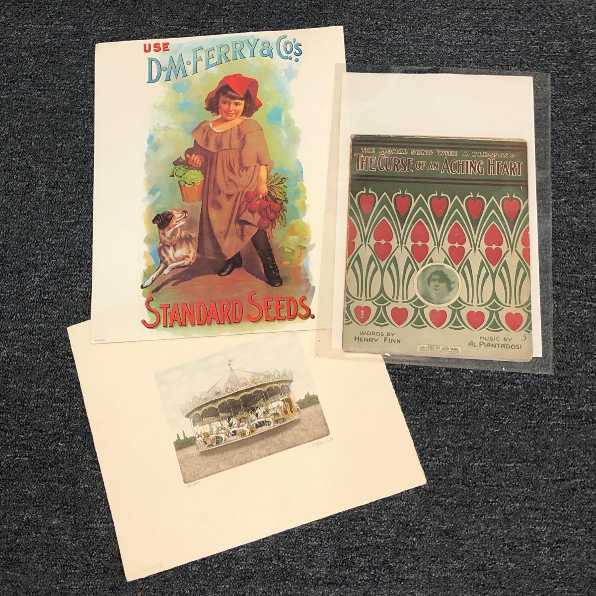LOT 47: D.M. Ferry & Co's Standard Seeds Poster, 1999 Carousel Drawing by B. Haur Signed & Numbered, Curse of an Aching Heart Sheet Music Book