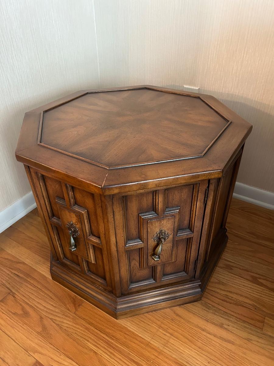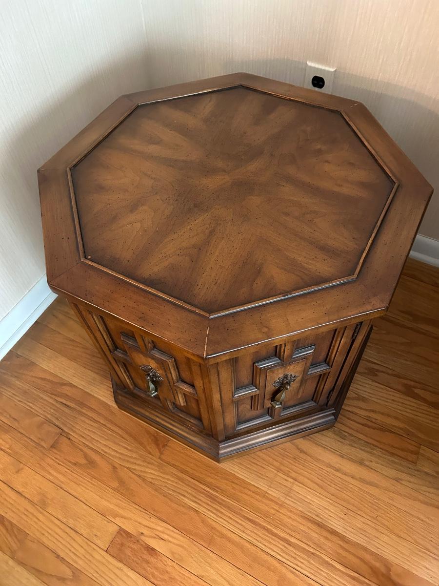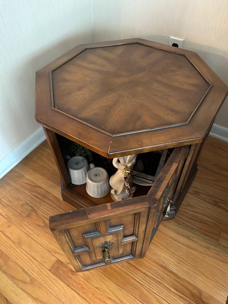 26”x20” Wood Octagon shaped end table with cabinet storage. Items in cabinet are not included in lot.