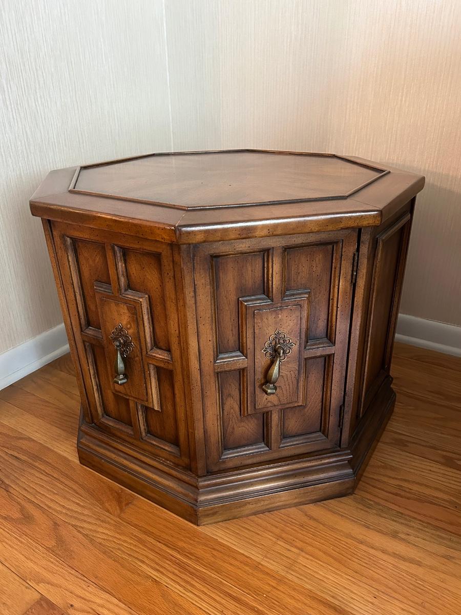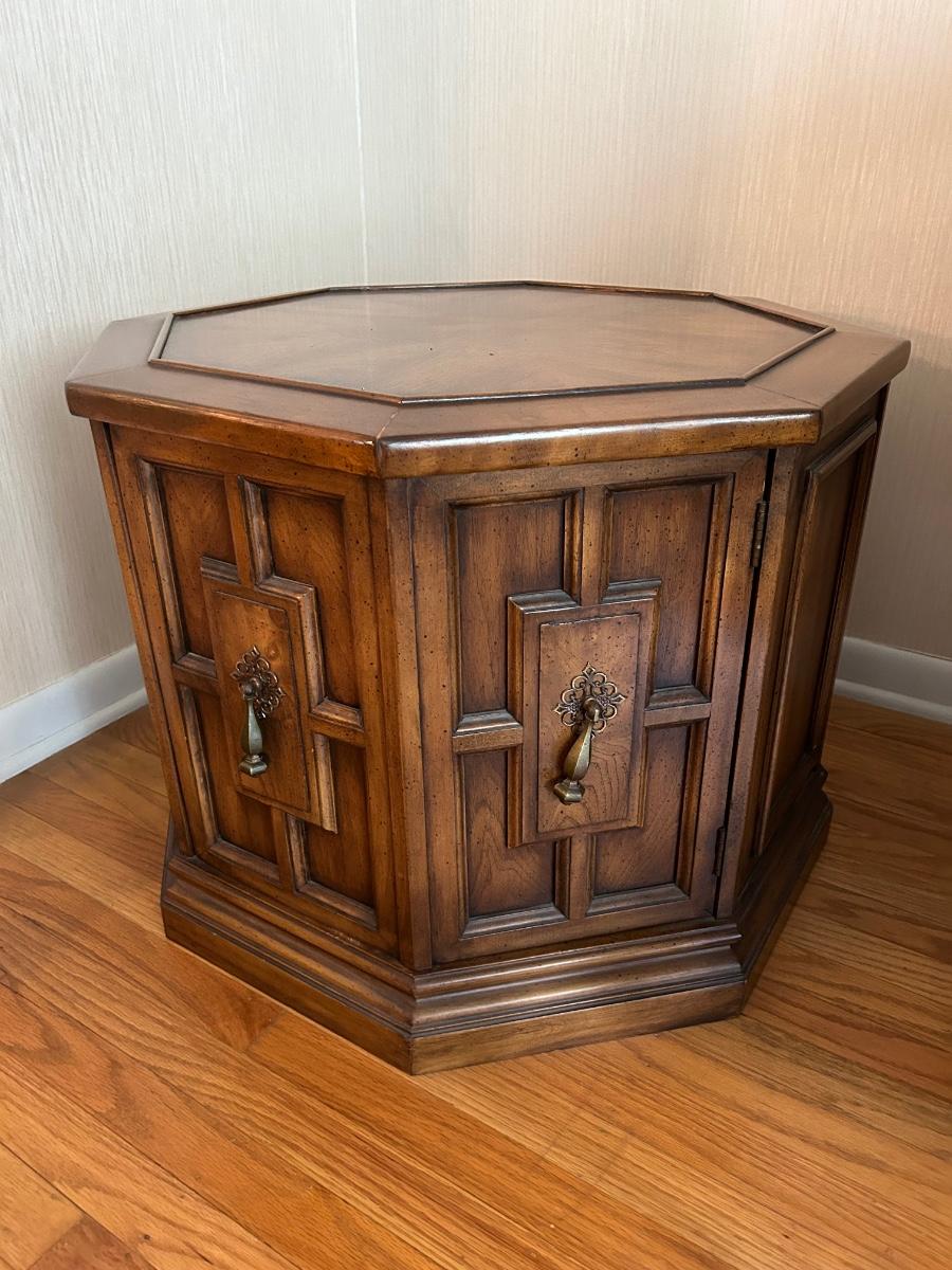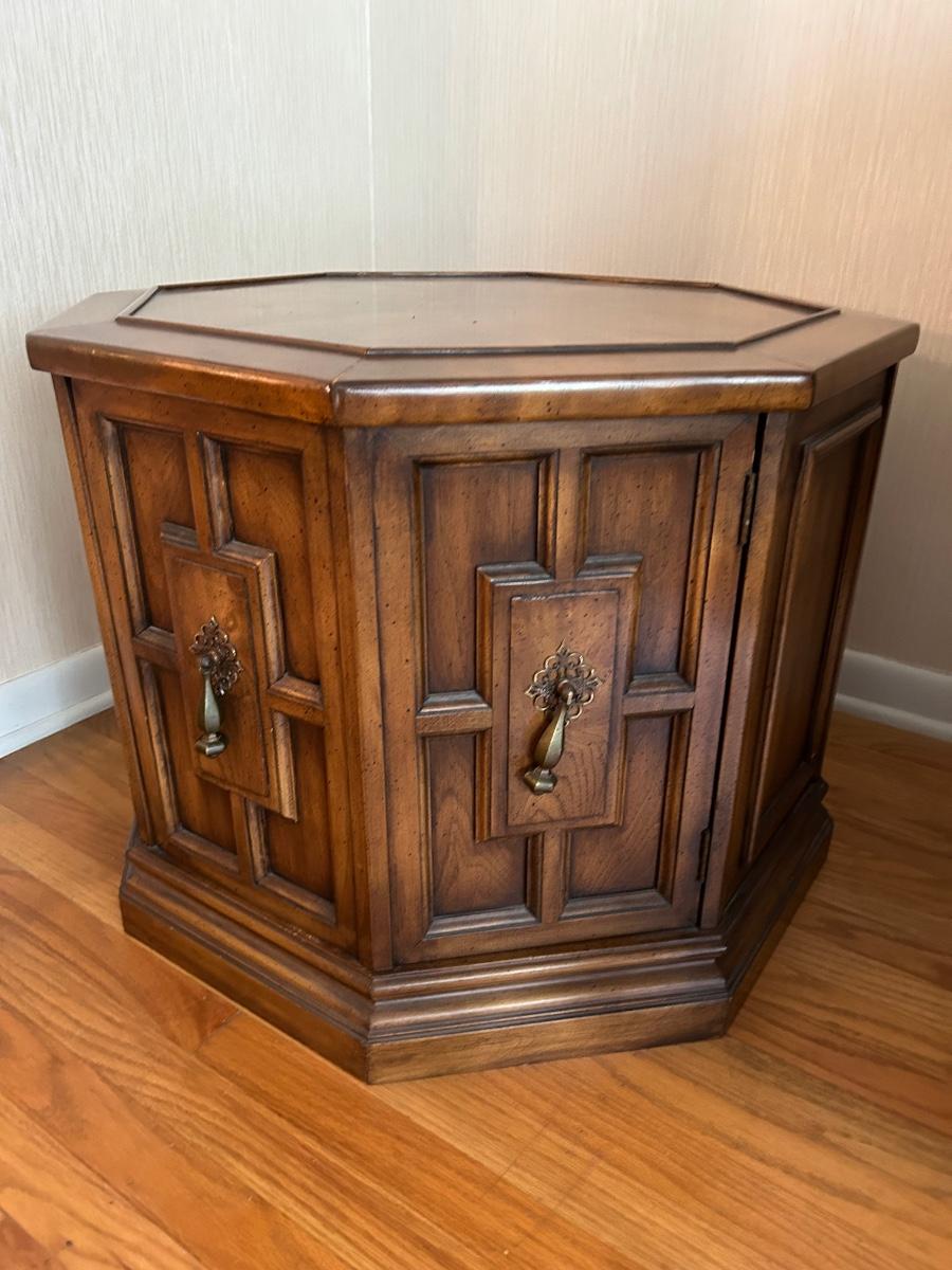 26”x20” Wood Octagon shaped end table with cabinet storage. Items in cabinet are not included in lot.