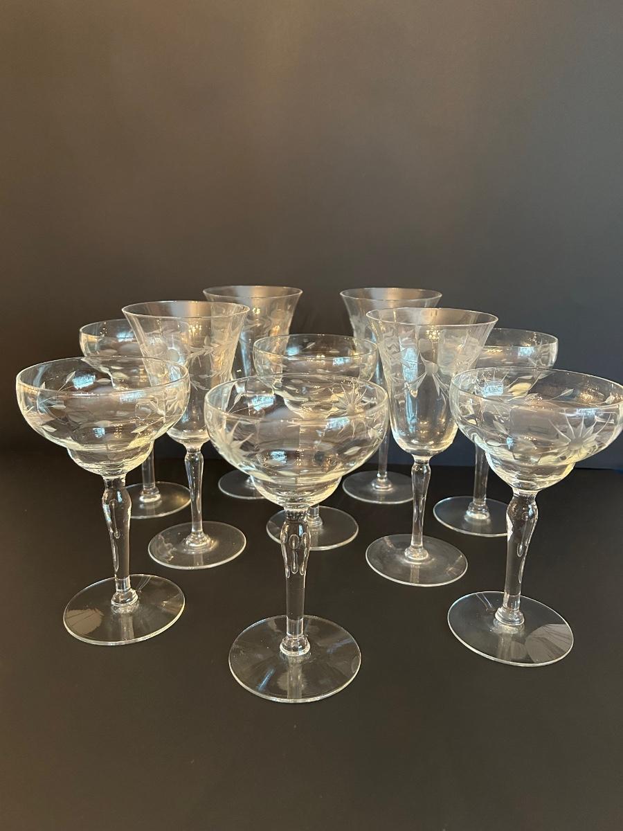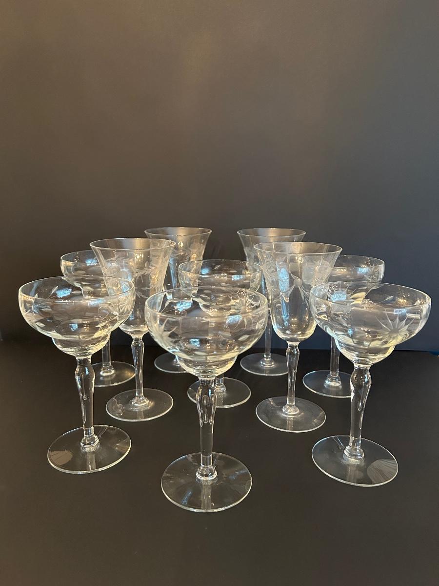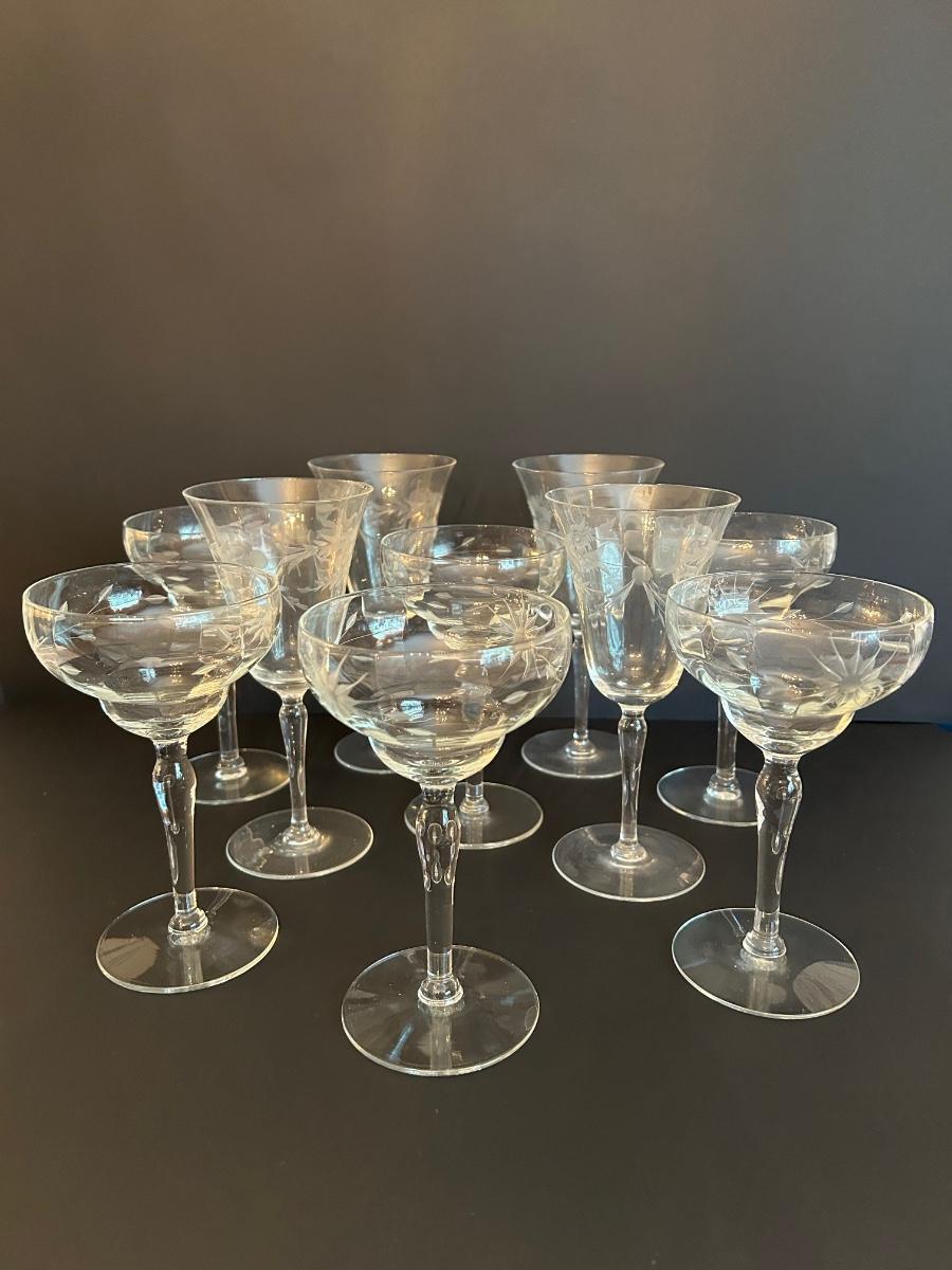 Clear etched glasses. Two sizes, set of 10.