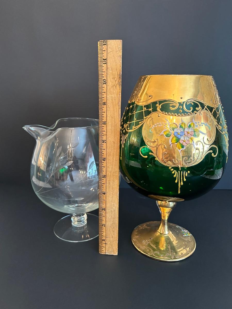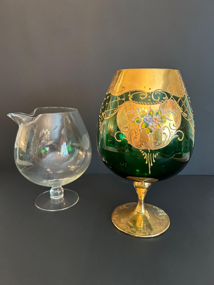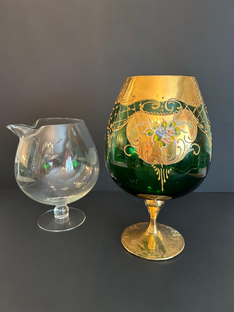 Vintage green and gold hand painted glass. Clear etched glass pitcher.