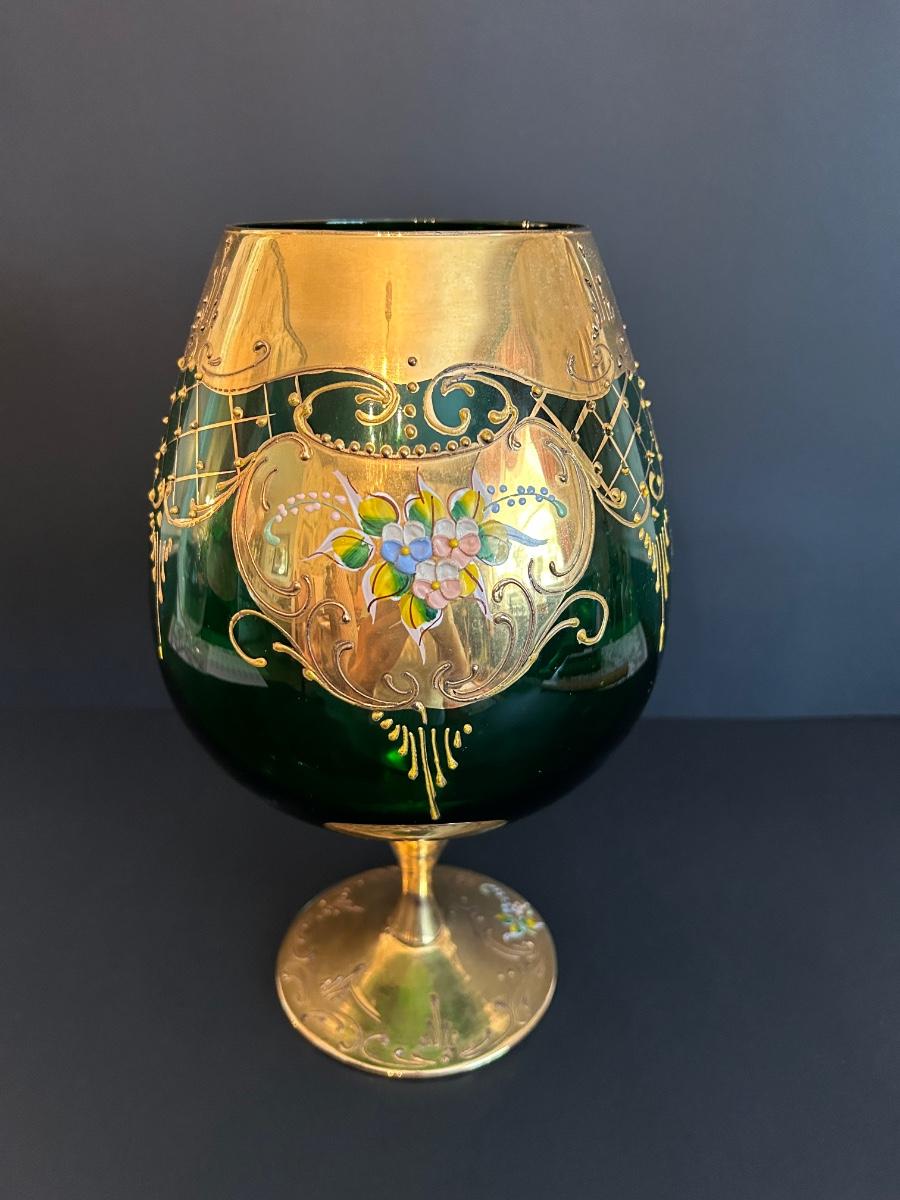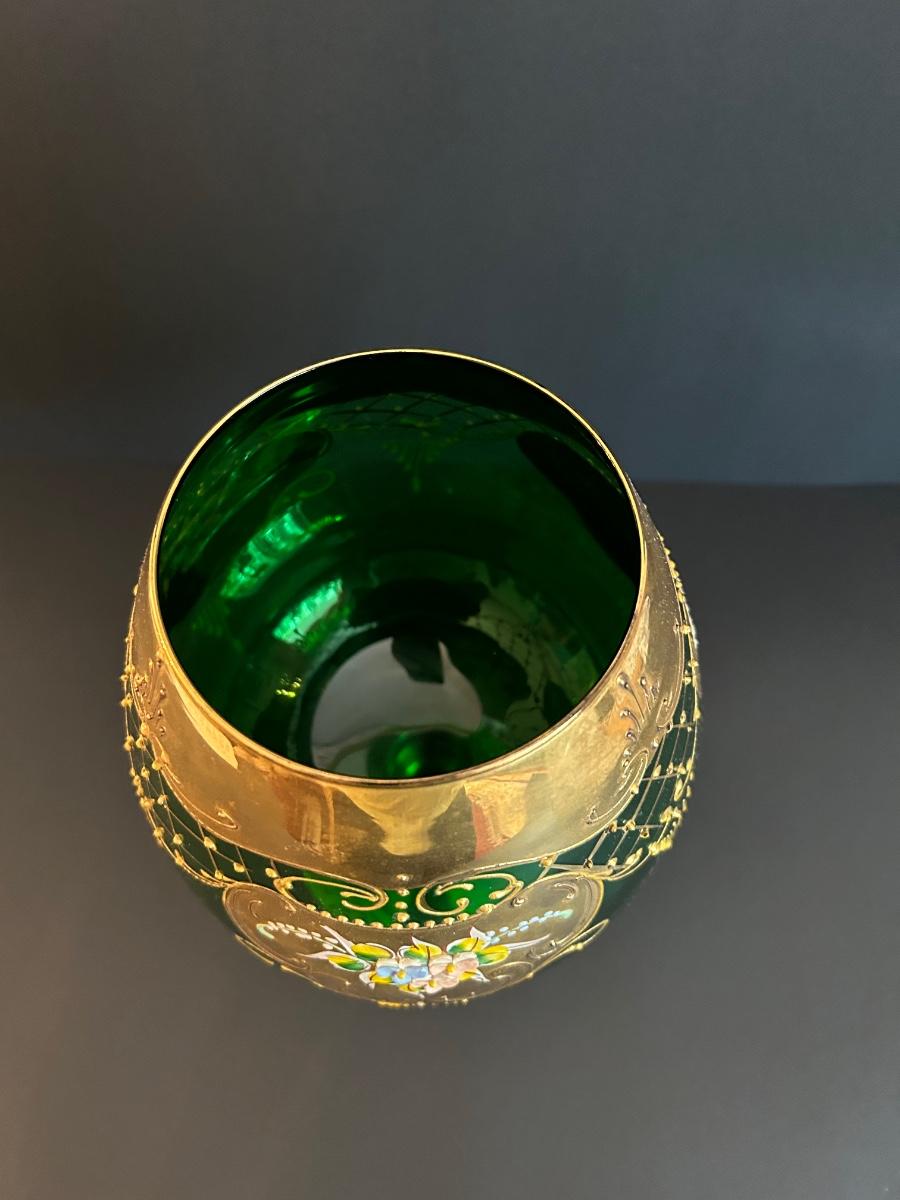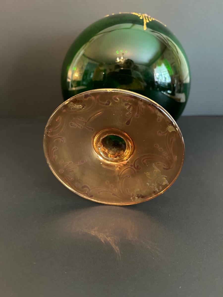 Vintage green and gold hand painted glass. Clear etched glass pitcher.