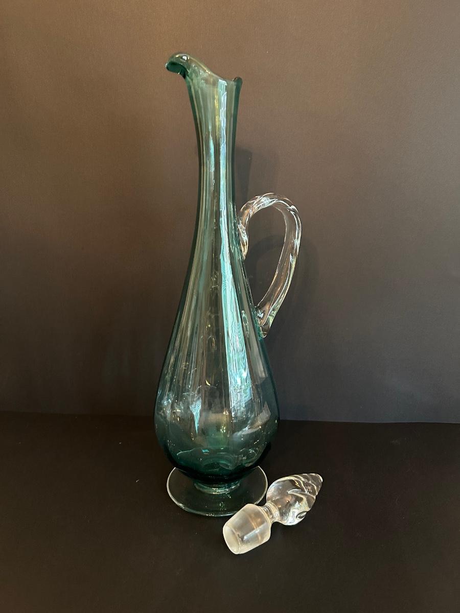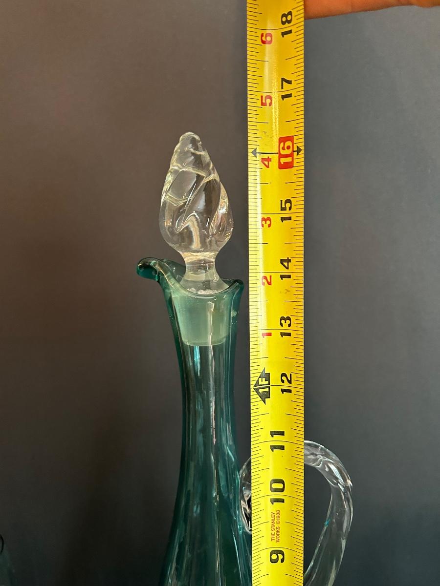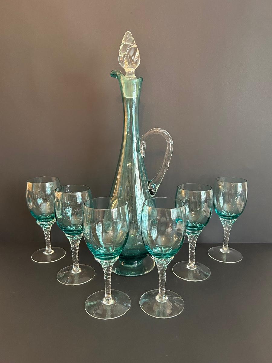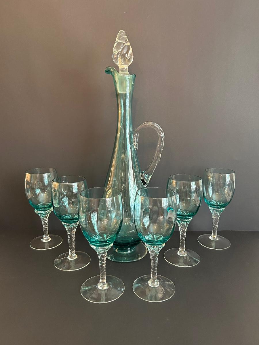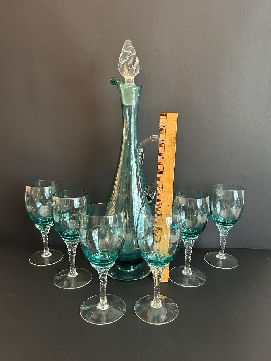 Tall green colored glass decanter and 6 matching glasses.