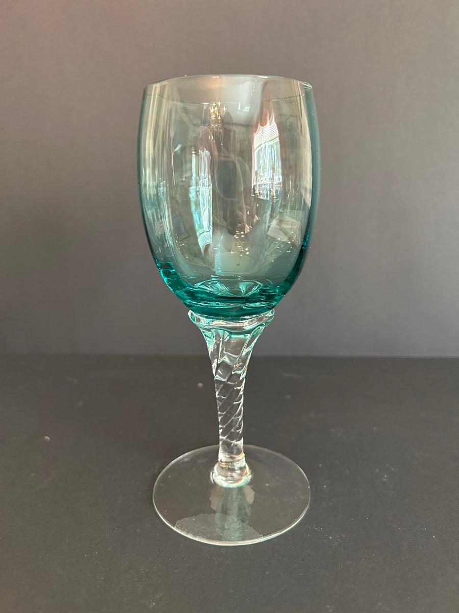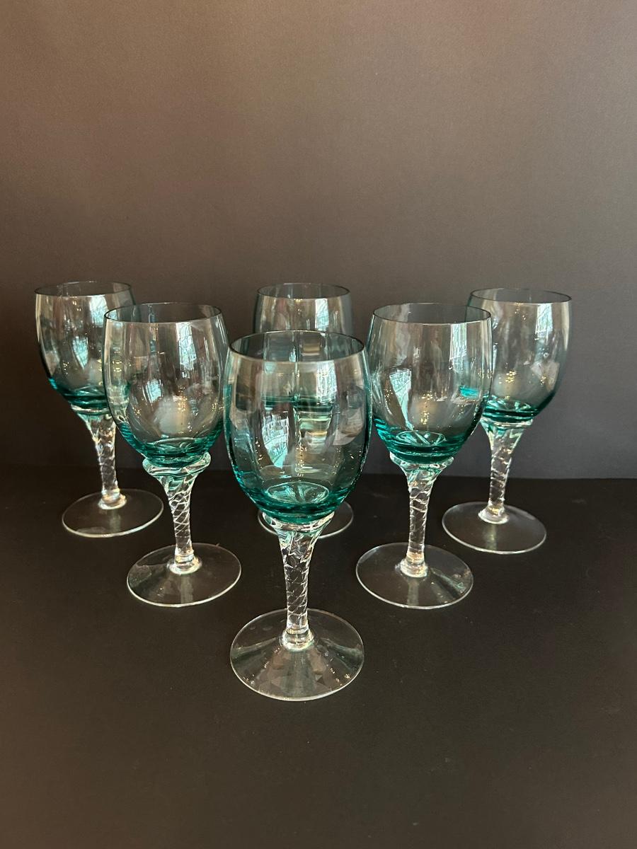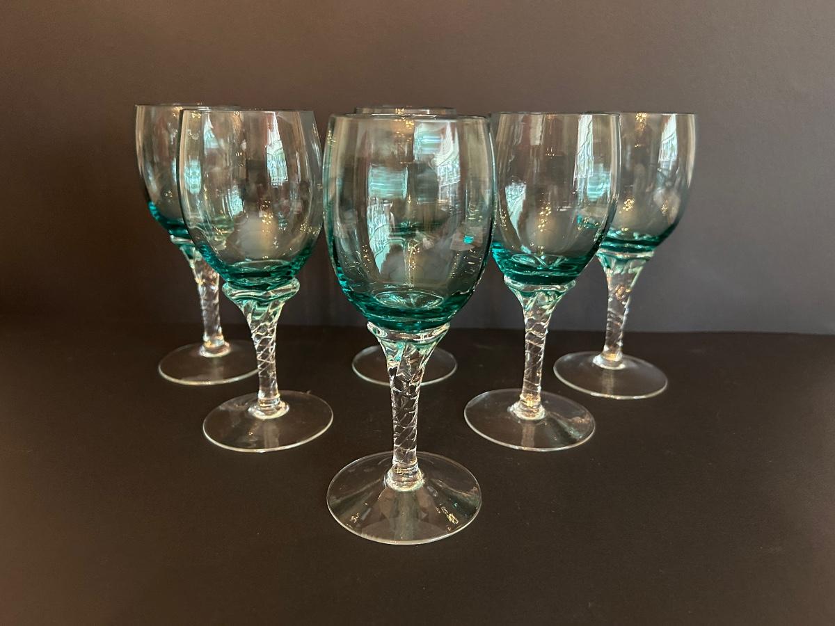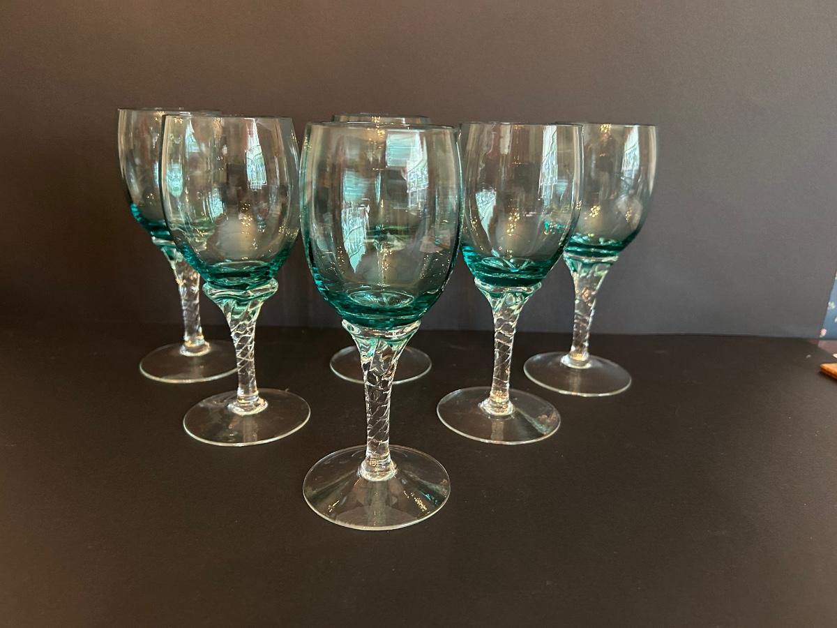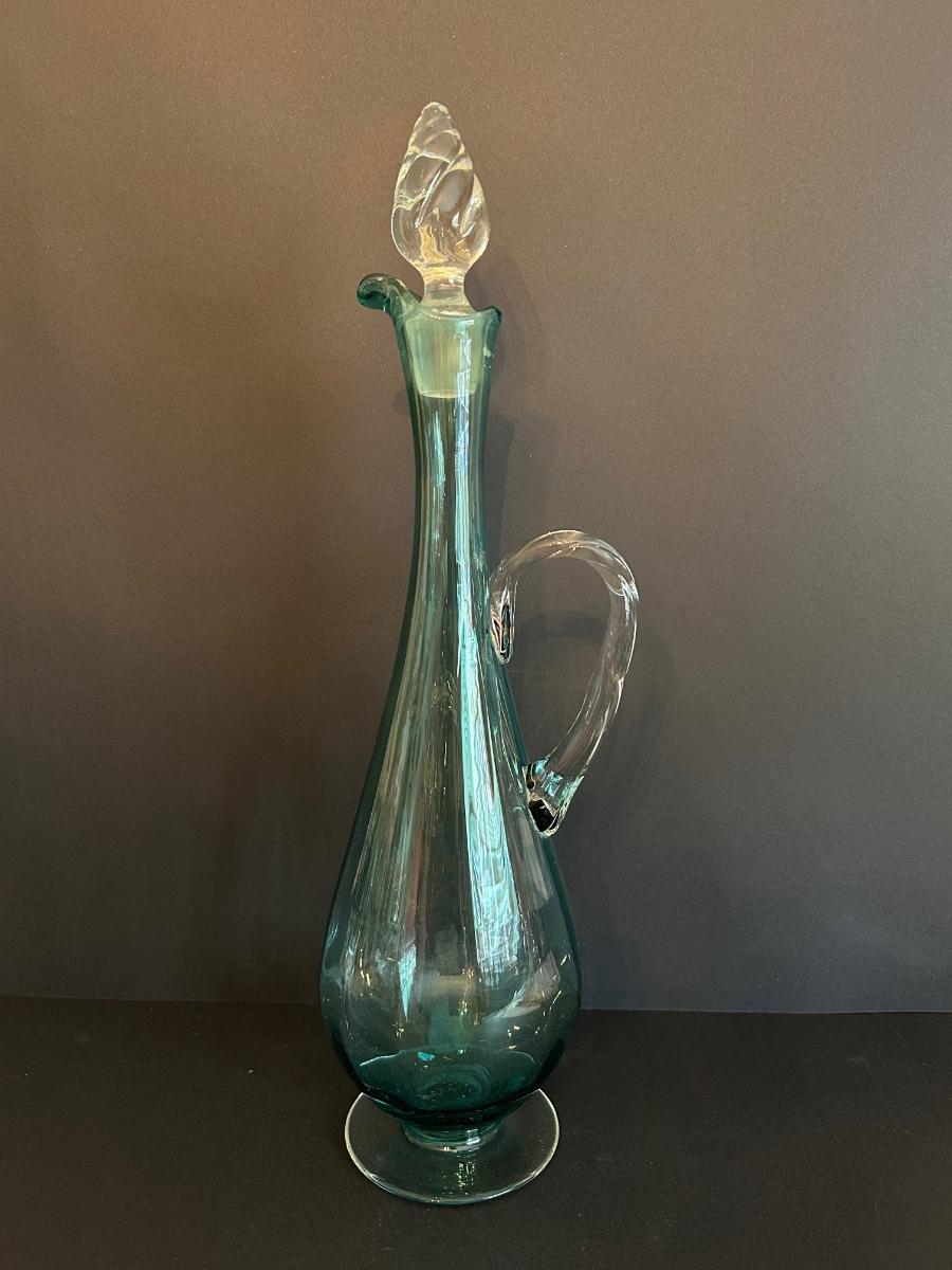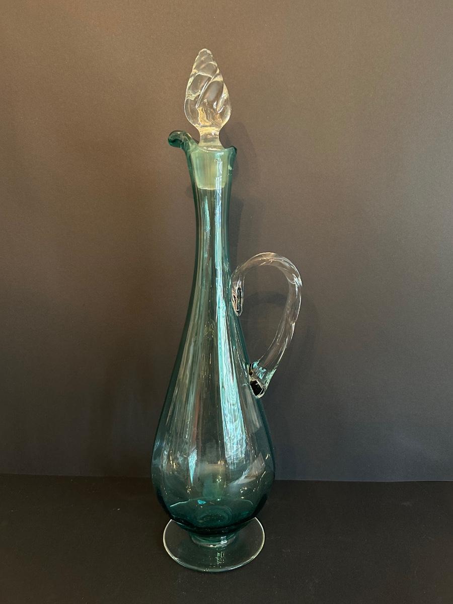 Tall green colored glass decanter and 6 matching glasses.