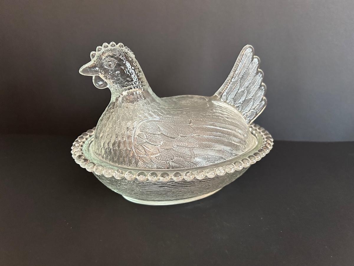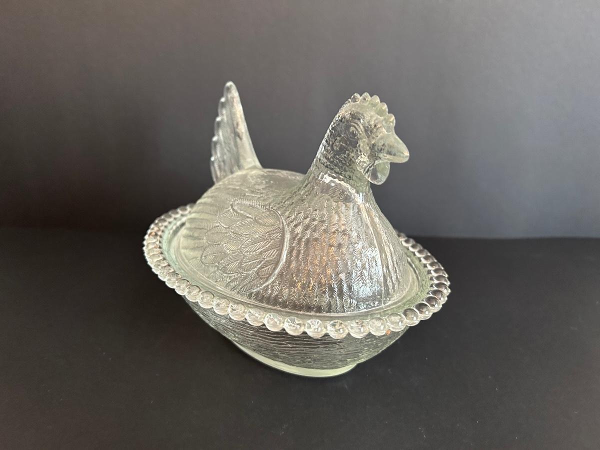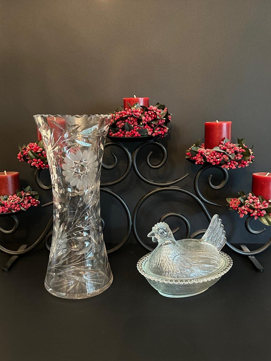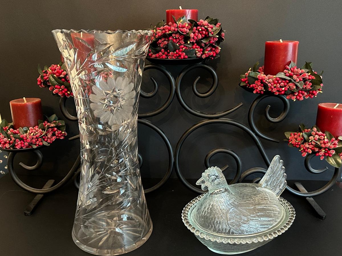 Home decor item’s including black iron candle holder, clear cut glass vase and rooster covered dish.