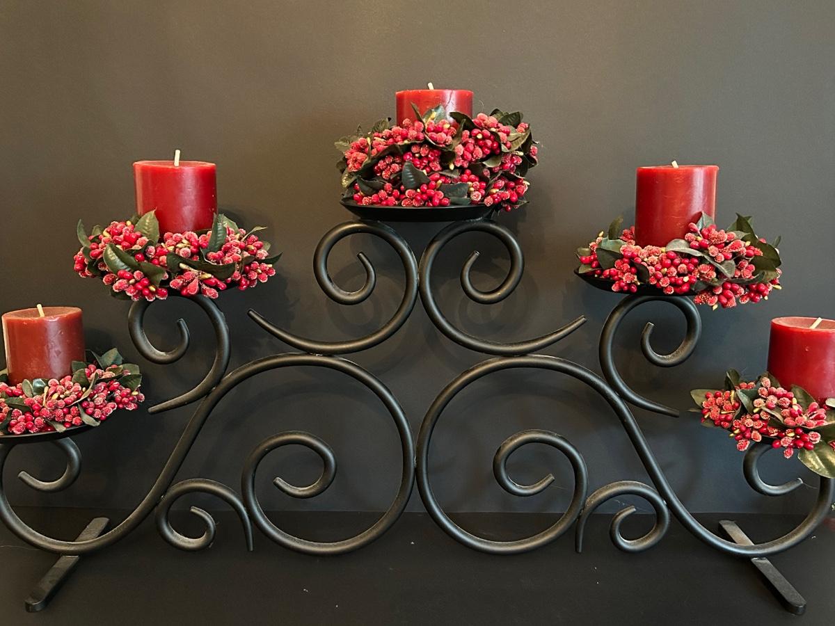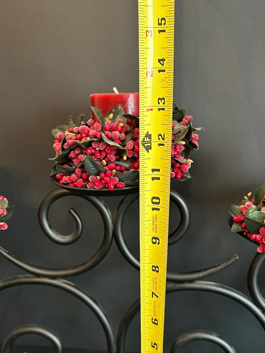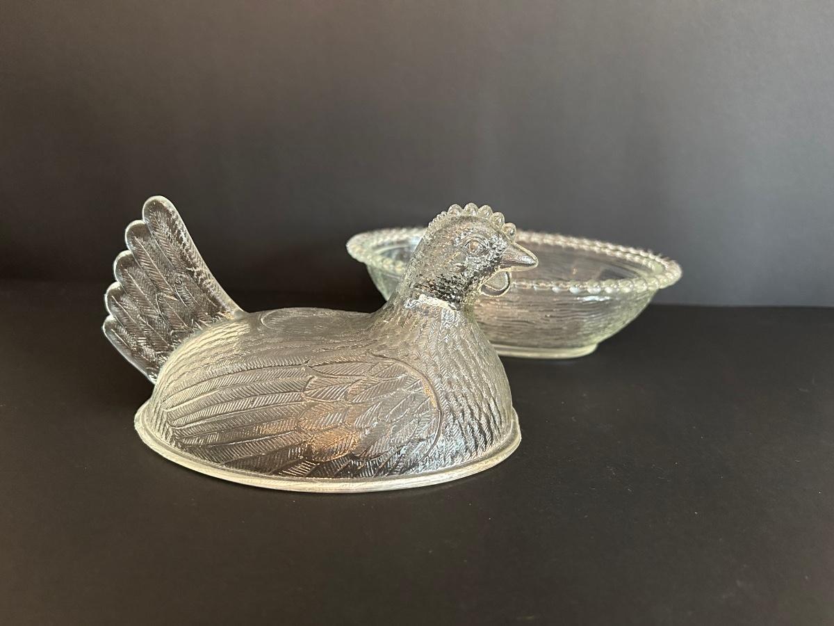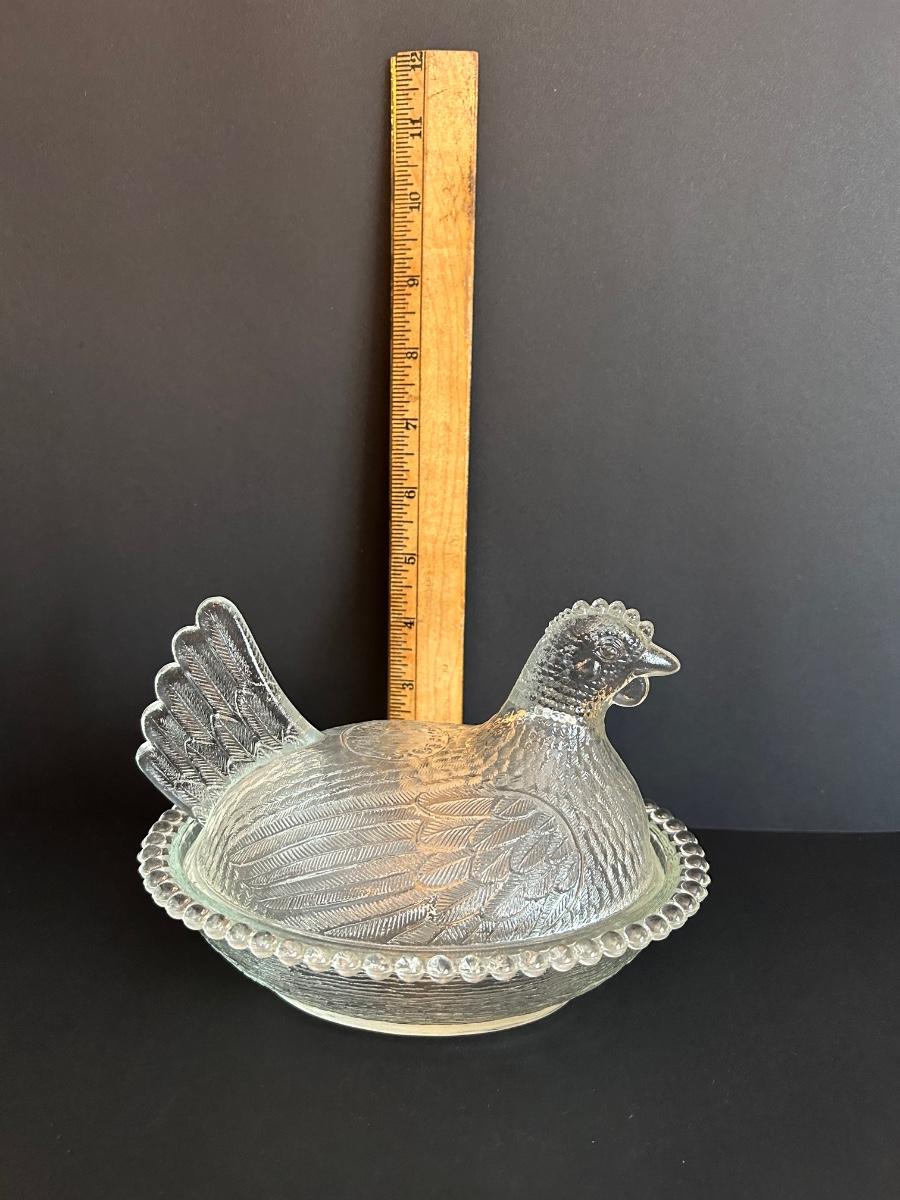 Home decor item’s including black iron candle holder, clear cut glass vase and rooster covered dish.