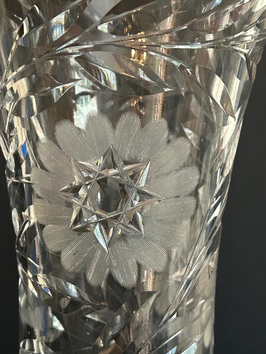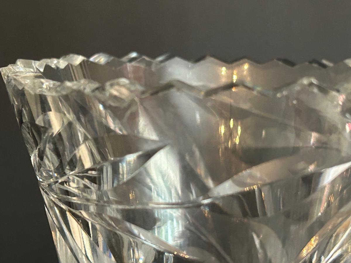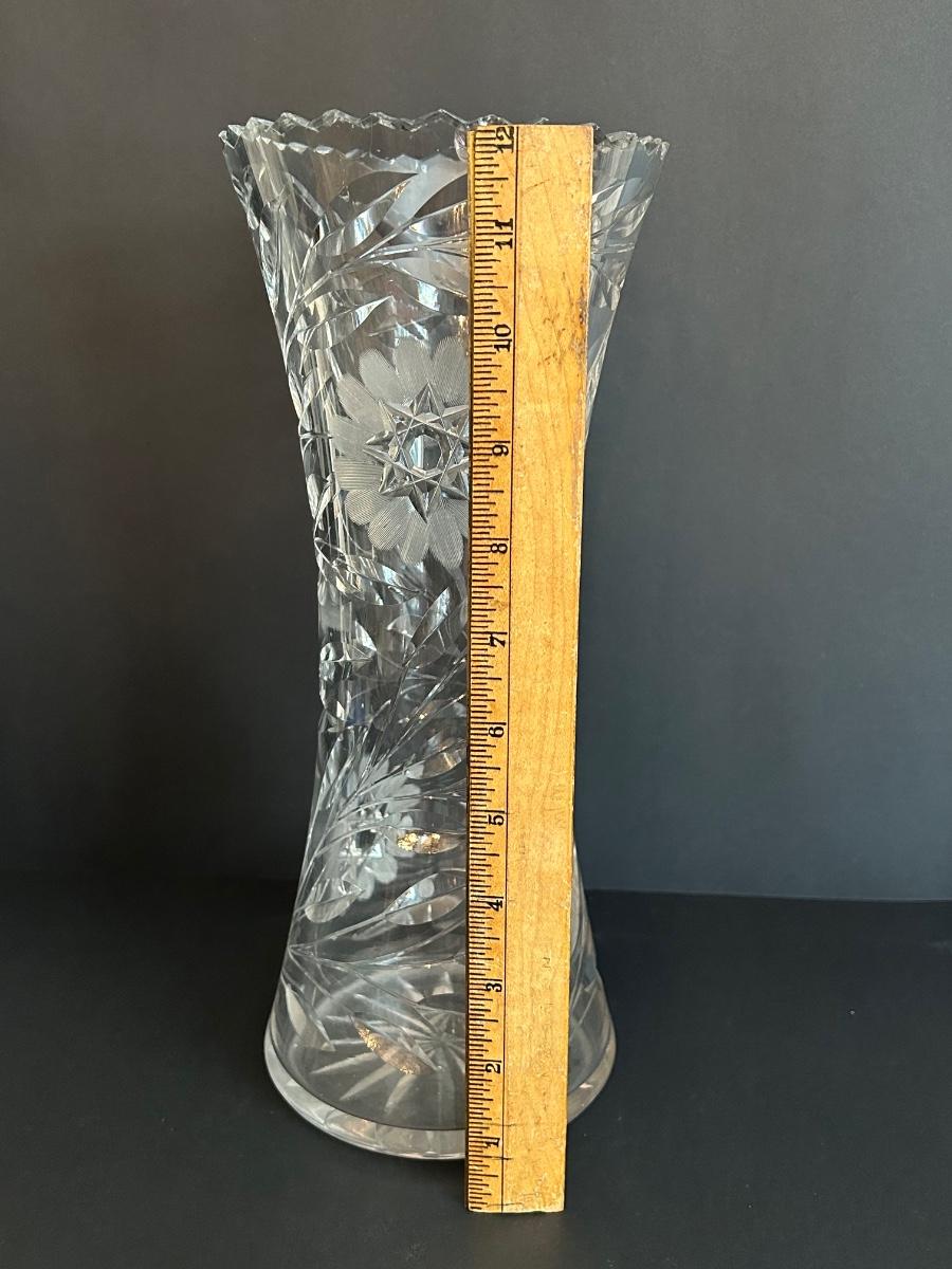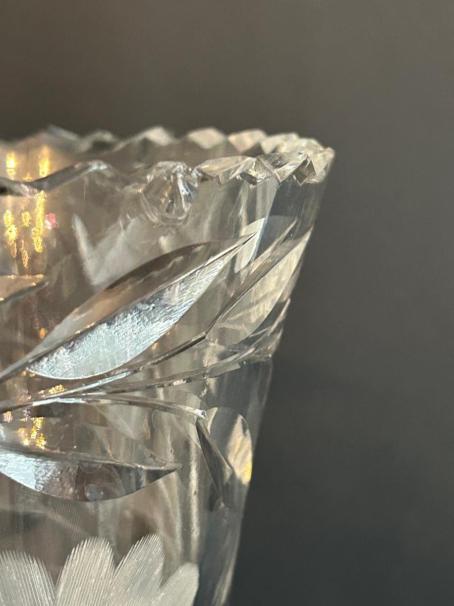 Home decor item’s including black iron candle holder, clear cut glass vase and rooster covered dish.